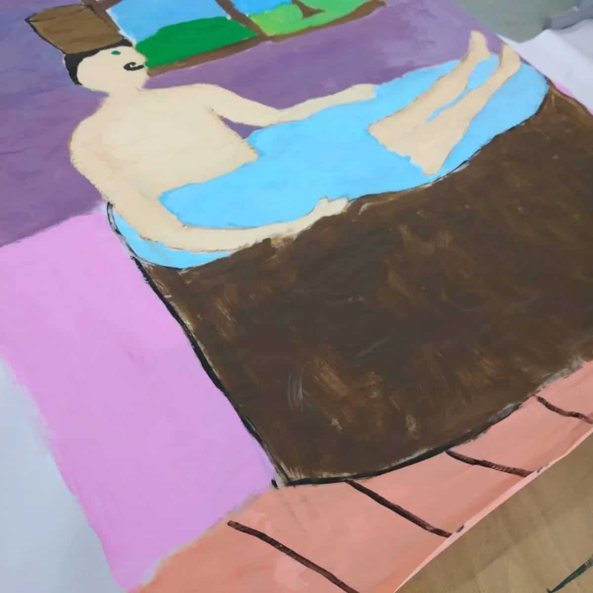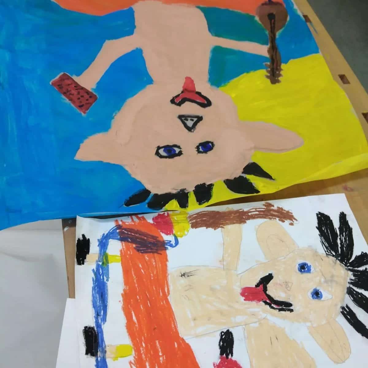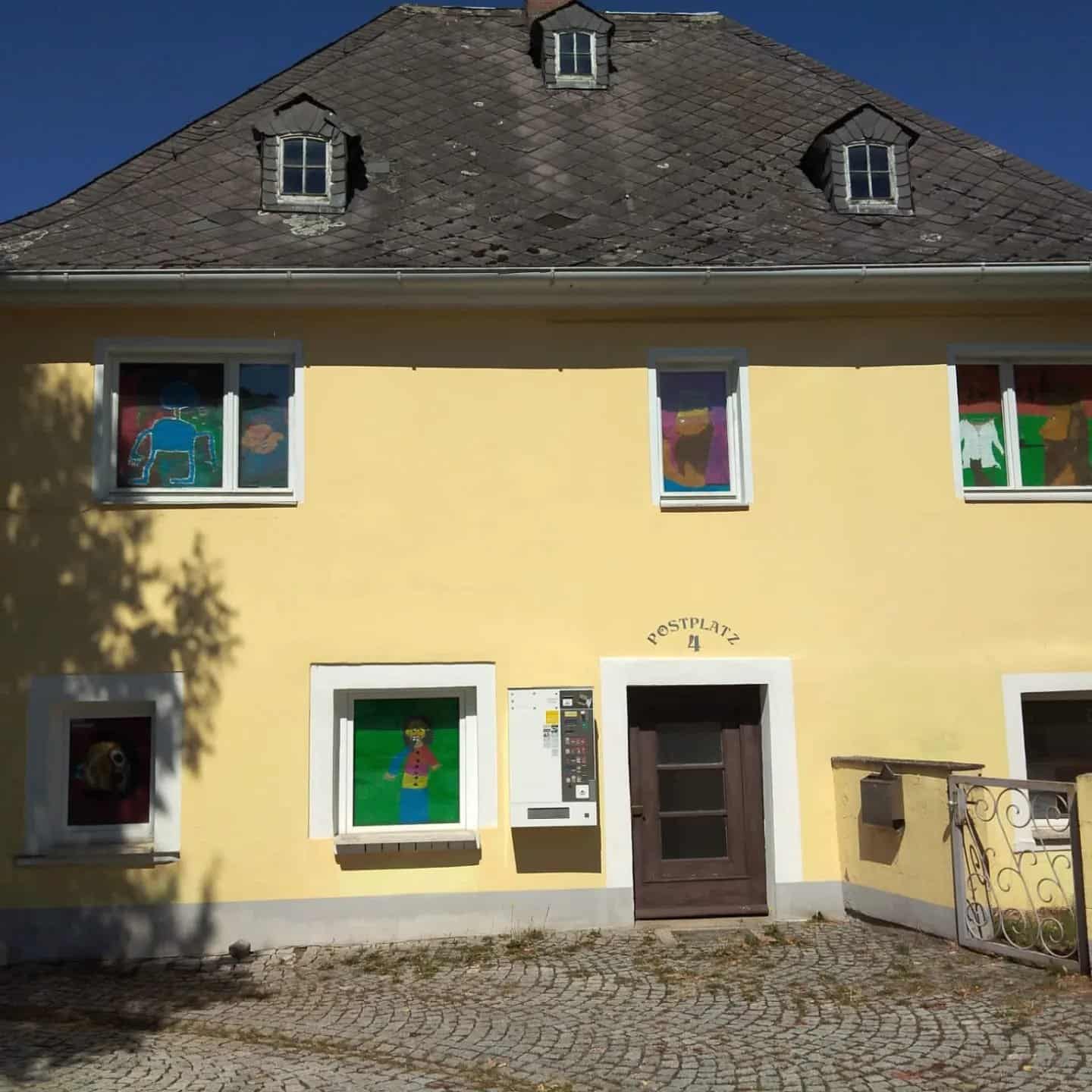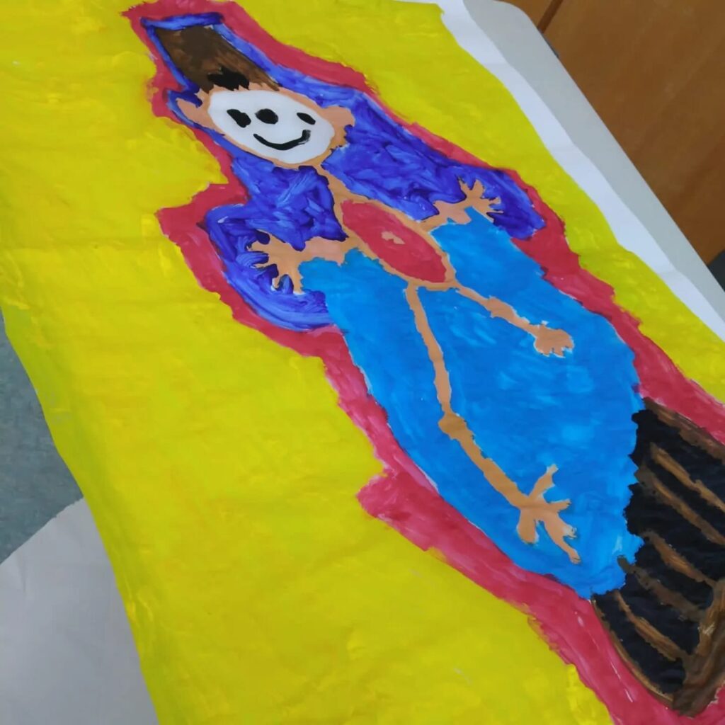 Wir haben zusammen Kriminalgeschichten erfunden und uns dazu Figuren ausgedacht. Diese konnten die Kinder mit Acrylfarben malen und die Bilder schließlich in den Fenstern aufhängen.