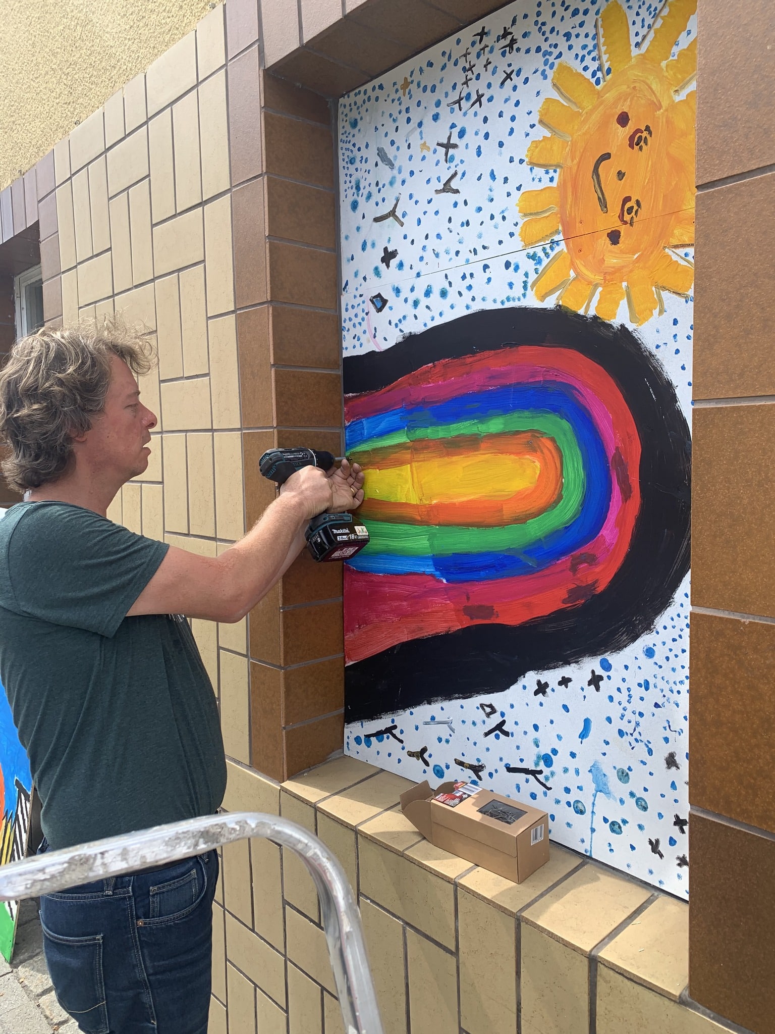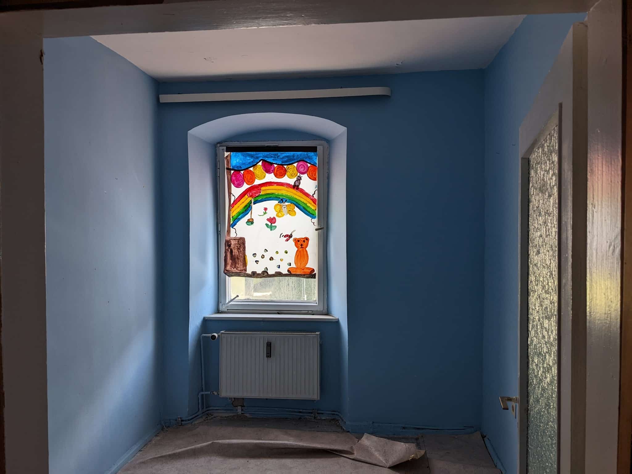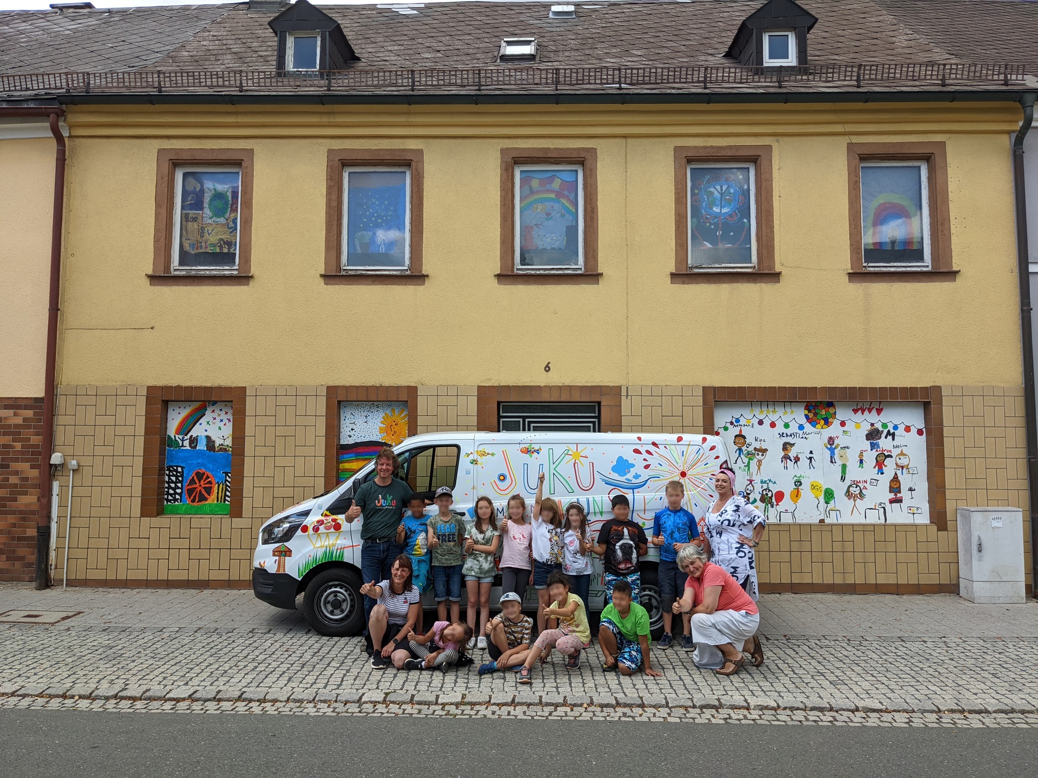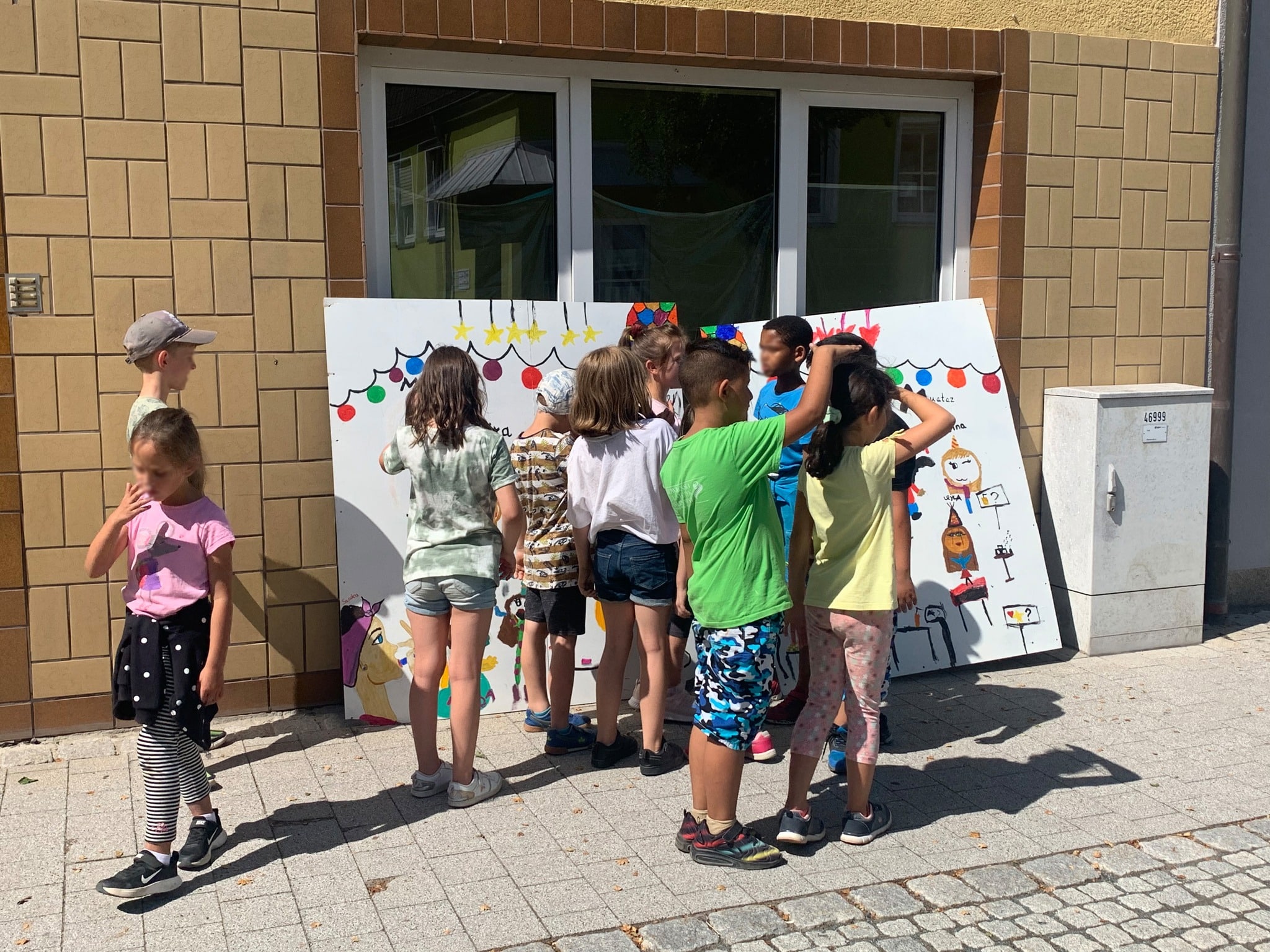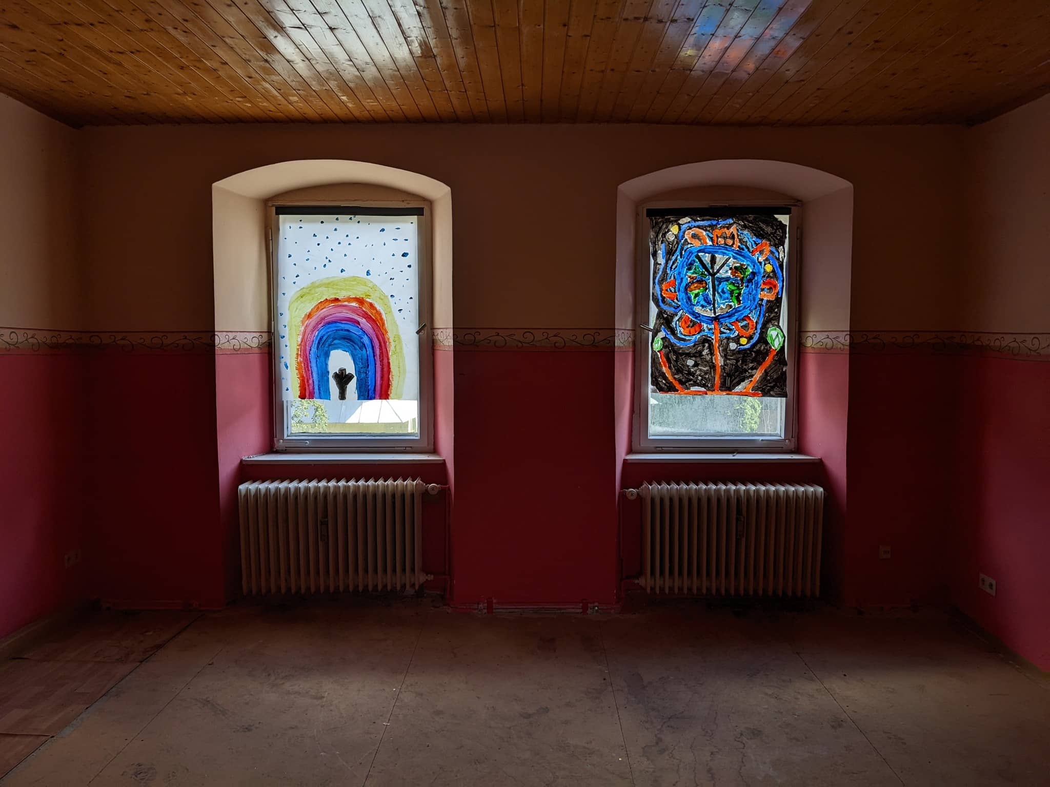 Das Wohnhaus steht leer, zuletzt war darin die örtliche Tafel untergebracht. Die Kinder der Offenen Ganztagsschule der Guttenbergschule haben auf große Bögen Transparentpapier Vorstellungen von künftigen Nutzungsmöglichkeiten gemalt – bis hin zur gemeinsamen Party mit allen Beteiligten. Die Bilder werden Abends von hinten beleuchtet.