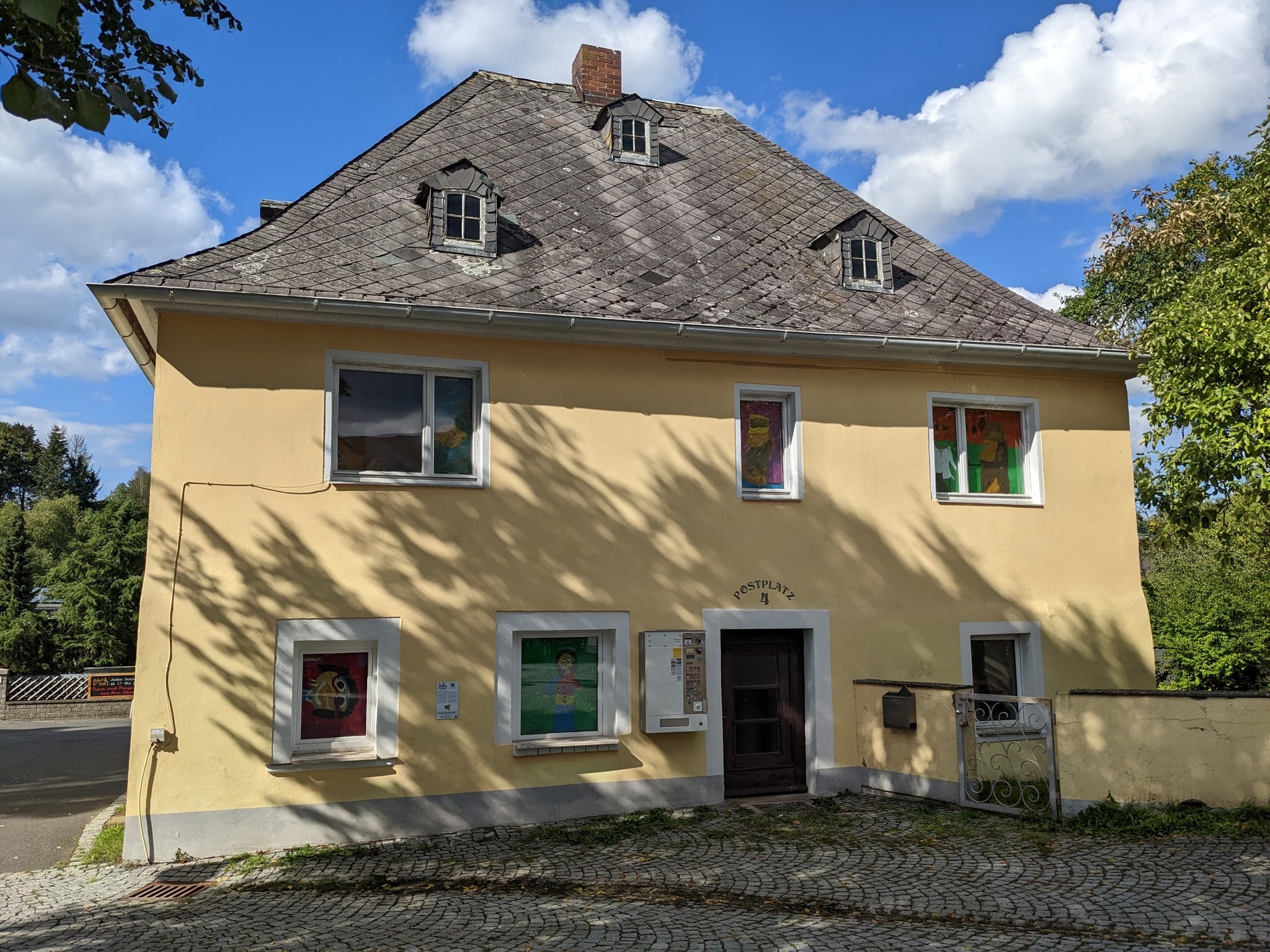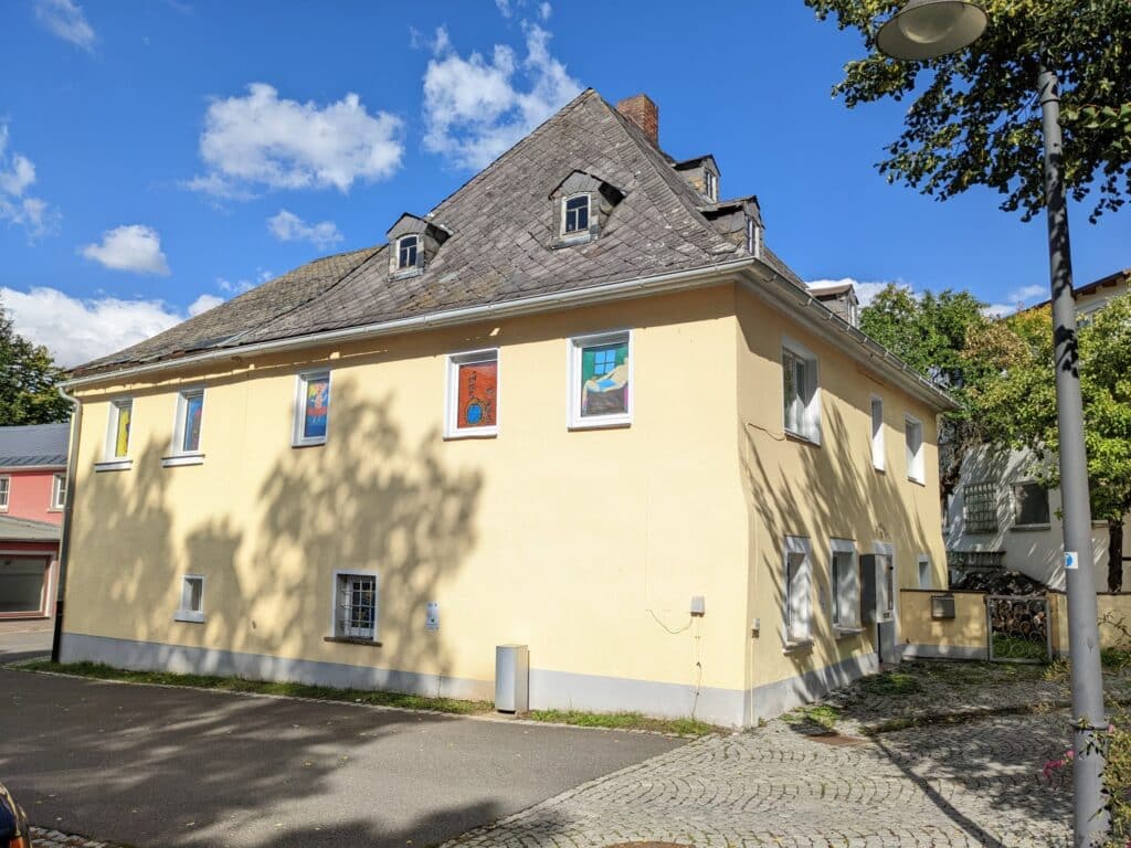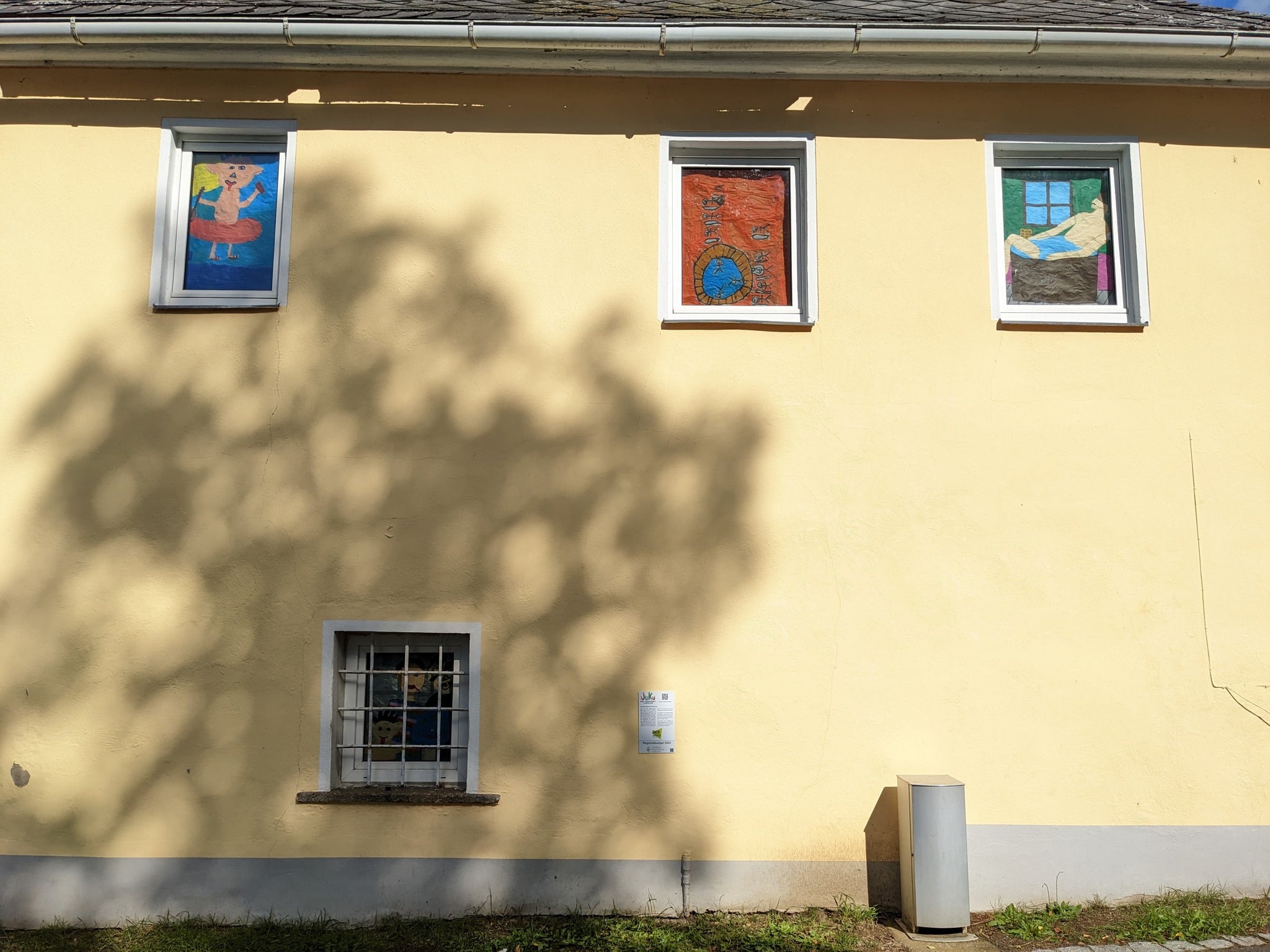 Das „Alte Badhaus“ steht seit langem leer, ein Verein erstellt derzeit Konzepte für Sanierung und künftige Nutzung. Die Kinder in der Ferienbetreuung haben Geschichten zum Haus entwickelt und Szenen daraus auf Transparentpapierbögen gemalt, welche in die Fenster gehängt wurden.