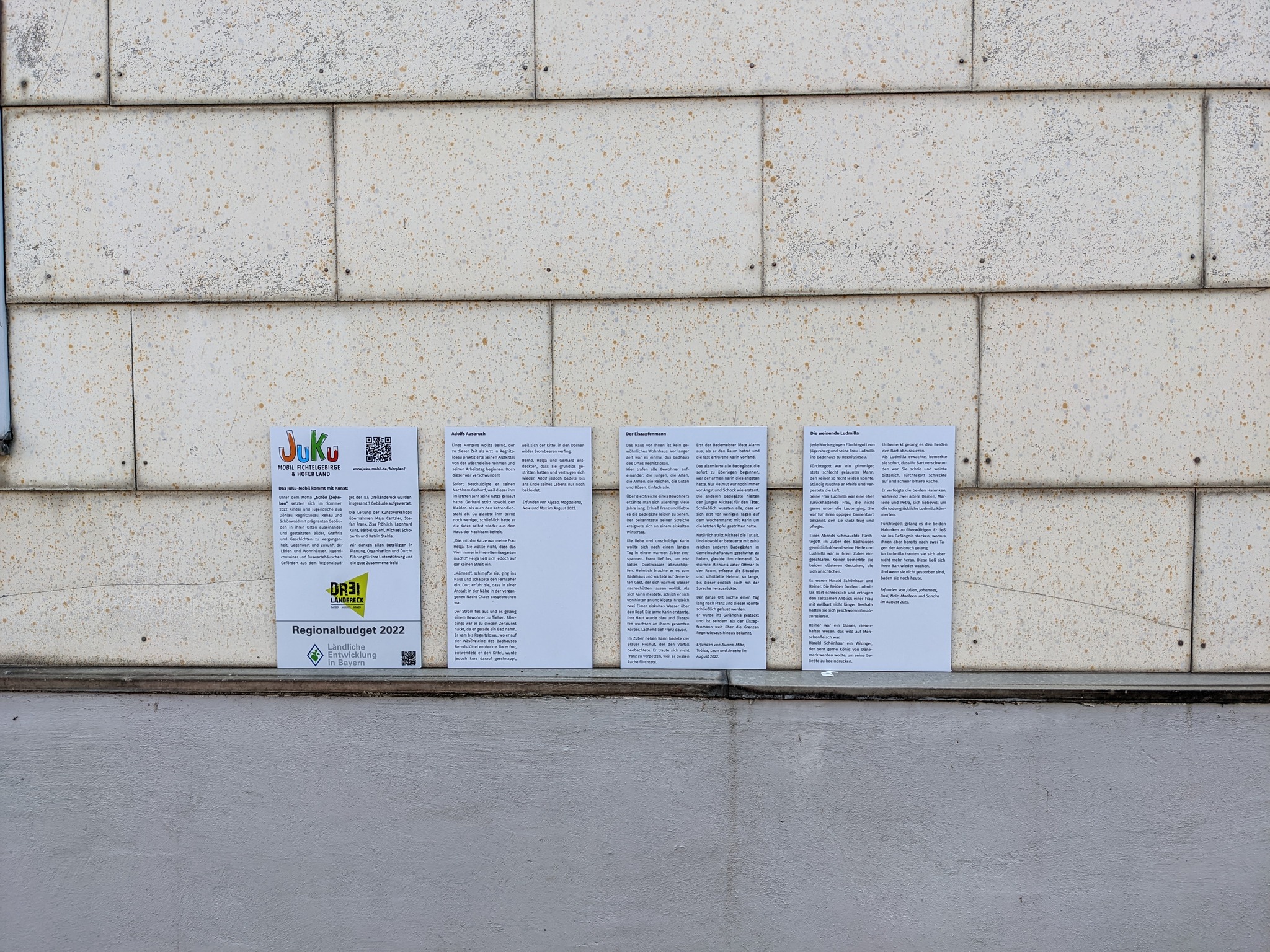 Für die ganzen Geschichten könnt ihr dem alten Badhaus einen Besuch abstatten. Die Texte wurden auf drei Tafeln gedruckt und an der Fassade angebracht. 😊