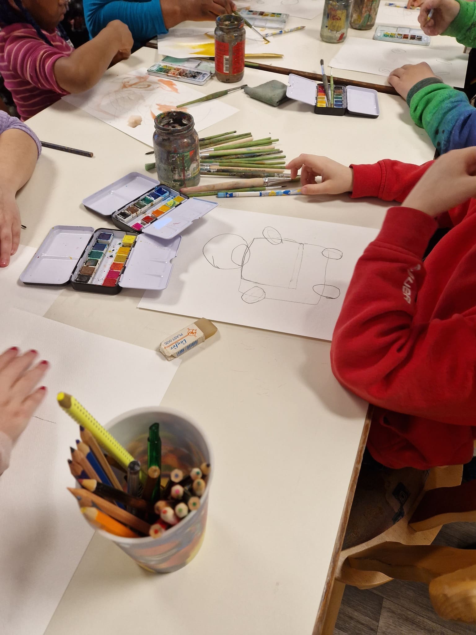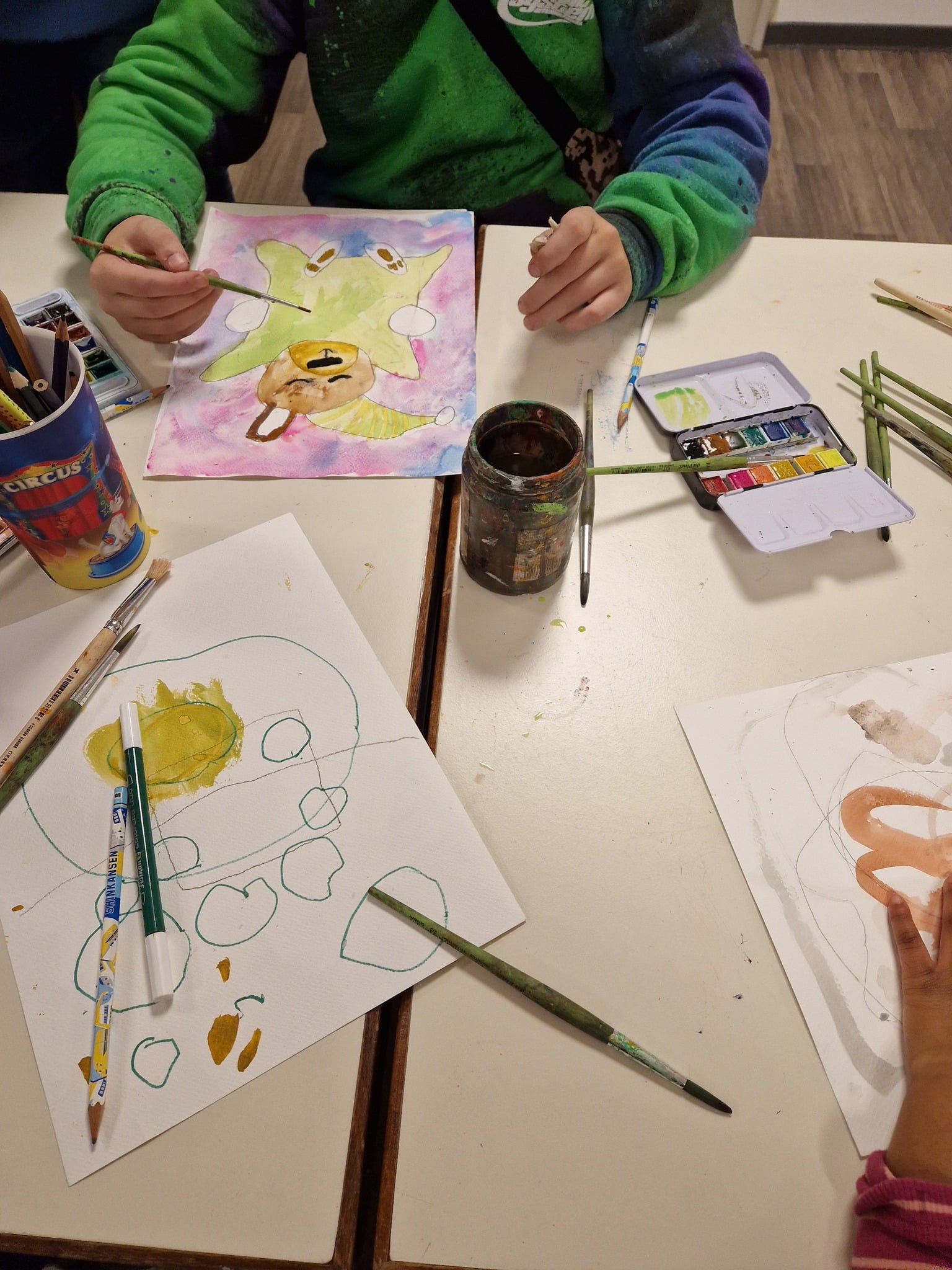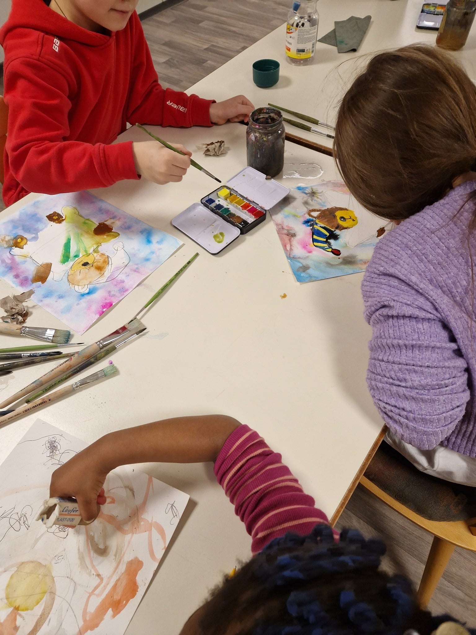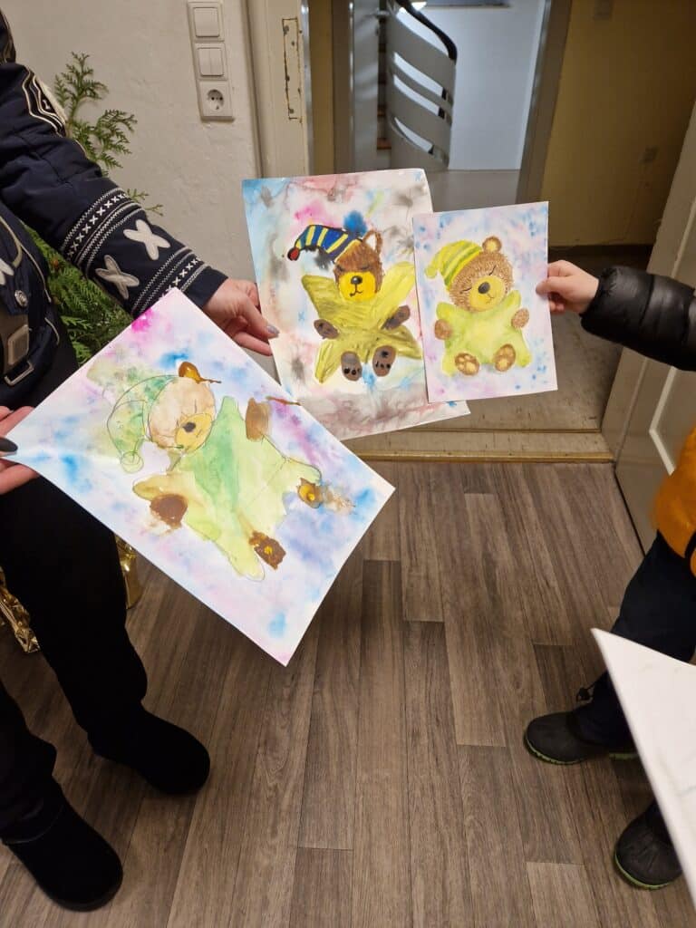 Diesmal hatte die ukrainische Kunstlehrerin Tanja für uns ein wunderbares Motiv vorbereitet: ein Bärchen, das sitzend ein Kissen hält und eine Schlafmütze auf dem Kopf trägt. Die Kinder haben ihre Bären mit Bleistiften vorgezeichnet und mit Aquarellfarben coloriert. 🎨