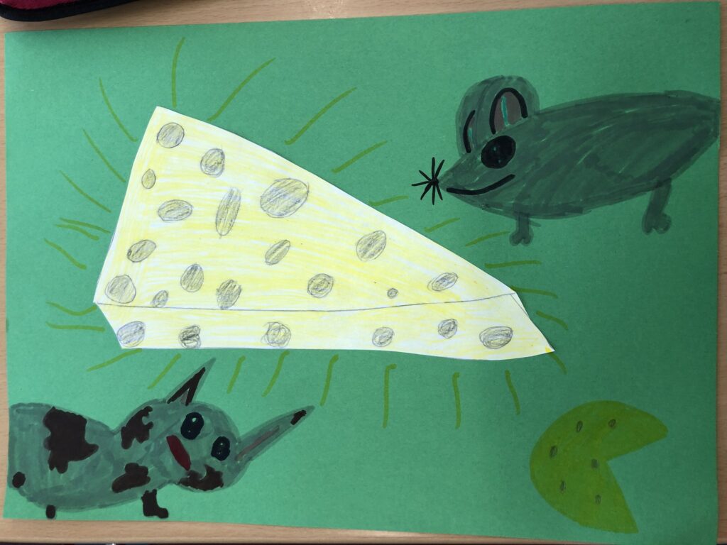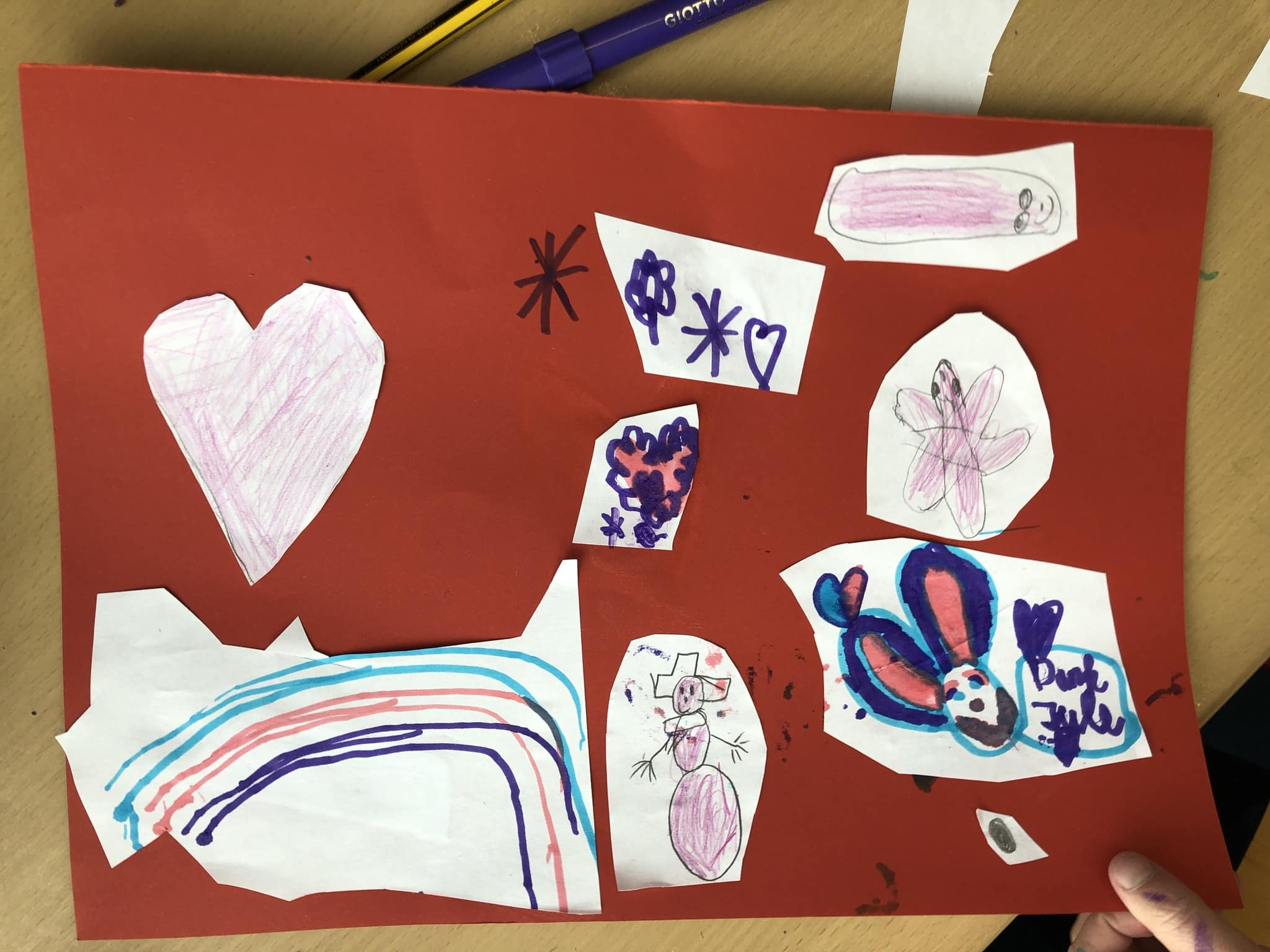 Die Kinder haben mit bunten Papieren, Tape, Kleber, Glitzer, Wolle, Filz und einigen anderen Materialien gearbeitet.