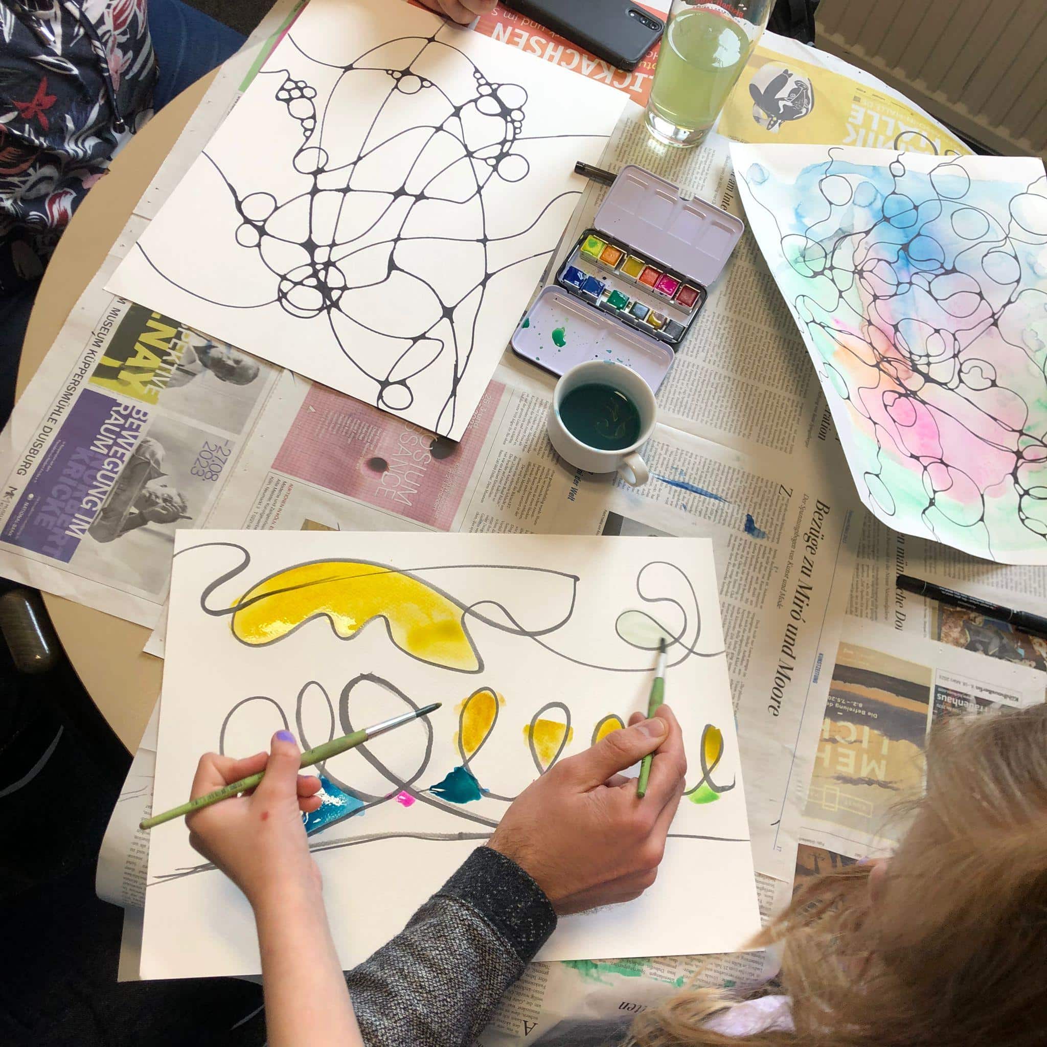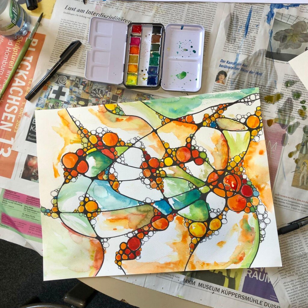 Die Teilnehmenden haben im Schülercafé Oase in Selb mit Aquarellfarben Alleemotive gestaltet und dabei Perspektive und Linienführung entdeckt....