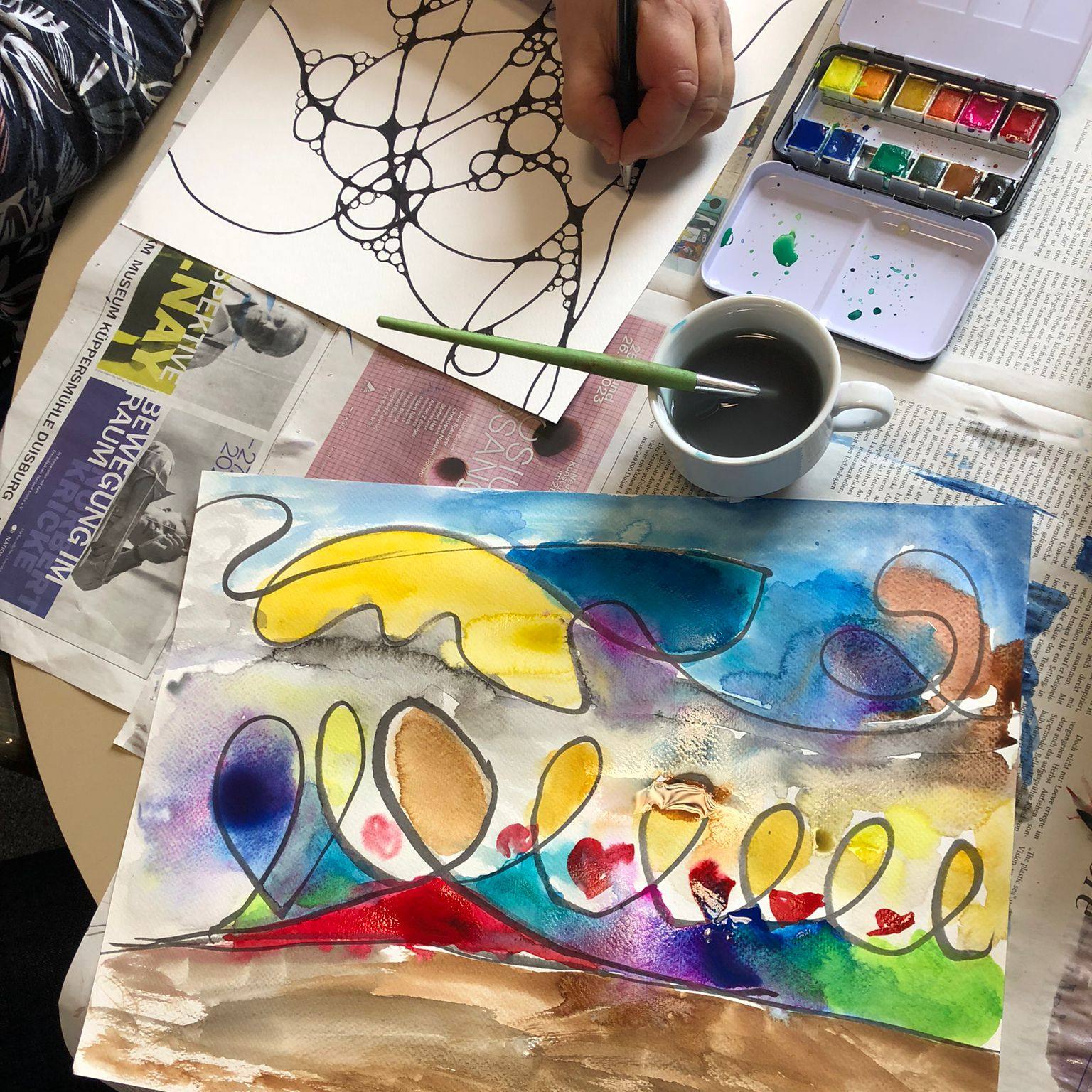 Gemeinsam als Team ist ein großes Bild auf Tapete entstanden. Es wurde gemalt, gestaltet und mit schönen Sprüchen...