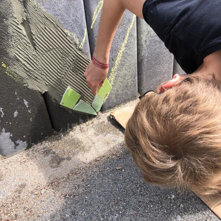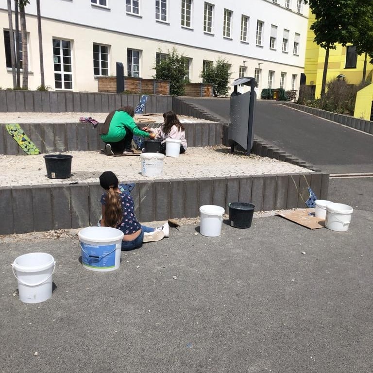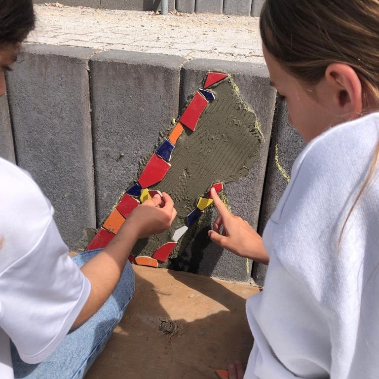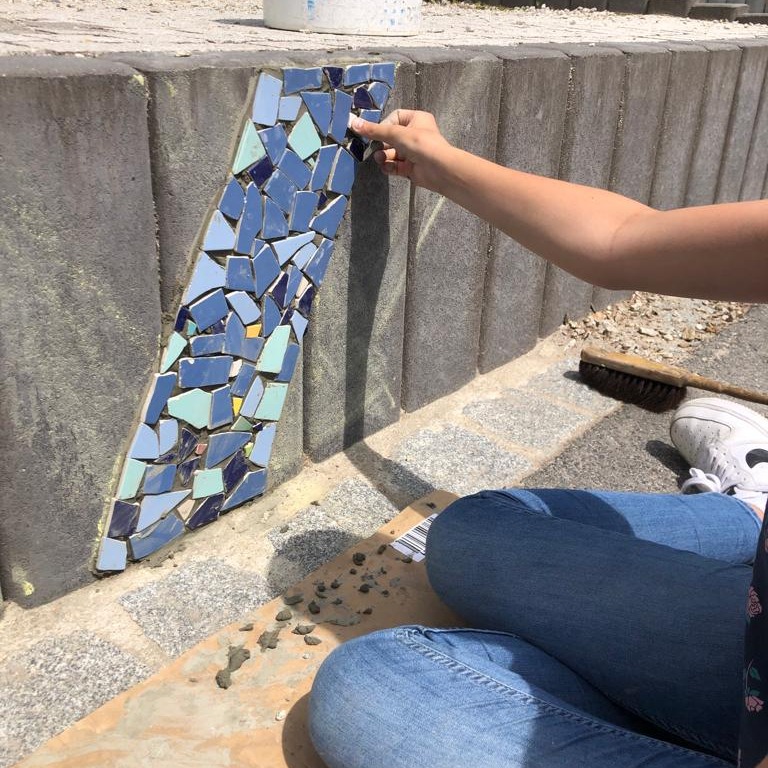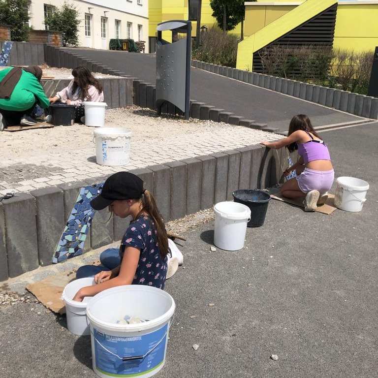 Ein Projekt mit den Schülerïnenn der 7. Klasse im Rahmen des pARTnerInnenprojekts. Hier war die Herausforderung, den ganzen Platz zu gestalten und doch im Zeitrahmen zu bleiben. Mit großer Konzentration und viel Durchhaltekraft haben die Schülerïnnen auch bei der größten Hitze Mosaik geklebt.