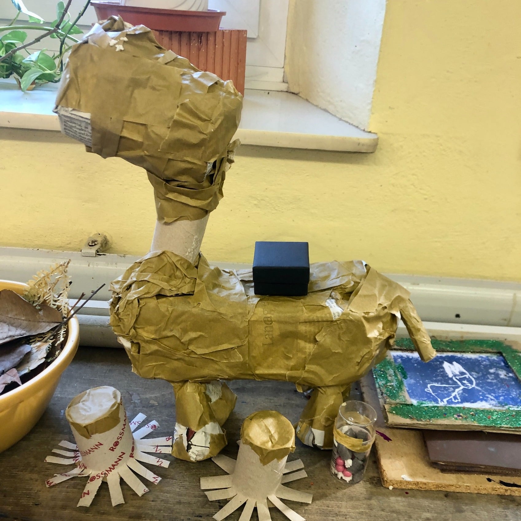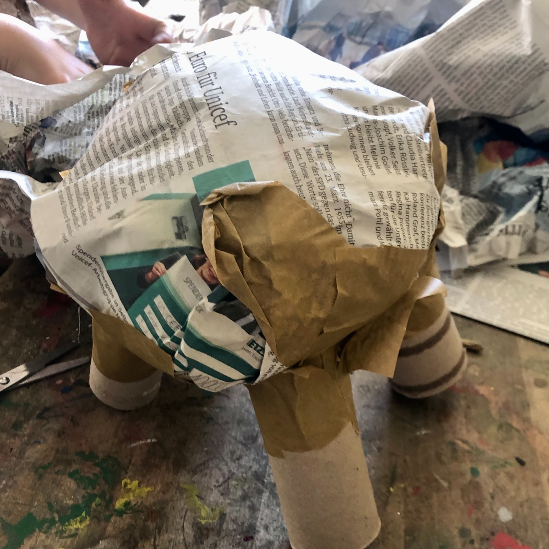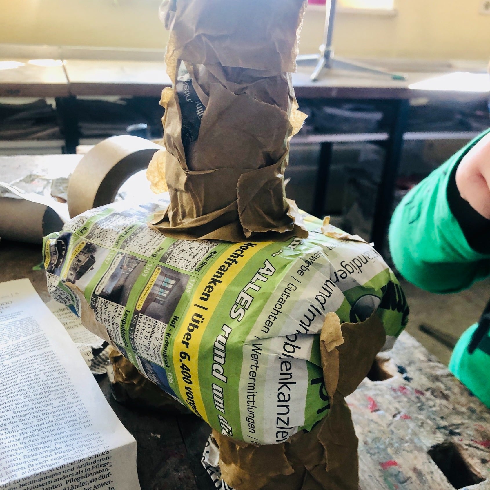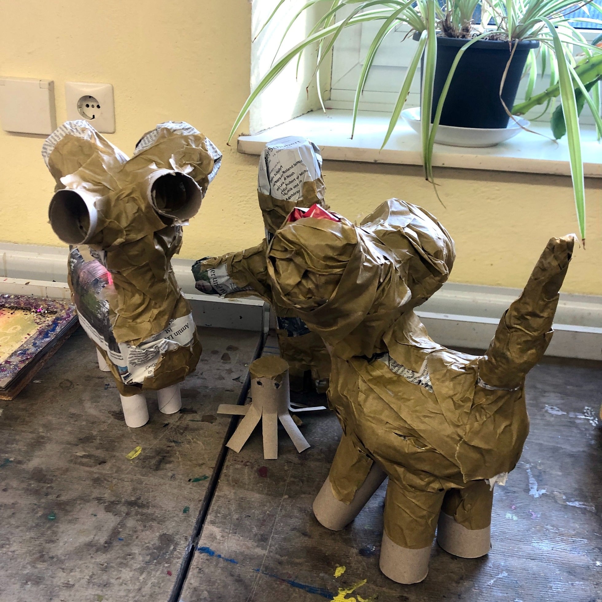 Die Kinder haben Figuren aus Papprollen und Recyclingmaterialien hergestellt, die dann als Basis für Papiermaché dienten. 🎨 Das war eine komplett neue Erfahrung für die Kinder! Anfangs gab es viele Fragen und Bitten um Hilfe, aber schon bald hatten sie den Dreh raus und hatten richtig viel Spaß dabei.