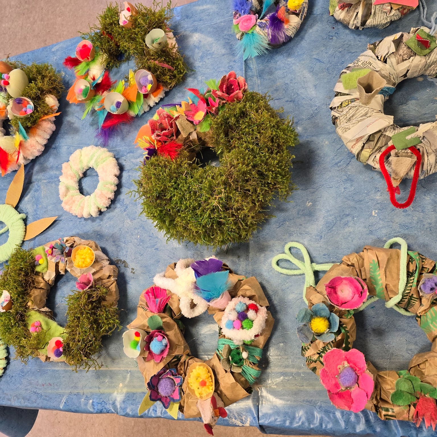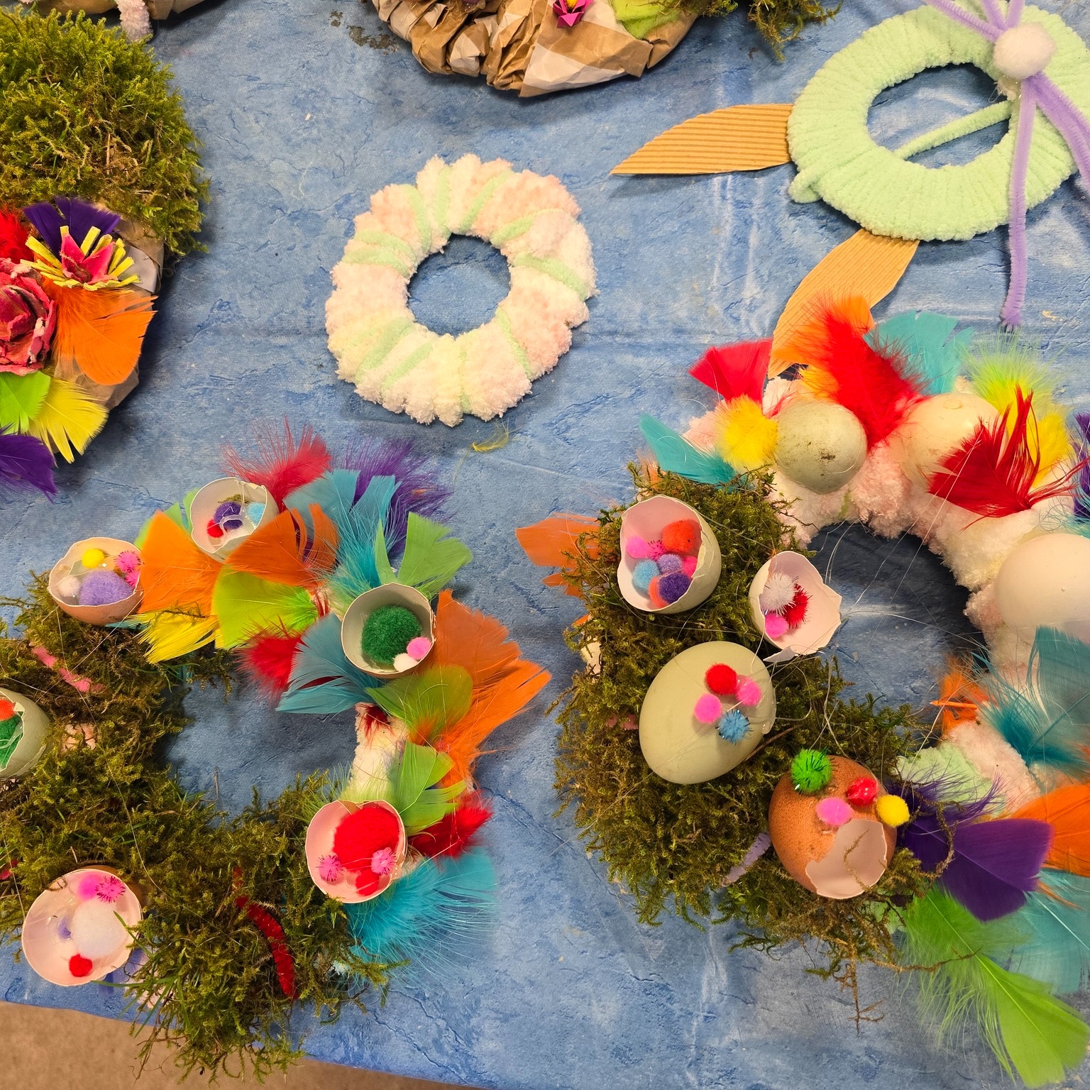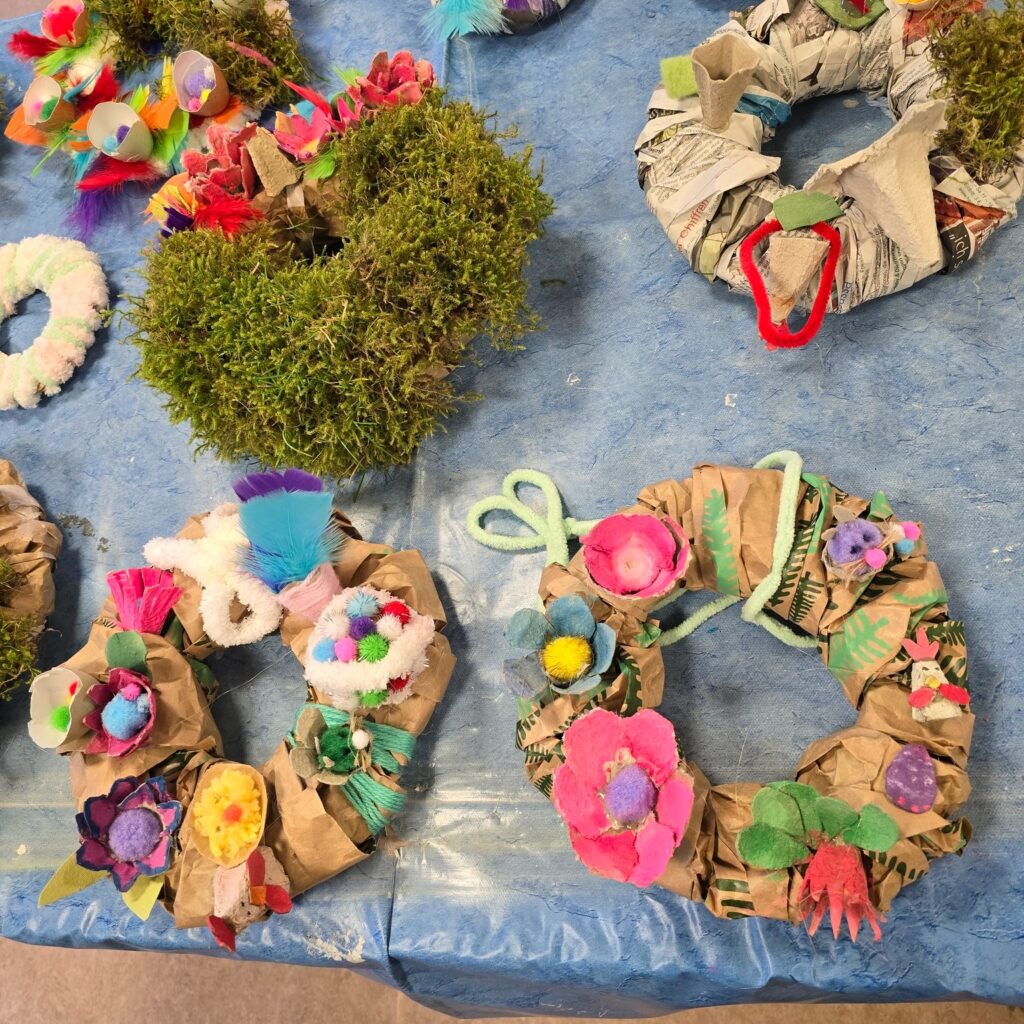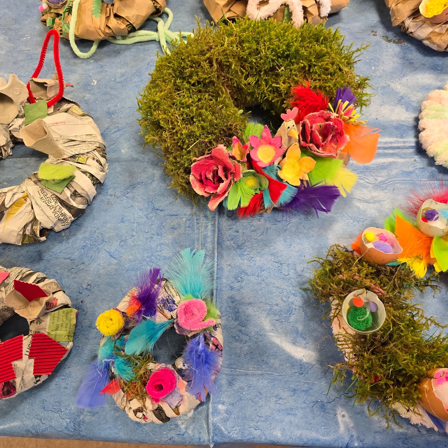 Die Kinder haben Osterkränze aus Eierkartons und vielem mehr kreiert. 🌸 Die Teilnehmende sprudelten vor Ideen, und nach anfänglichem Zögern haben sie sich sogar nach draußen gewagt, um Moos zu sammeln. 🌿 Mit viel Wolle, Farbe und Kleber haben sie ihre Kränze kunstvoll verziert und wunderschöne Osterkränze entstehen lassen