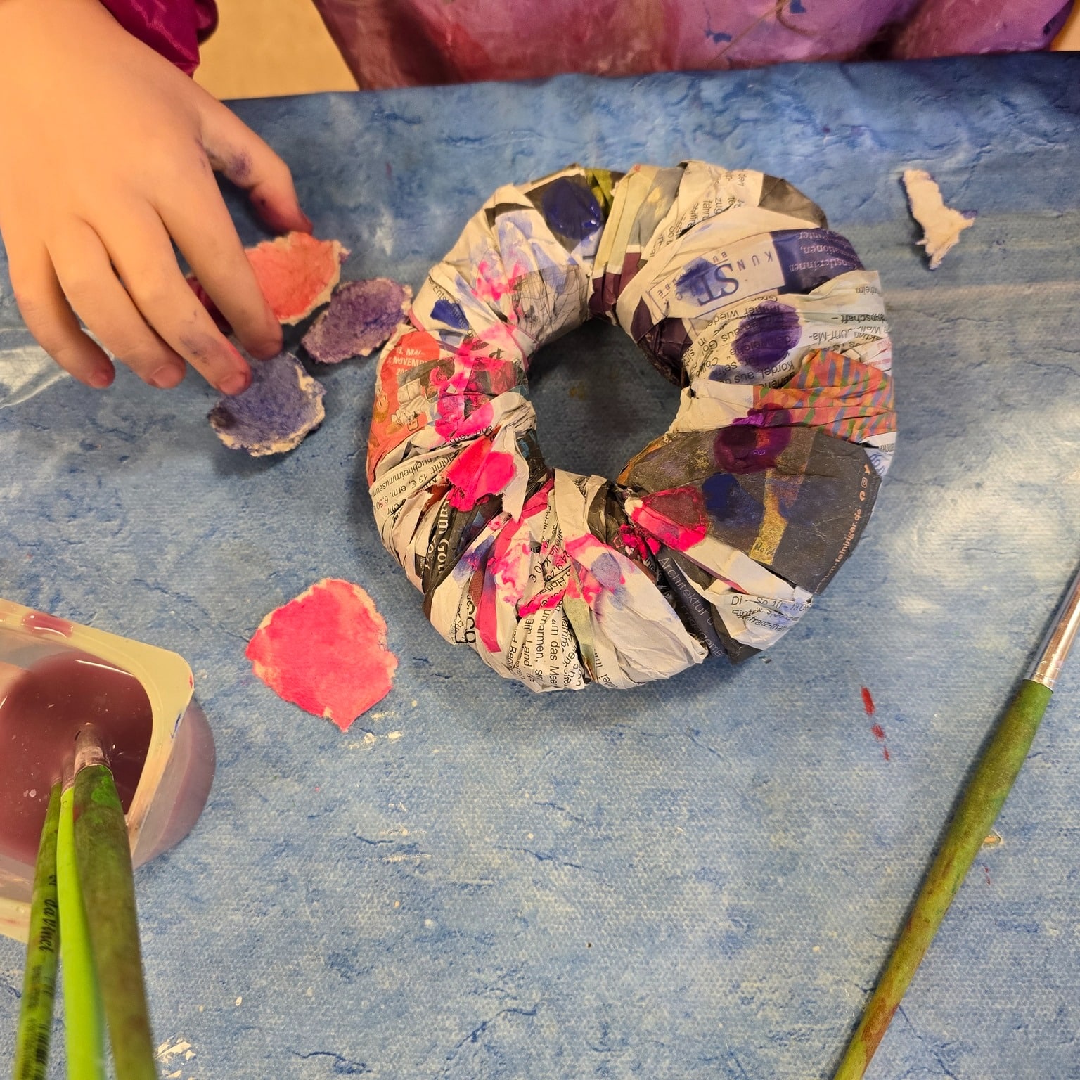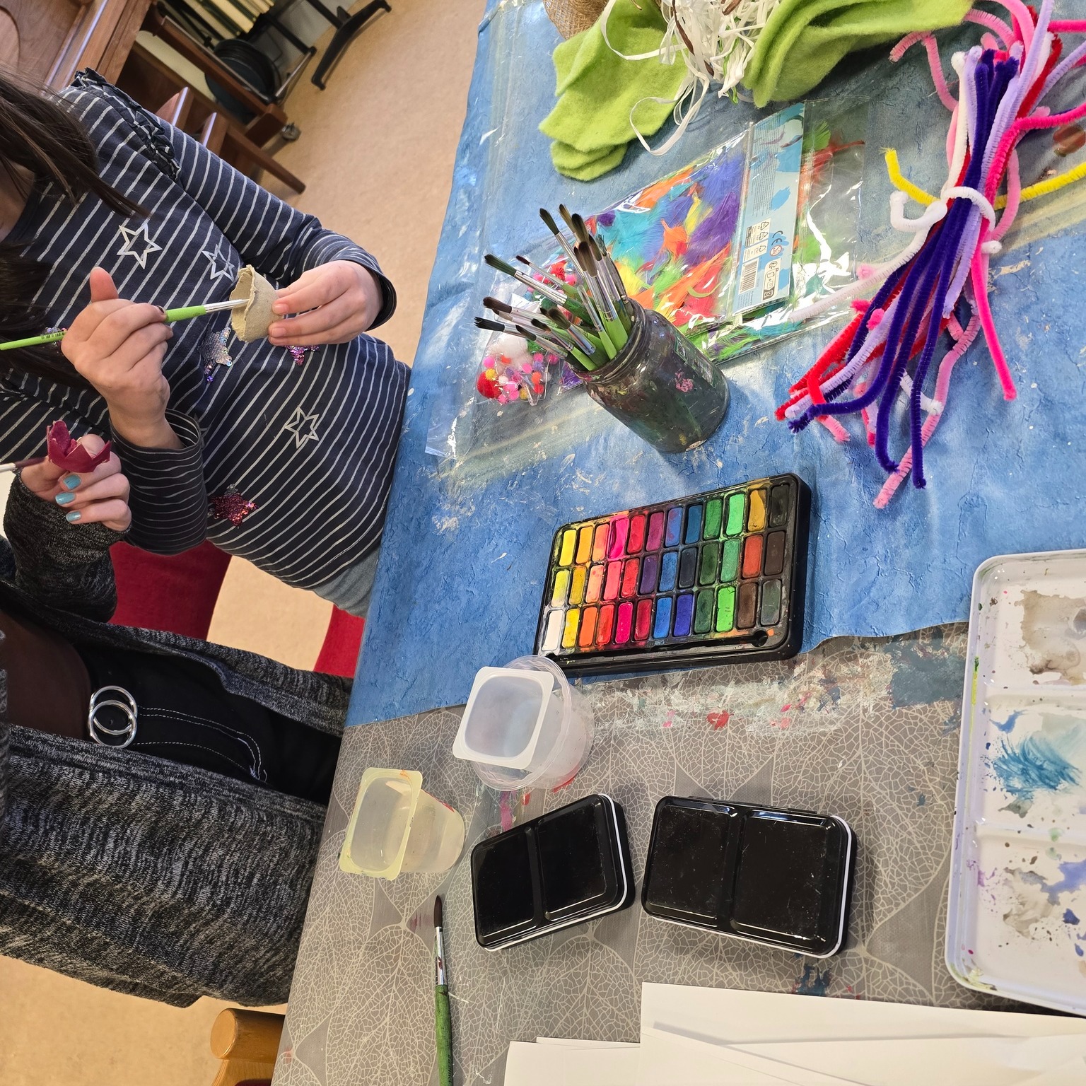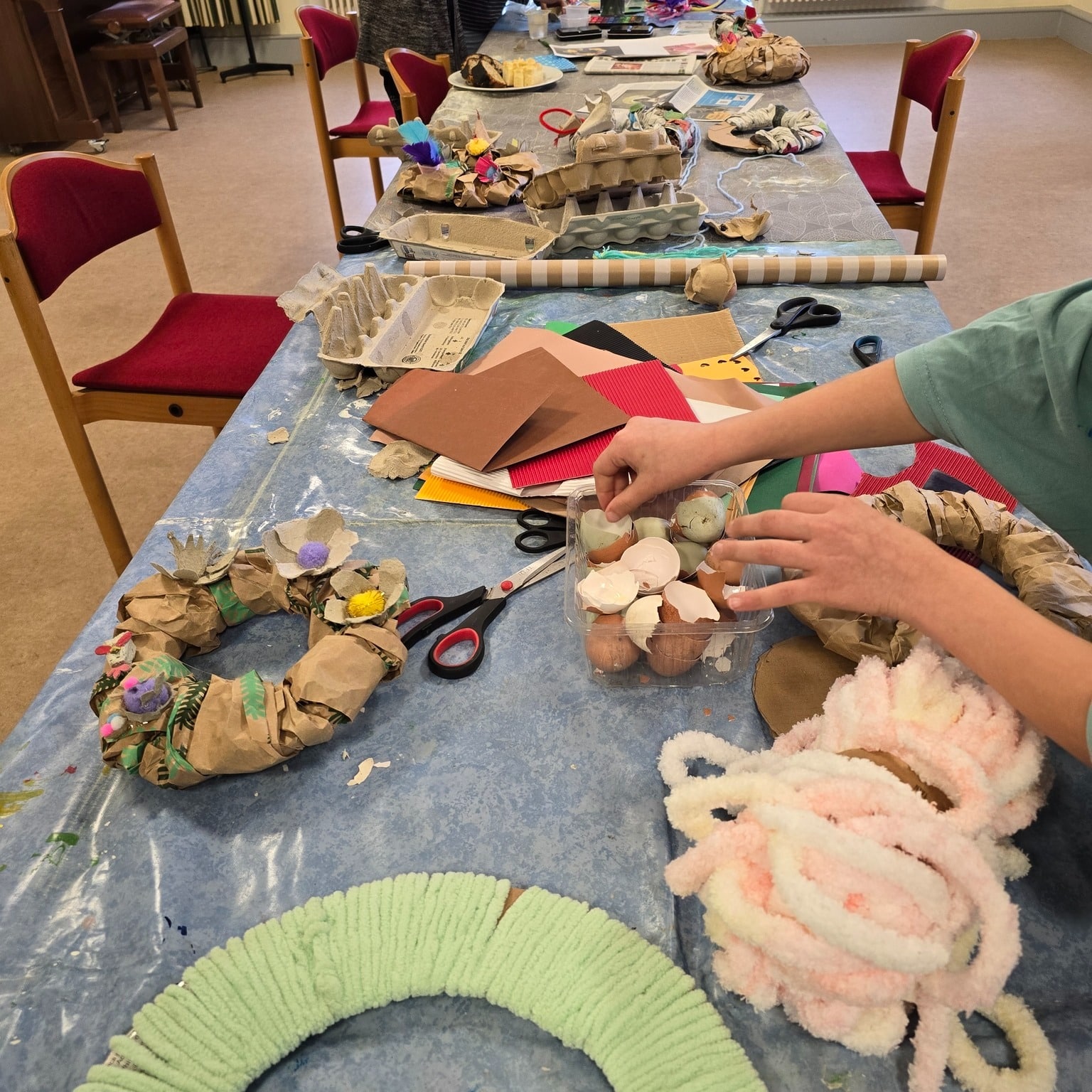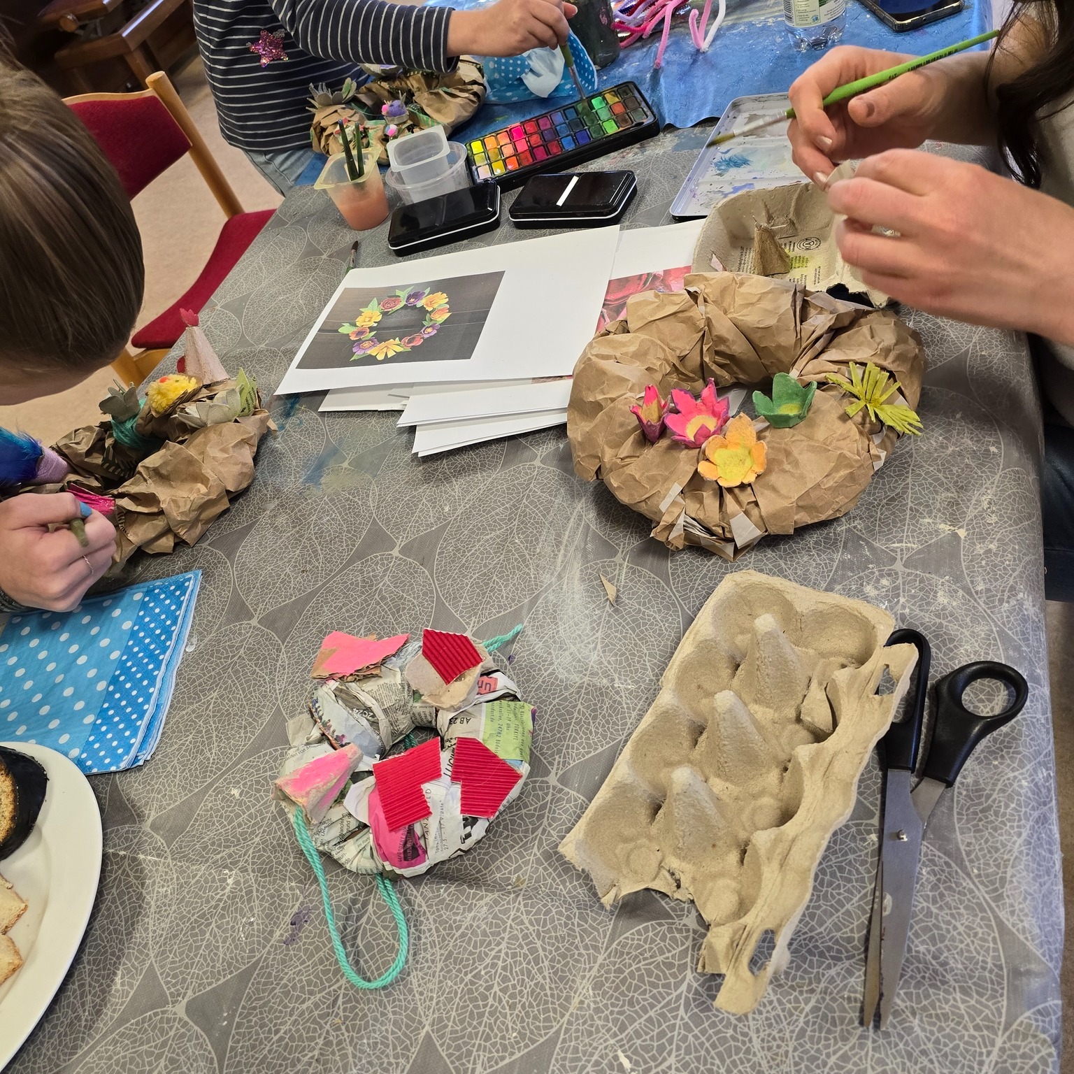 Die Kinder haben Osterkränze aus Eierkartons und vielem mehr kreiert. 🌸 Die Teilnehmende sprudelten vor Ideen, und nach anfänglichem Zögern haben sie sich sogar nach draußen gewagt, um Moos zu sammeln. 🌿 Mit viel Wolle, Farbe und Kleber haben sie ihre Kränze kunstvoll verziert und wunderschöne Osterkränze entstehen lassen