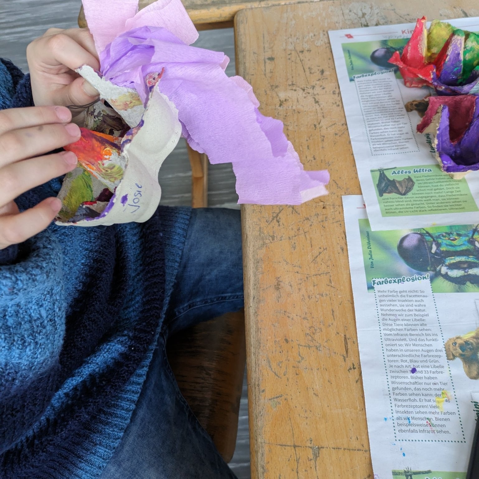 Die Kinder haben aus Karton und Papier wunderschöne 3D-Tiere gebastelt und mit Kreiden und Stiften kunstvoll bemalt. Die...
