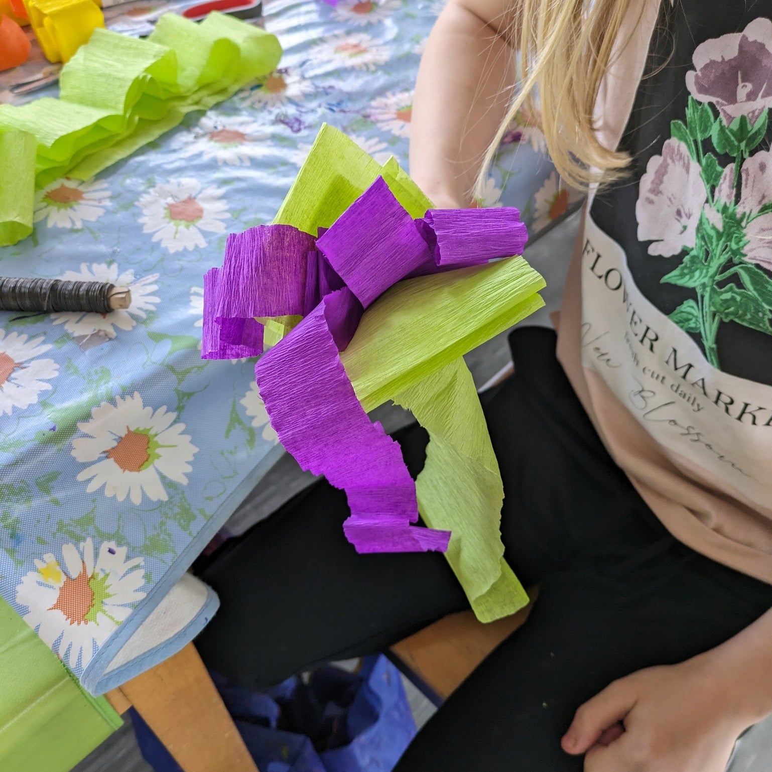 Die Kinder haben ihre Kränze mit bunten Blumen verziert, die sie mit der Heißkleberpistole befestigt haben. 🌼 Zusätzlich...