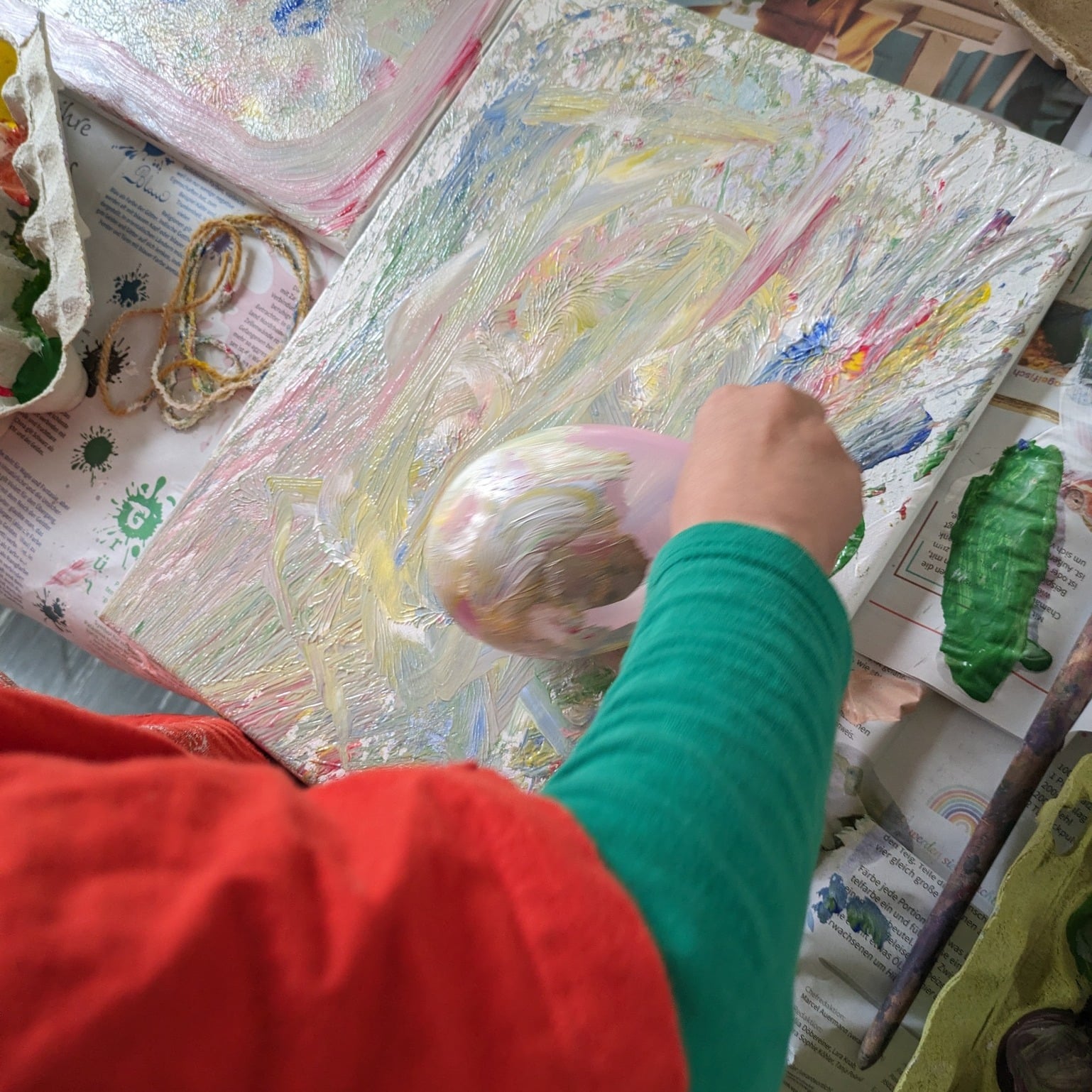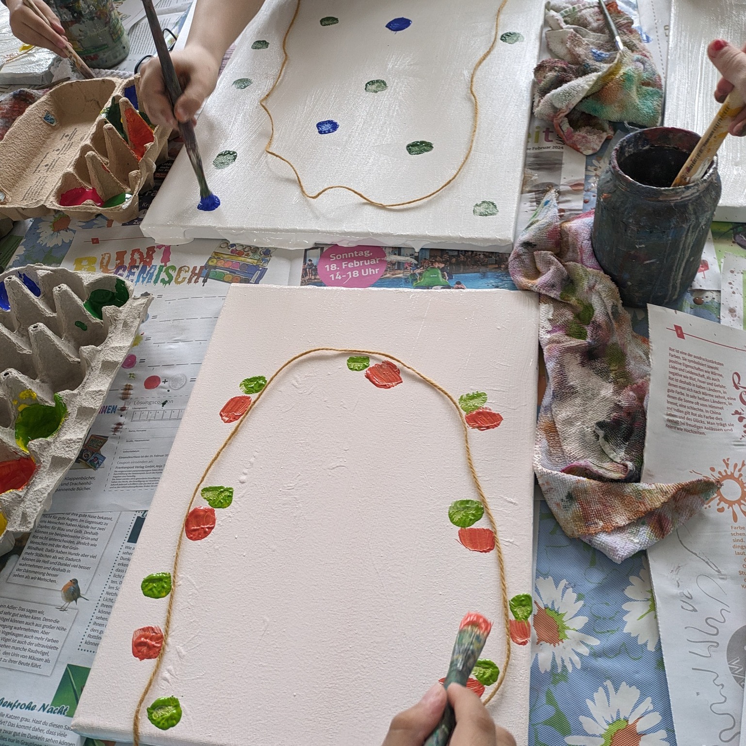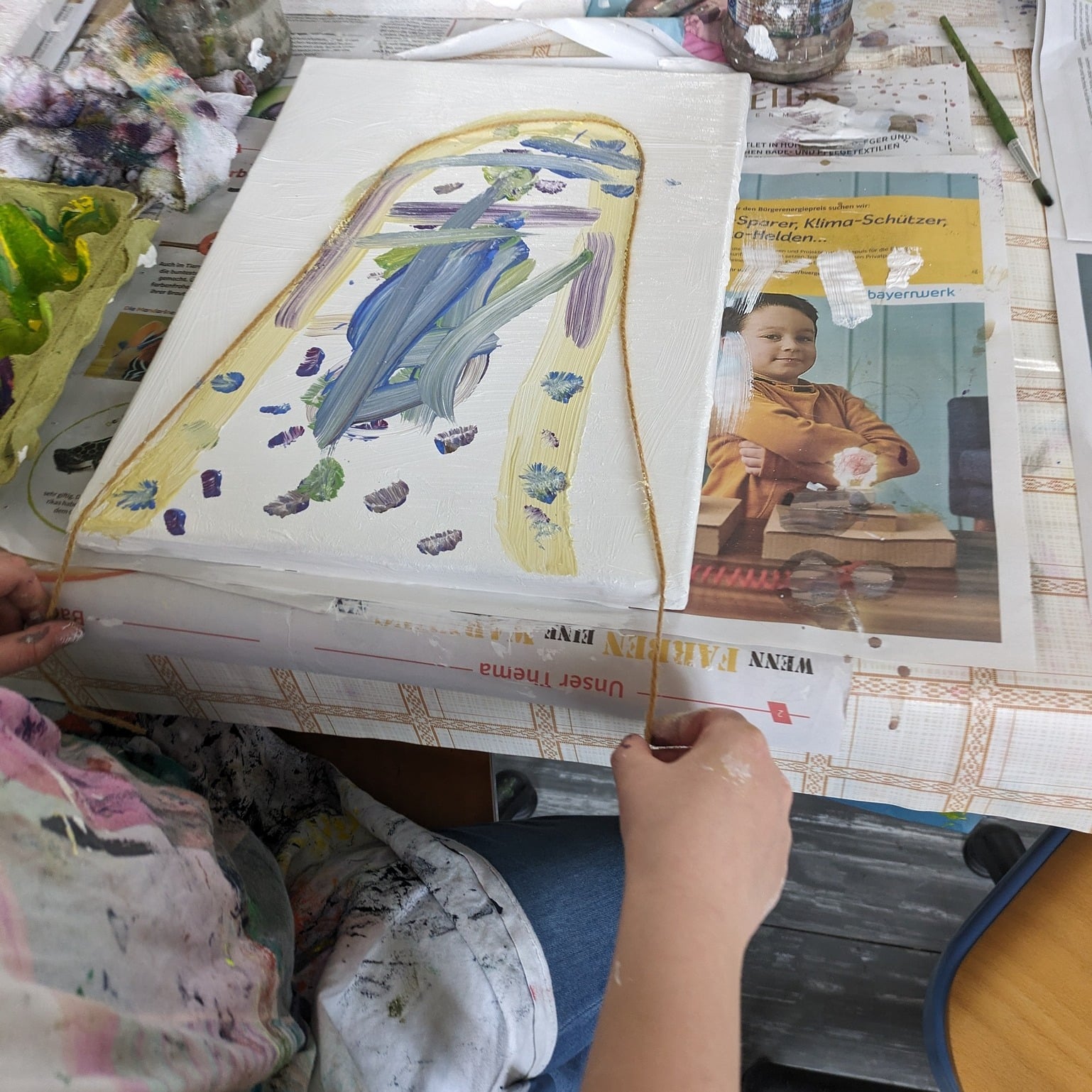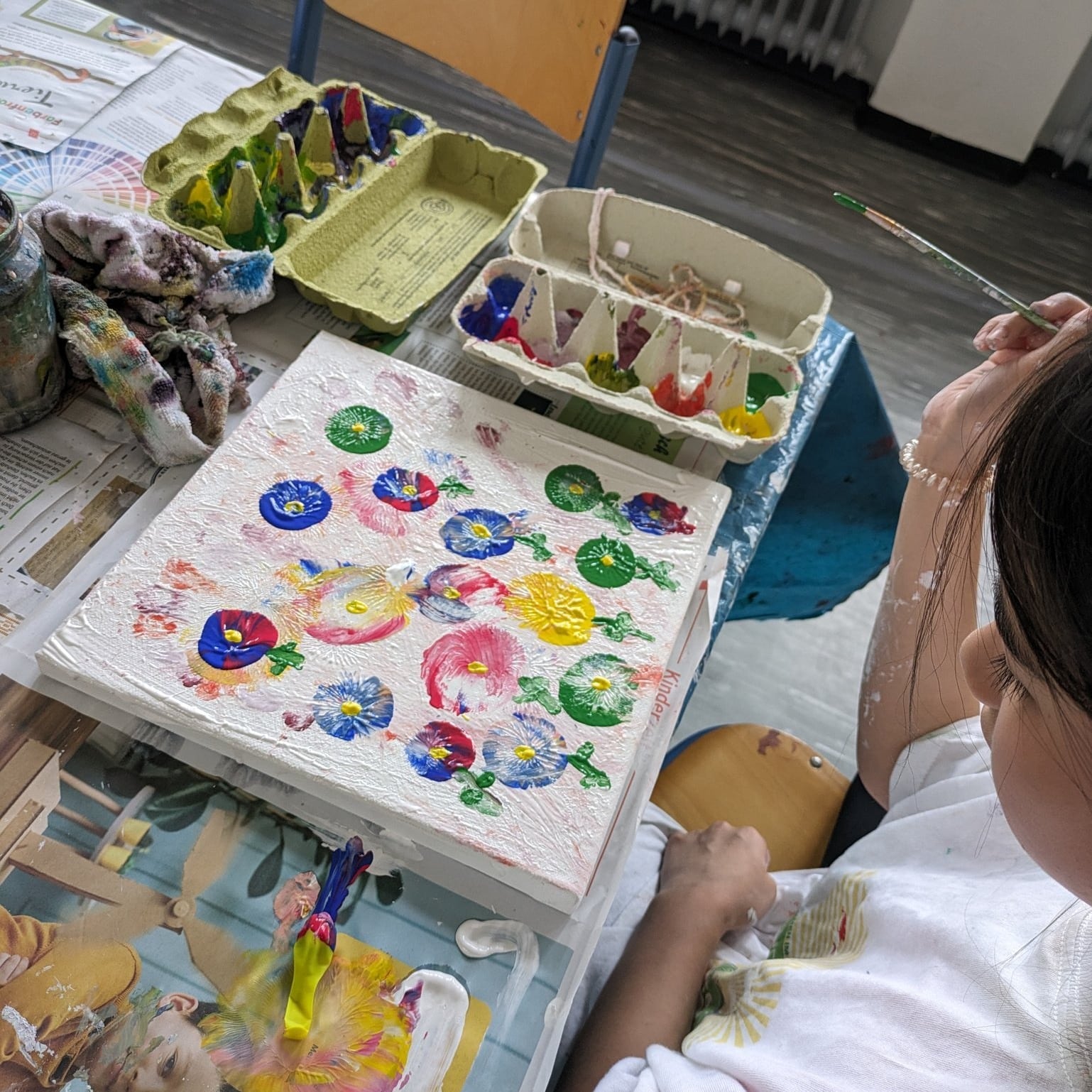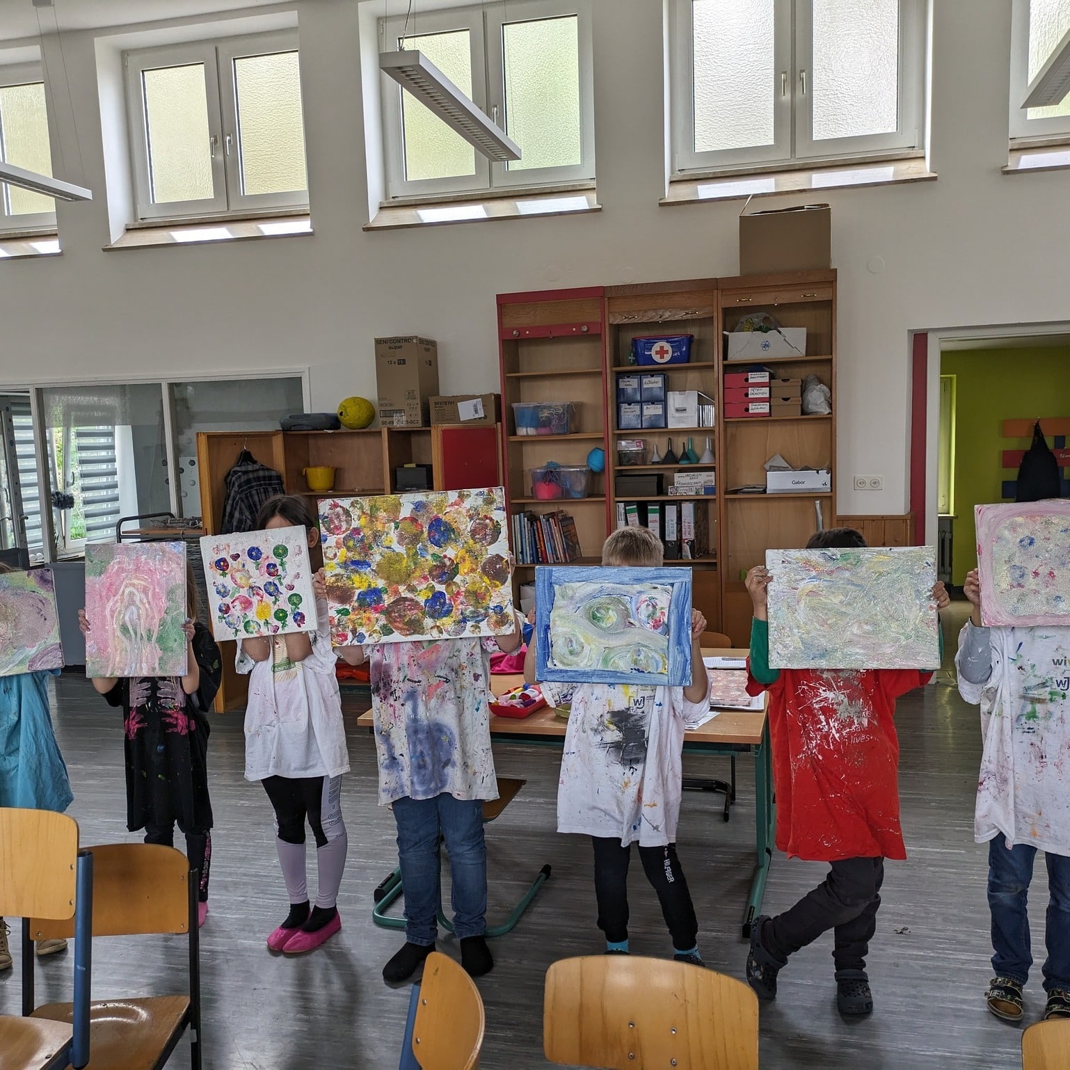 Die Kinder haben auf Leinwänden wahre Kunstwerke entstehen lassen. Mit verschiedenen Techniken wie Fadenziehen, Luftballontupfen und natürlich dem klassischen Pinsel haben sie beeindruckende Bilder in selbst gemischten Farben geschaffen. 🖌️🌈 Jedes Werk erzählt seine eigene Geschichte und spiegelt die Vielfalt ihren kreativen Ideen wider. Ein Tag voller Farbenpracht und künstlerischer Entfaltung
