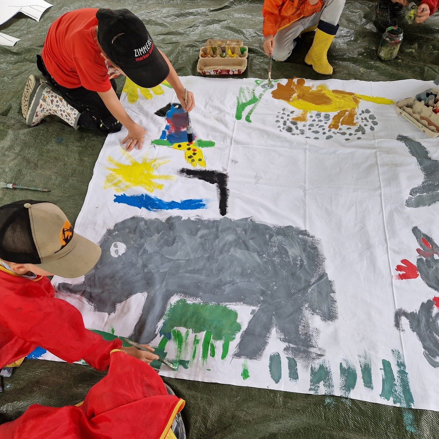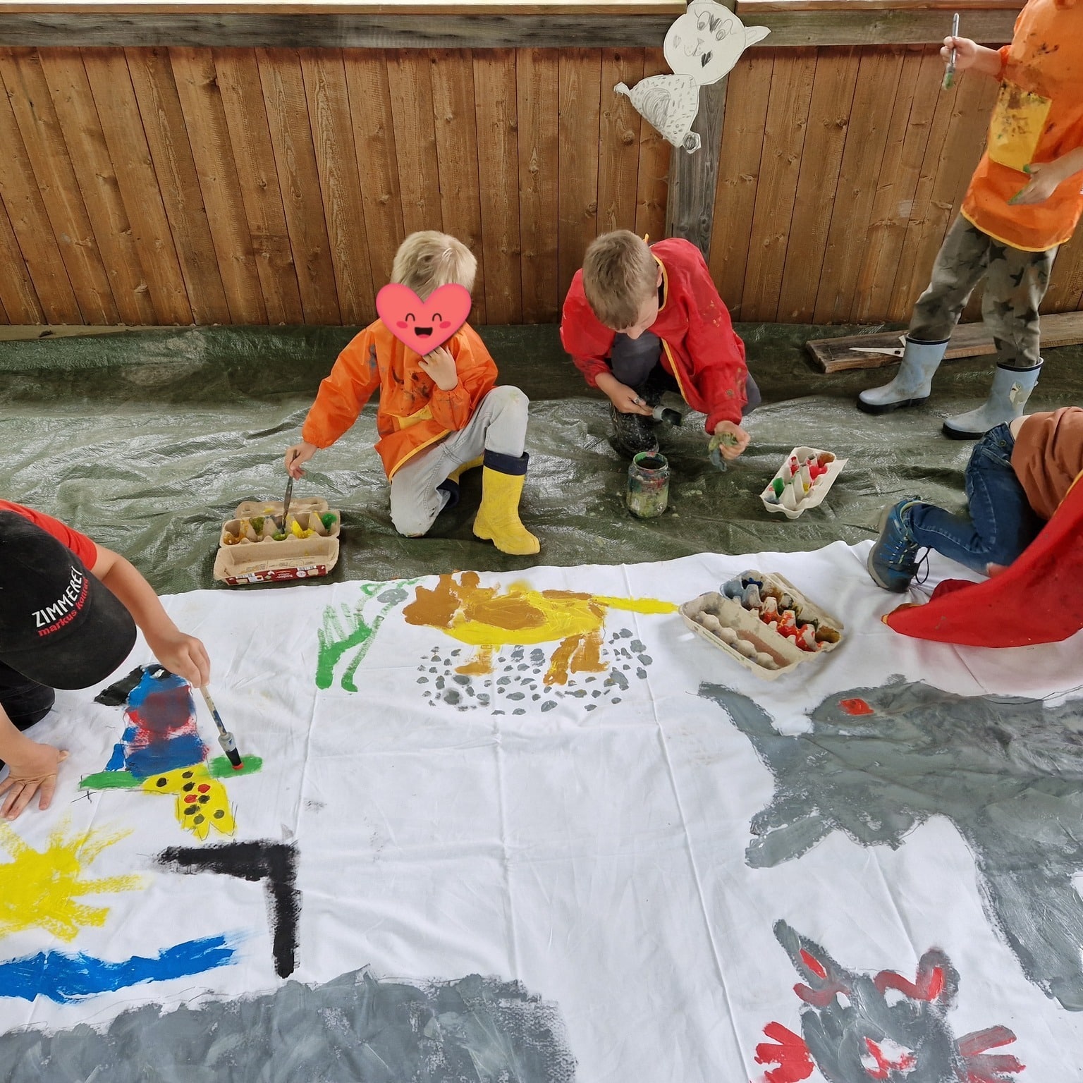 Gemeinsam als Team ist ein großes Bild auf Tapete entstanden. Es wurde gemalt, gestaltet und mit schönen Sprüchen...