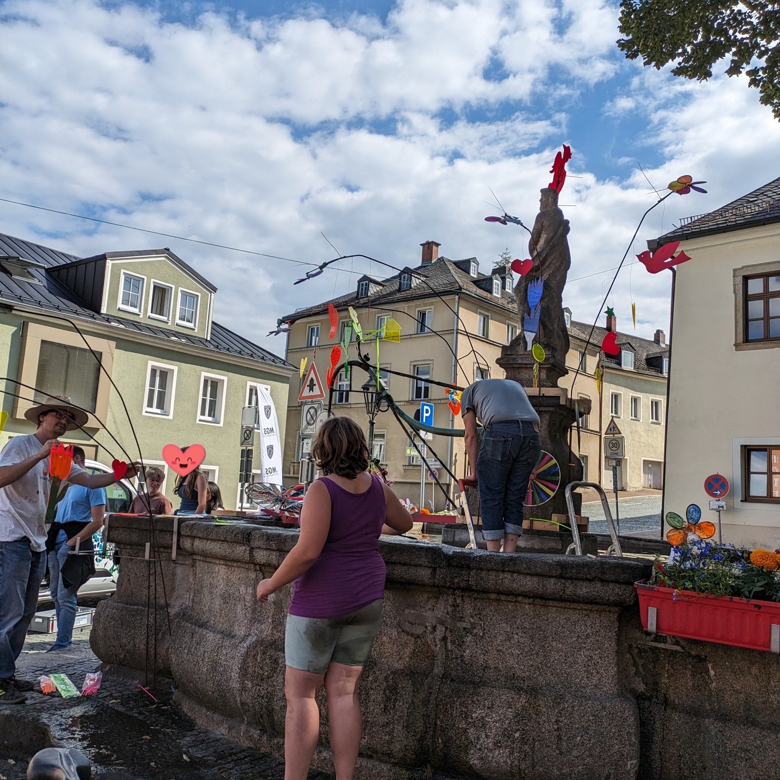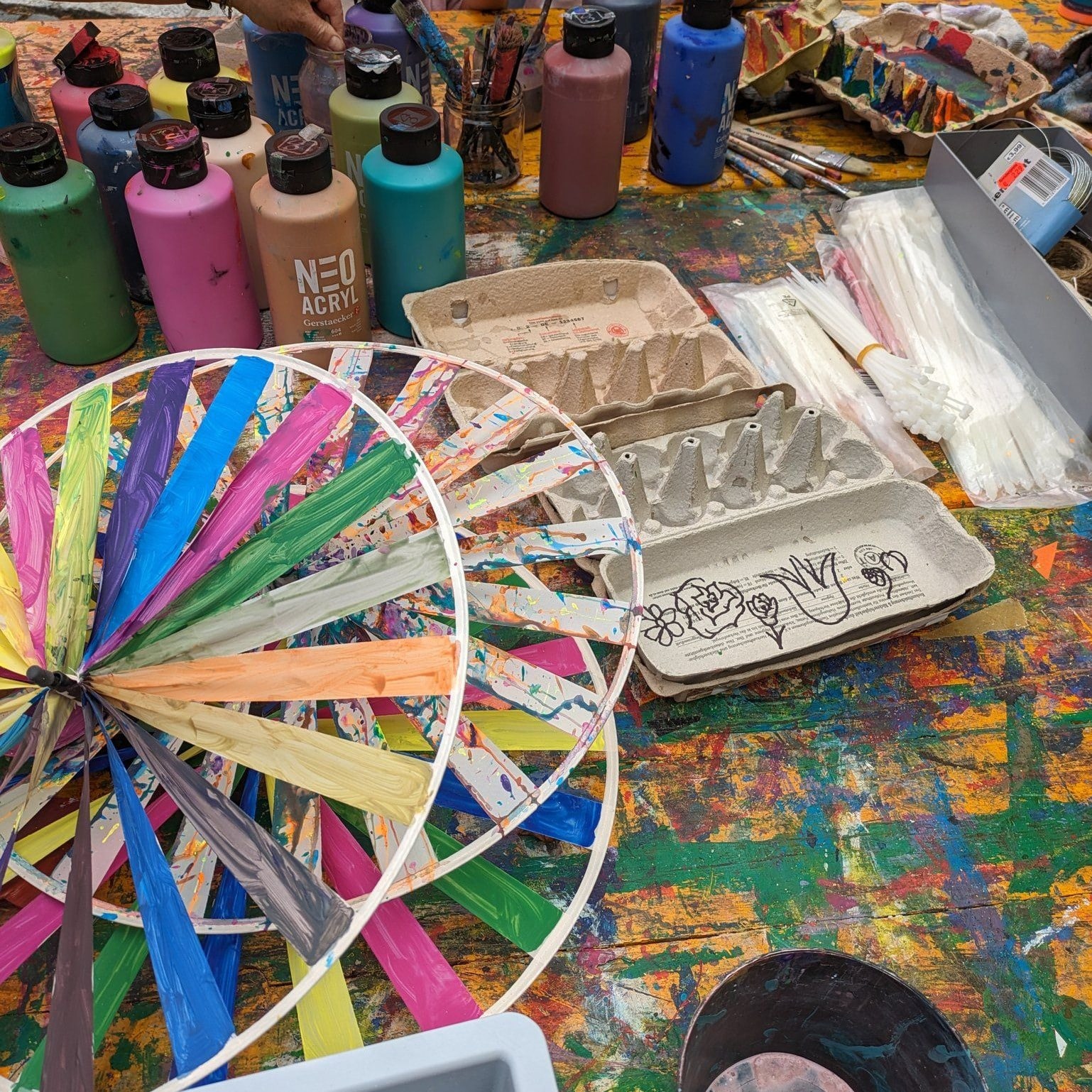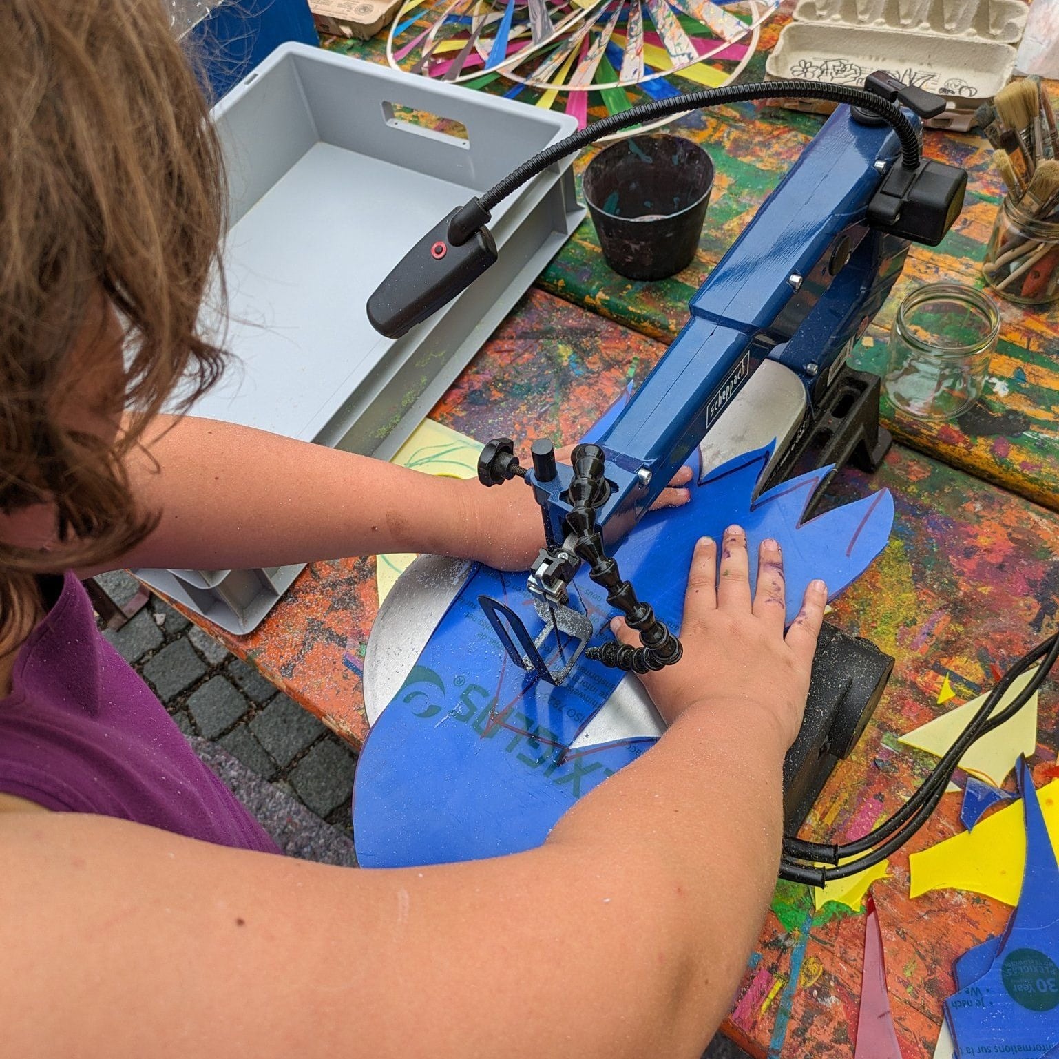Die Kinder haben mit großem Eifer und Geschick beim Brunnenschmücken mitgewirkt. Zuerst pflanzten sie Blumen, um den Brunnenbereich zu verschönern. Danach gingen sie ans Werk und sägten aus Plexiglas filigrane Figuren wie Vögel, Blumen, Herzen, Sterne und Häuser aus – eine echte Herausforderung, die sie mit Bravour meisterten! 🌟Mit viel Sorgfalt bemalten sie auch die Gestelle für das Wasserrad und die Windräder mit Acrylfarben, was den Brunnen zu einem lebendigen und einladenden Ort machte. Ihr kreatives Engagement hat den Brunnen in ein farbenfrohes Kunstwerk verwandelt! 🎨🌈
