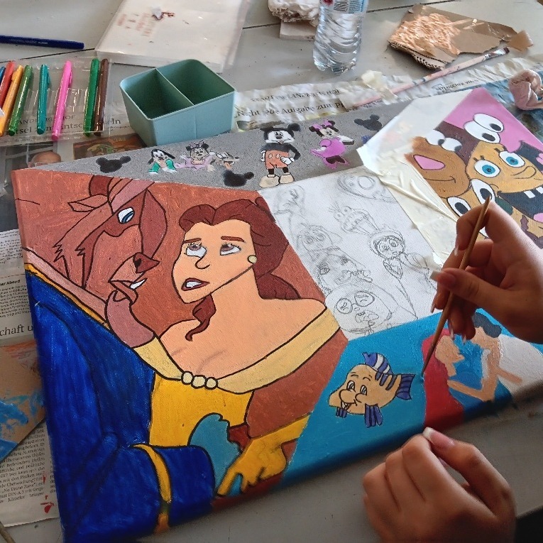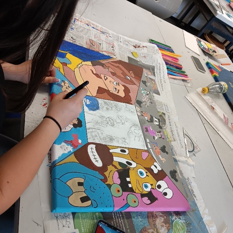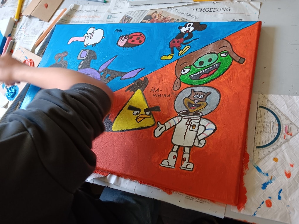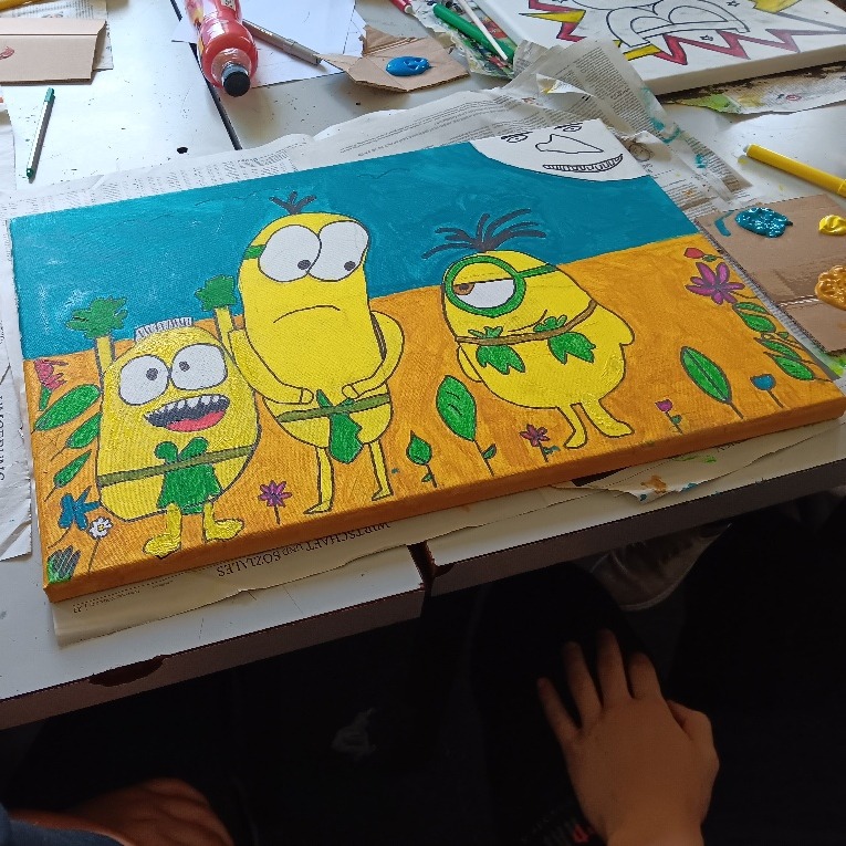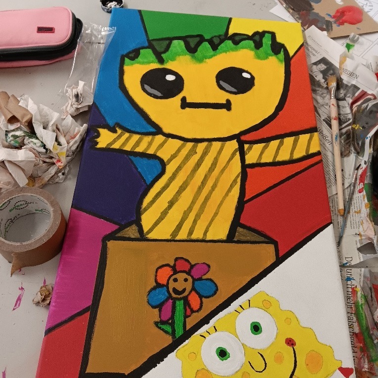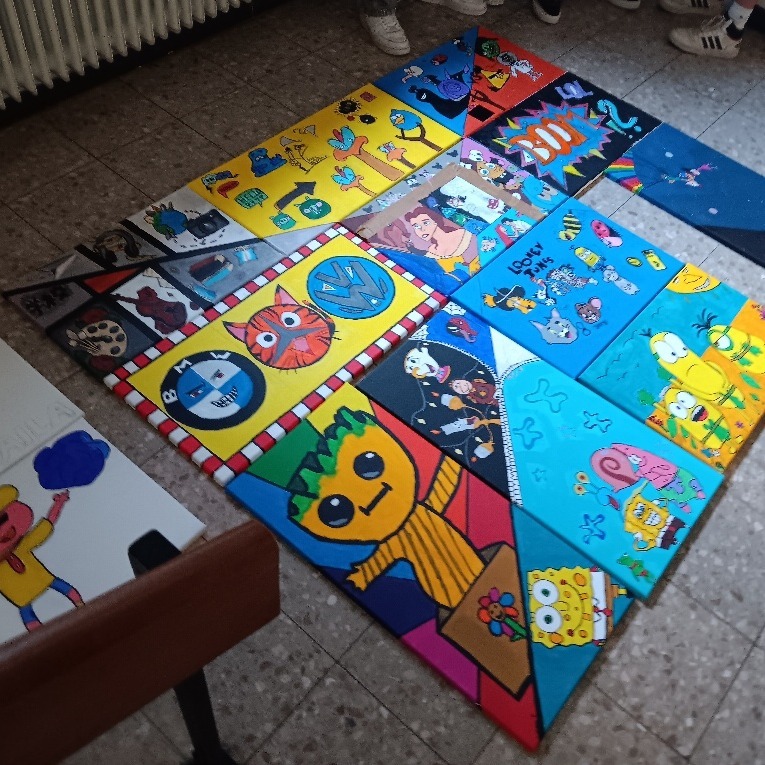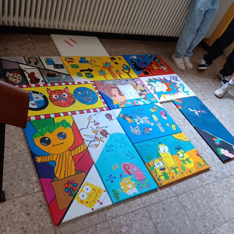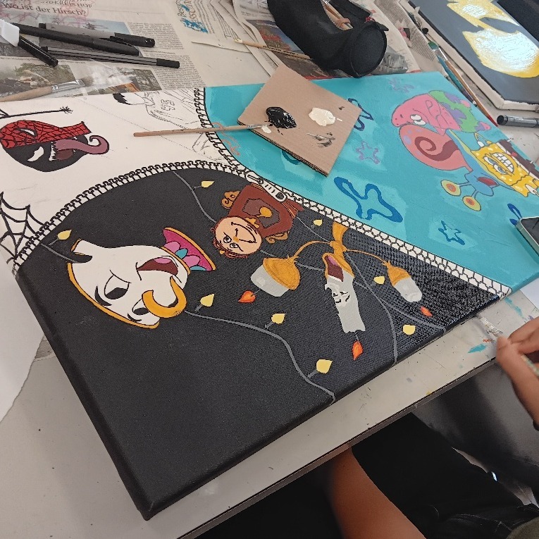 Unser Thema war „Comics“. Wir haben eine riesige Gemeinschaftsarbeit erstellt, bei der wir die Leinwände quadratisch aneinandergelegt und eine zentrale Perspektive gezeichnet haben. Innerhalb dieser Linien hatten die Schüler völlige Freiheit, ihre Ideen zu zeichnen und zu malen. Das Endergebnis: Ein fantastisches, buntes Wandbild, das die Kreativität jedes Einzelnen zeigt! 🎉