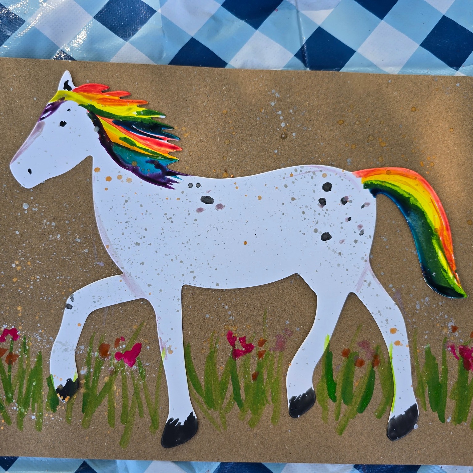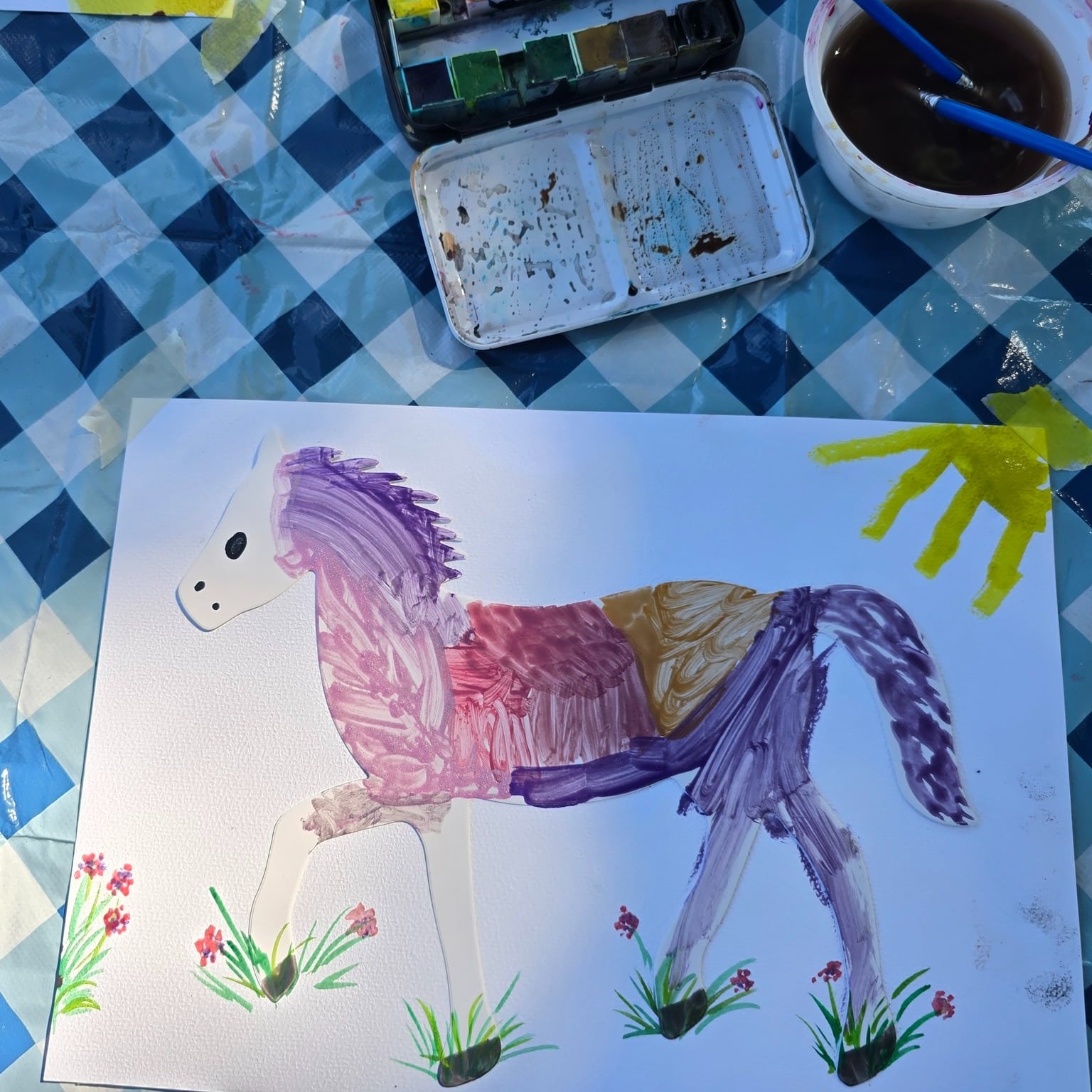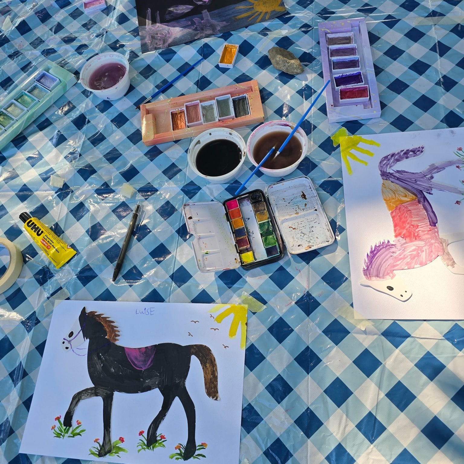 Mit Glitzerfarben und viel Kreativität haben die Kinder aus Papppferden bunte Kunstwerke gestaltet. Jedes Pferd wurde auf einen individuell gestalteten Hintergrund geklebt und die Kinder erzählten begeistert, wo und wie ihre Pferde leben. 🌟