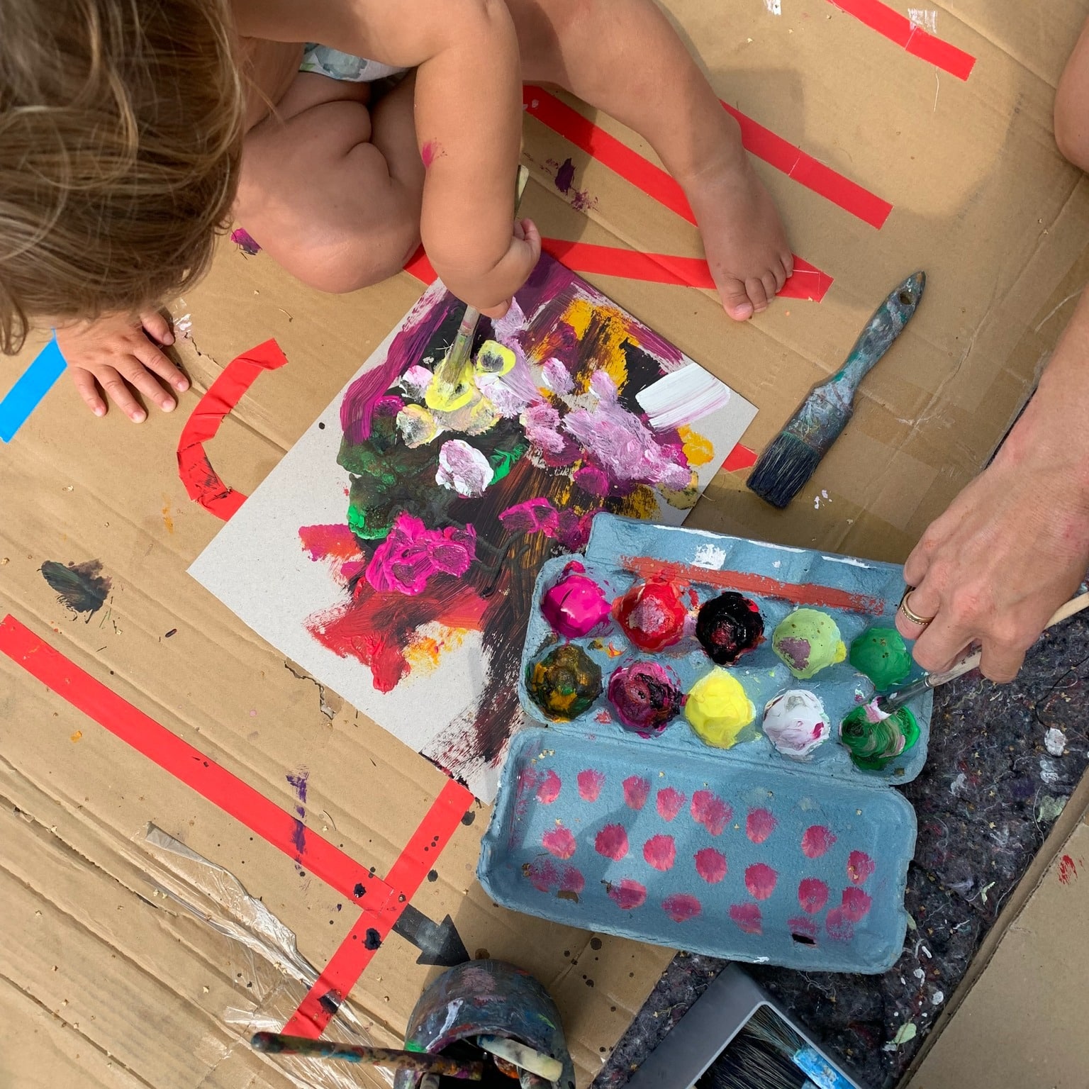 Im Gemeindehaus in Lichtenberg wurde ganz ohne Pinsel gemalt – stattdessen kamen Finger, Spatel, Korken, Folien, Wattestäbchen, Maimesser...