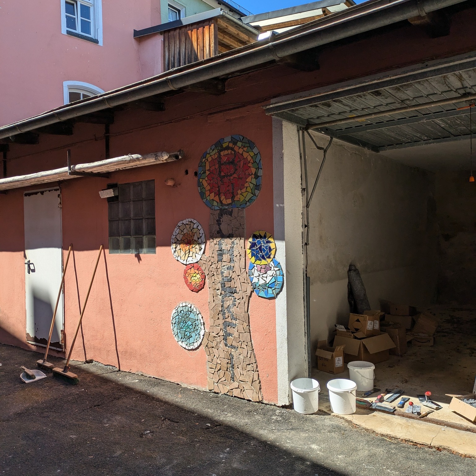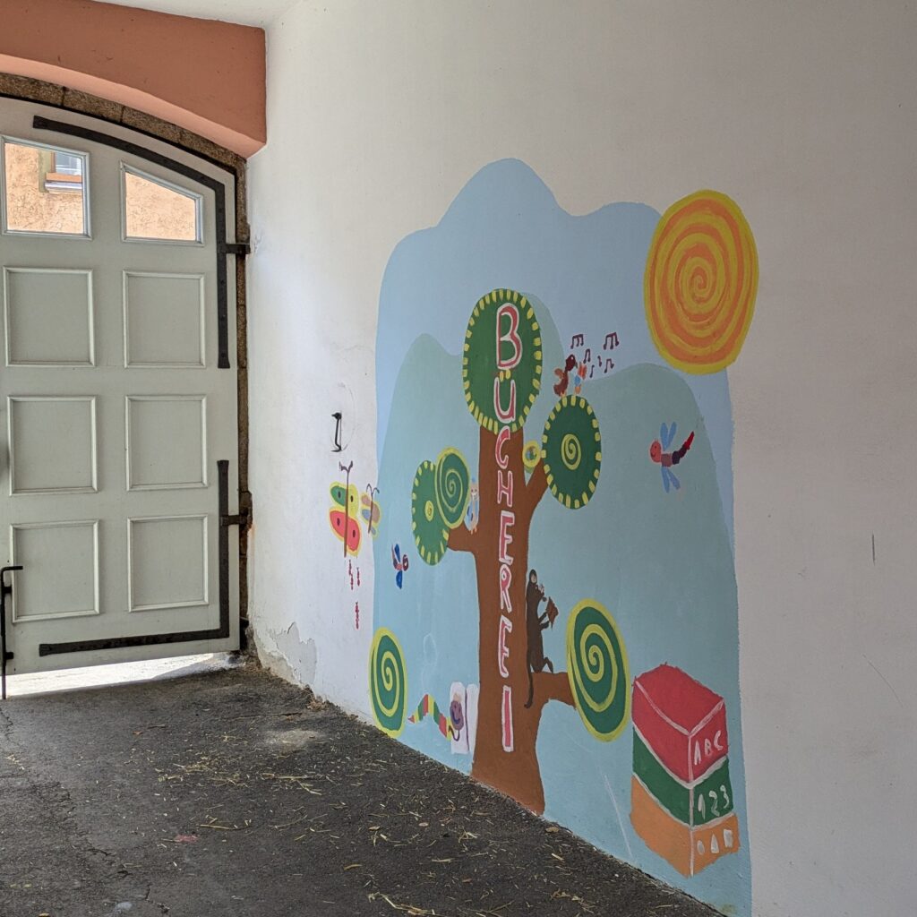 Mit viel Hingabe und Kreativität haben die Kinder das Mosaikprojekt erfolgreich abgeschlossen! 🌿✨ Detailreiche Darstellungen von Bäumen, Sträuchern, einem Bücherwurm, einem Buch und einer Libelle bringen das Kunstwerk zum Strahlen. Ein Teil wurde bereits verfugt, wodurch die Farben noch kräftiger zur Geltung kommen.