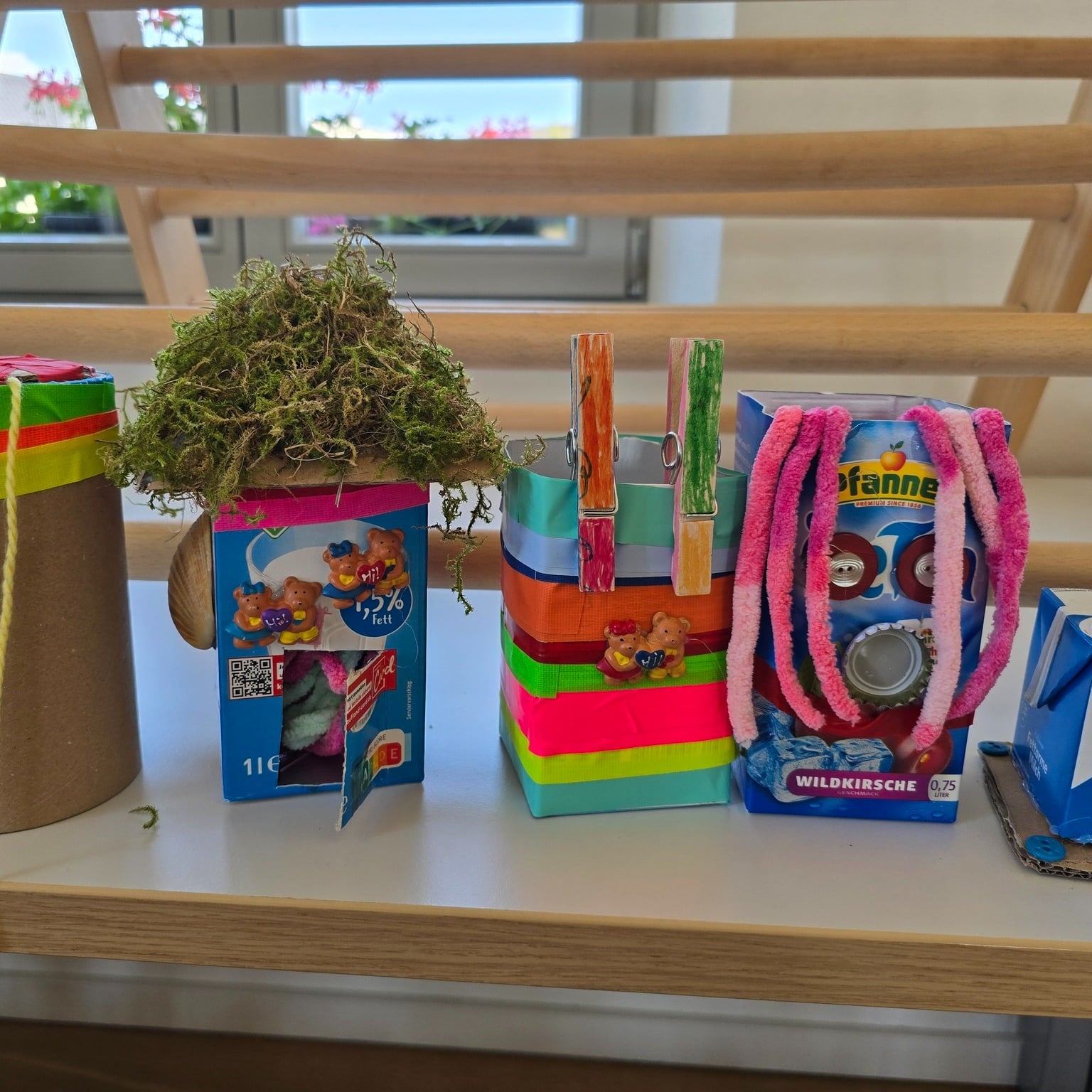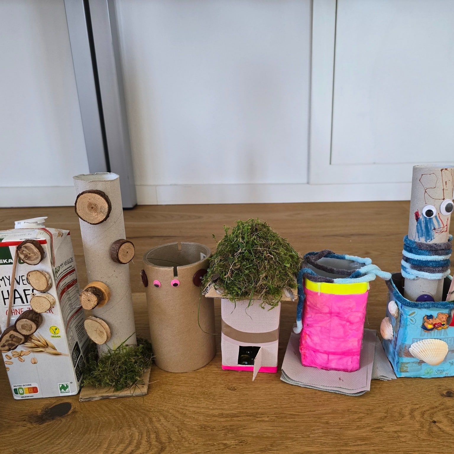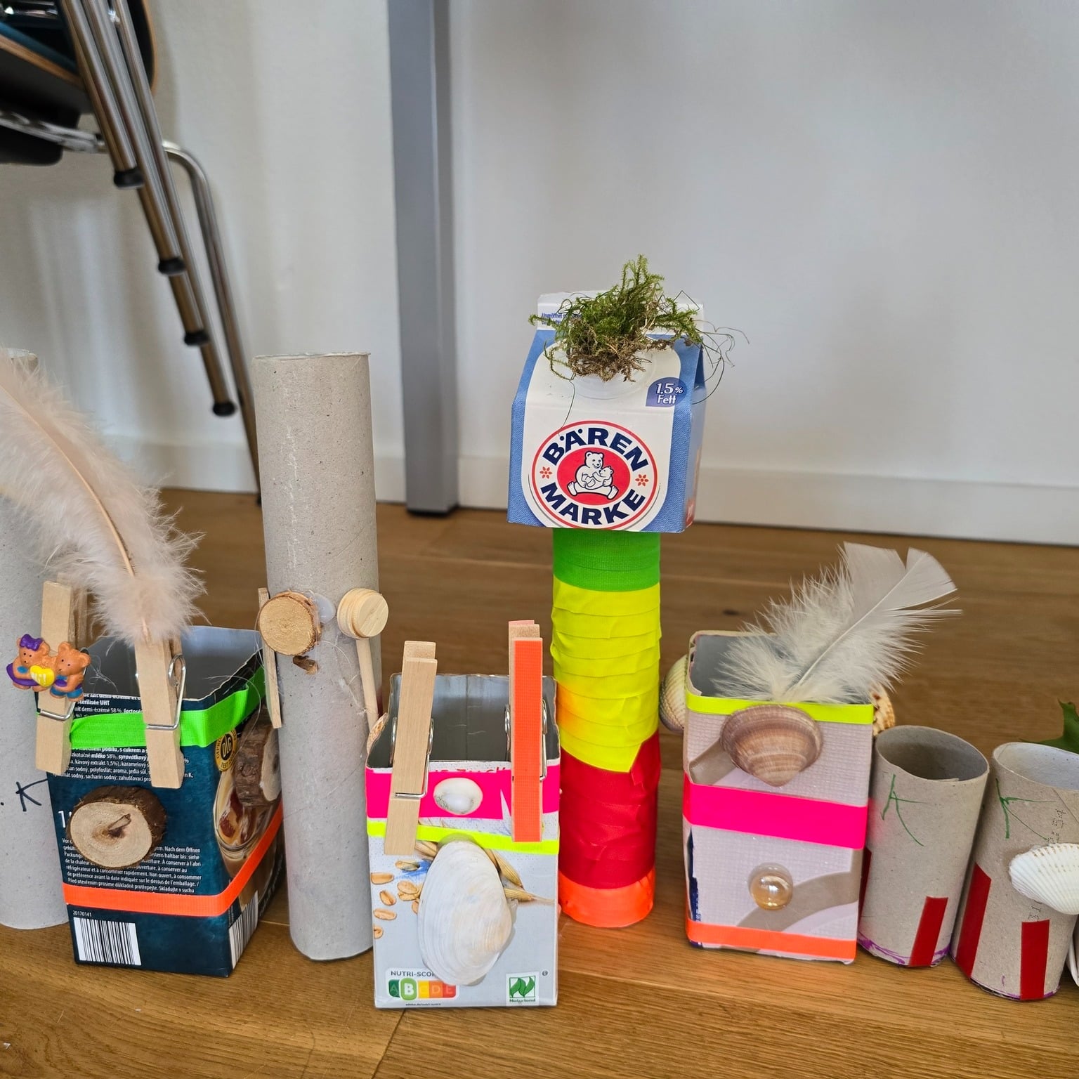 Mit viel Fantasie verwandelten die Kinder die Tetrapacks in bunte Häuser mit Fenstern, Türen und Dächern, die sie mit Deko, Schnur und gesammelten Naturmaterialien wie Moos und Blättern verzierten. 🏡🍃