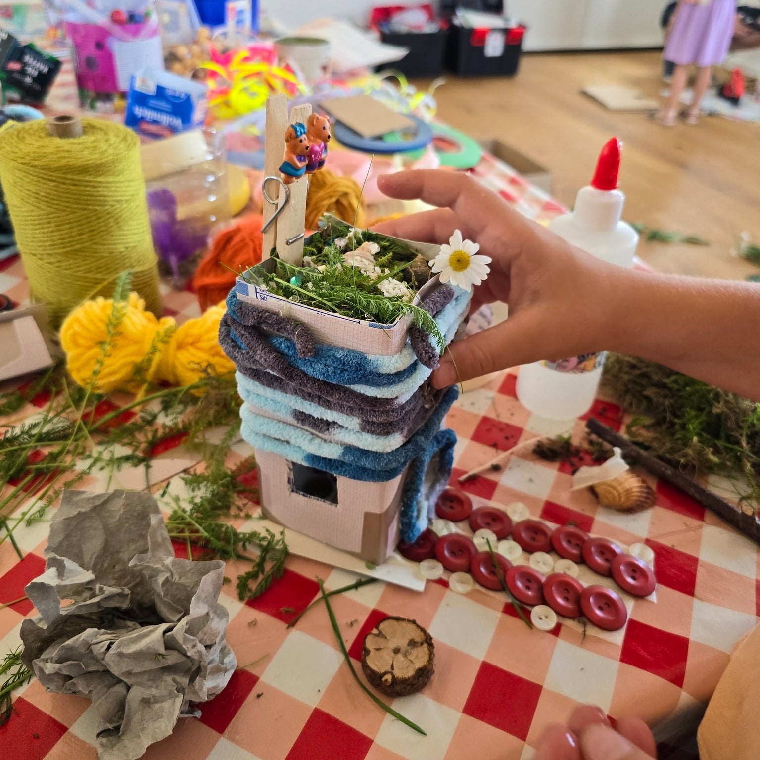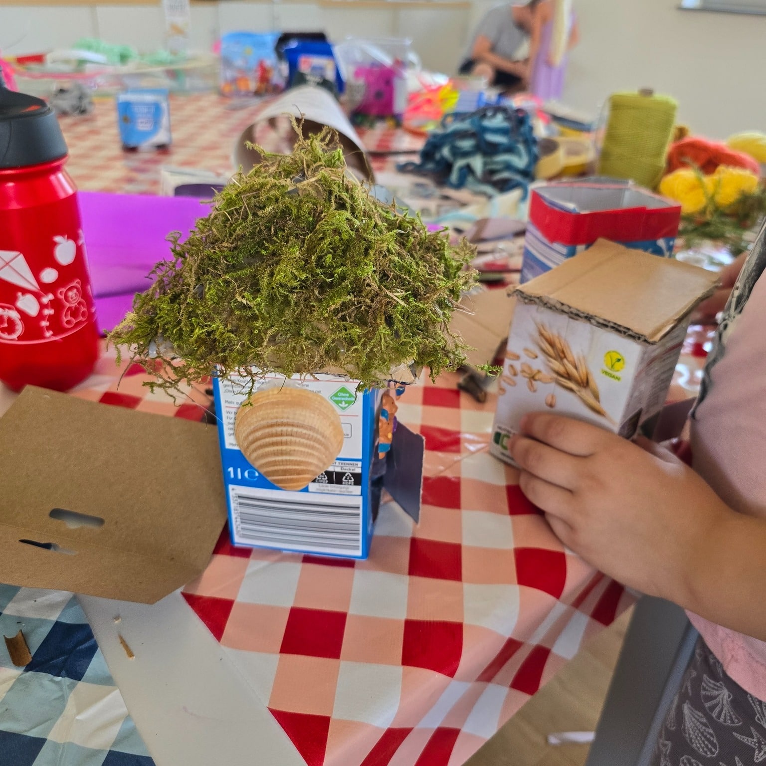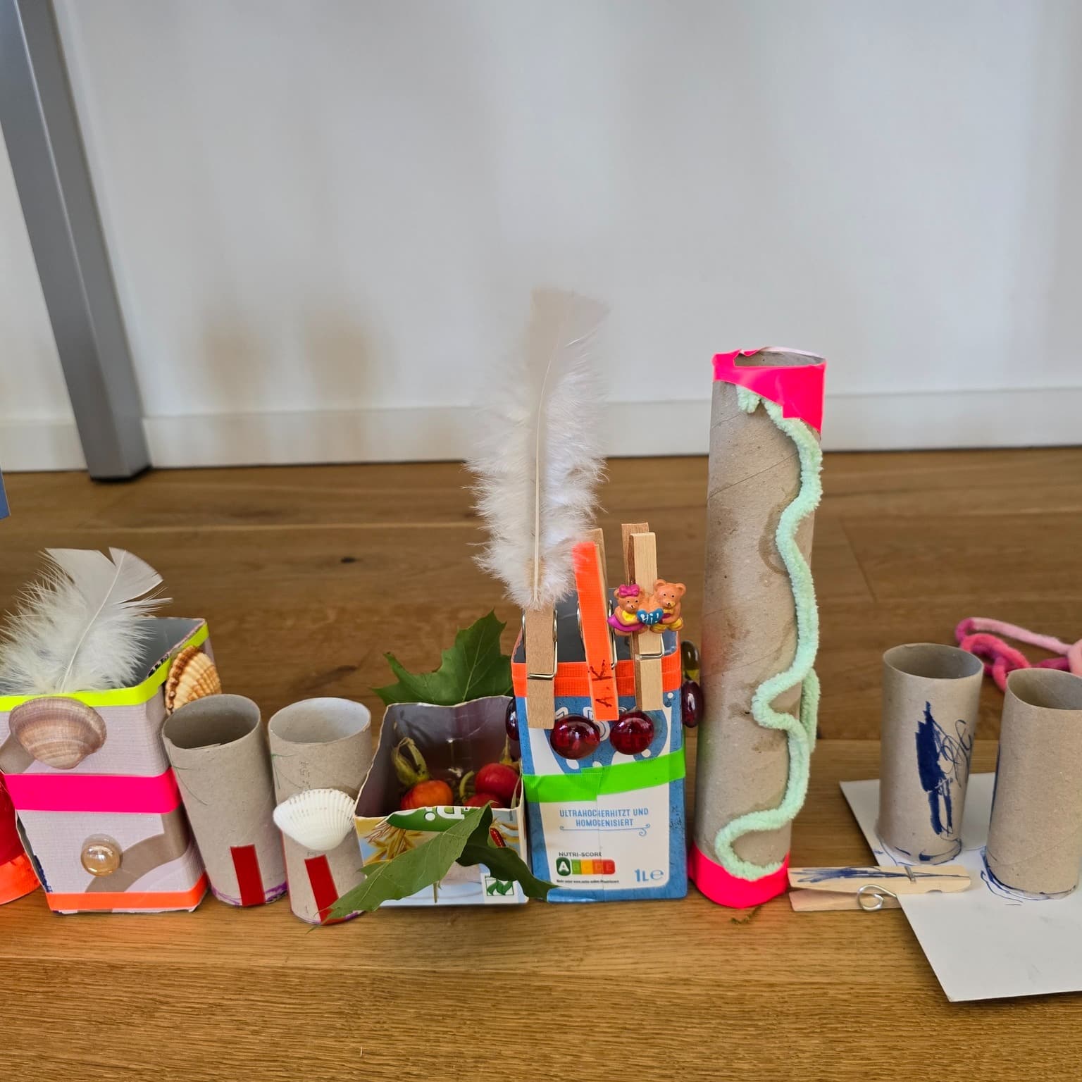 Mit viel Fantasie verwandelten die Kinder die Tetrapacks in bunte Häuser mit Fenstern, Türen und Dächern, die sie mit Deko, Schnur und gesammelten Naturmaterialien wie Moos und Blättern verzierten. 🏡🍃