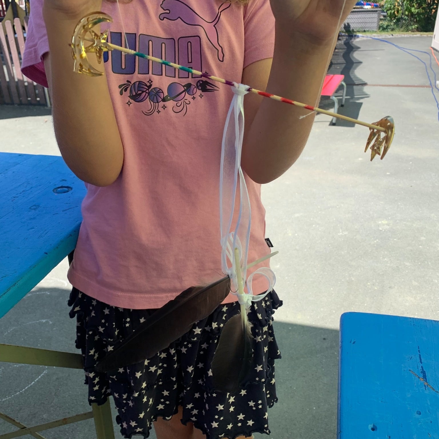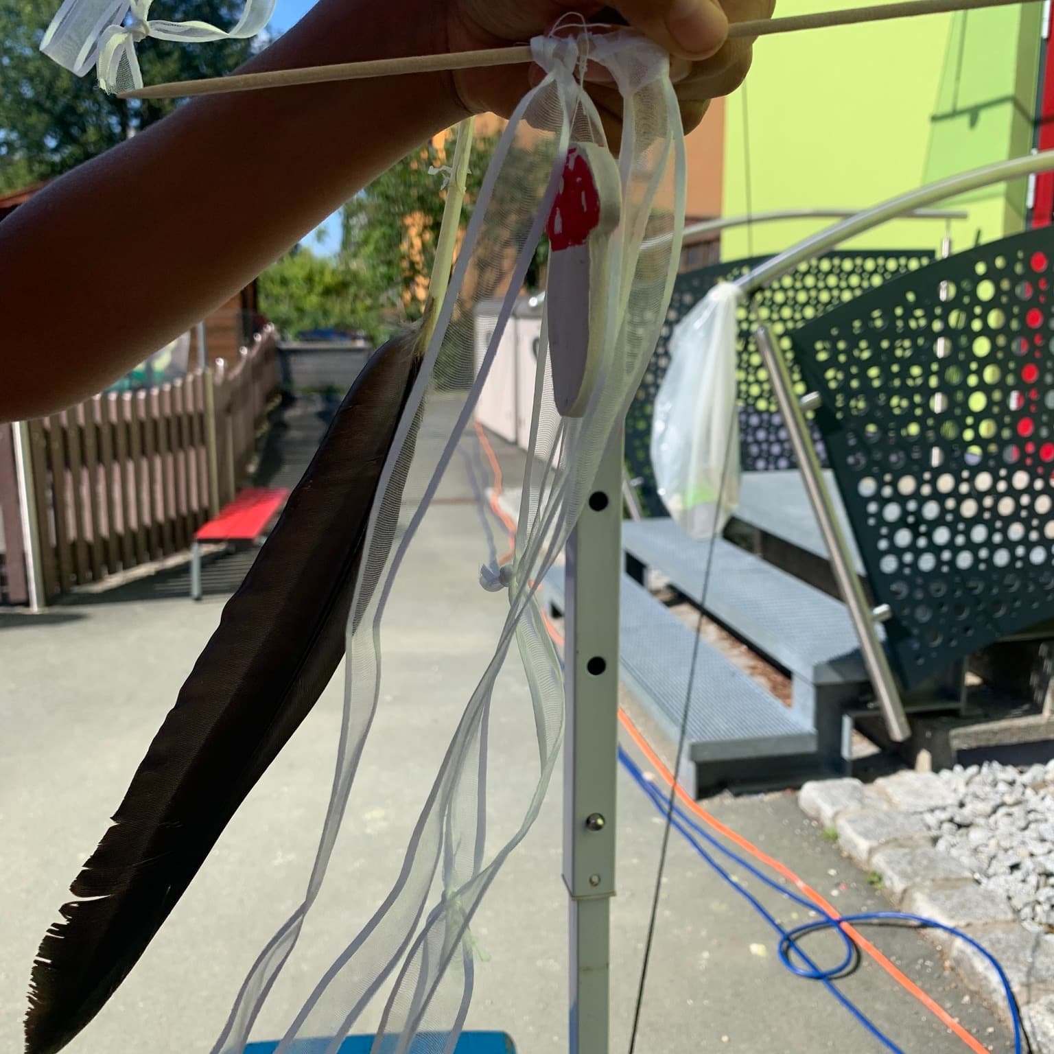 Mit einer Prise Wind und einer Menge Kreativität sind wunderschöne Himmelswesen entstanden! Federn, Schnüre und Perlen baumeln an bunten Holzstäben und tanzen fröhlich im Wind. 🎨✨ Die Kinder haben mit viel Freude diese verspielten Figuren erschaffen, die nun in der Luft schweben und das bunte Treiben des Tages widerspiegeln. Ein perfektes Zusammenspiel von Natur und Kunst! 🌿🪶