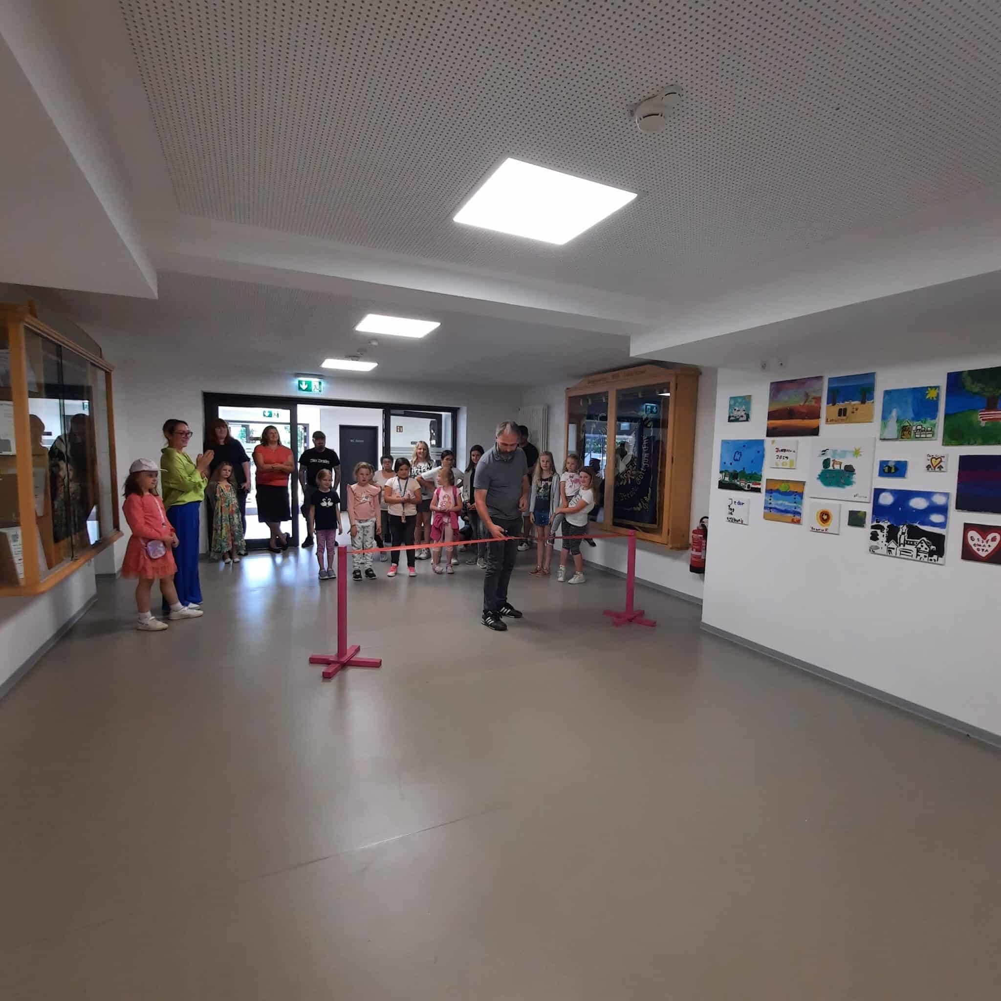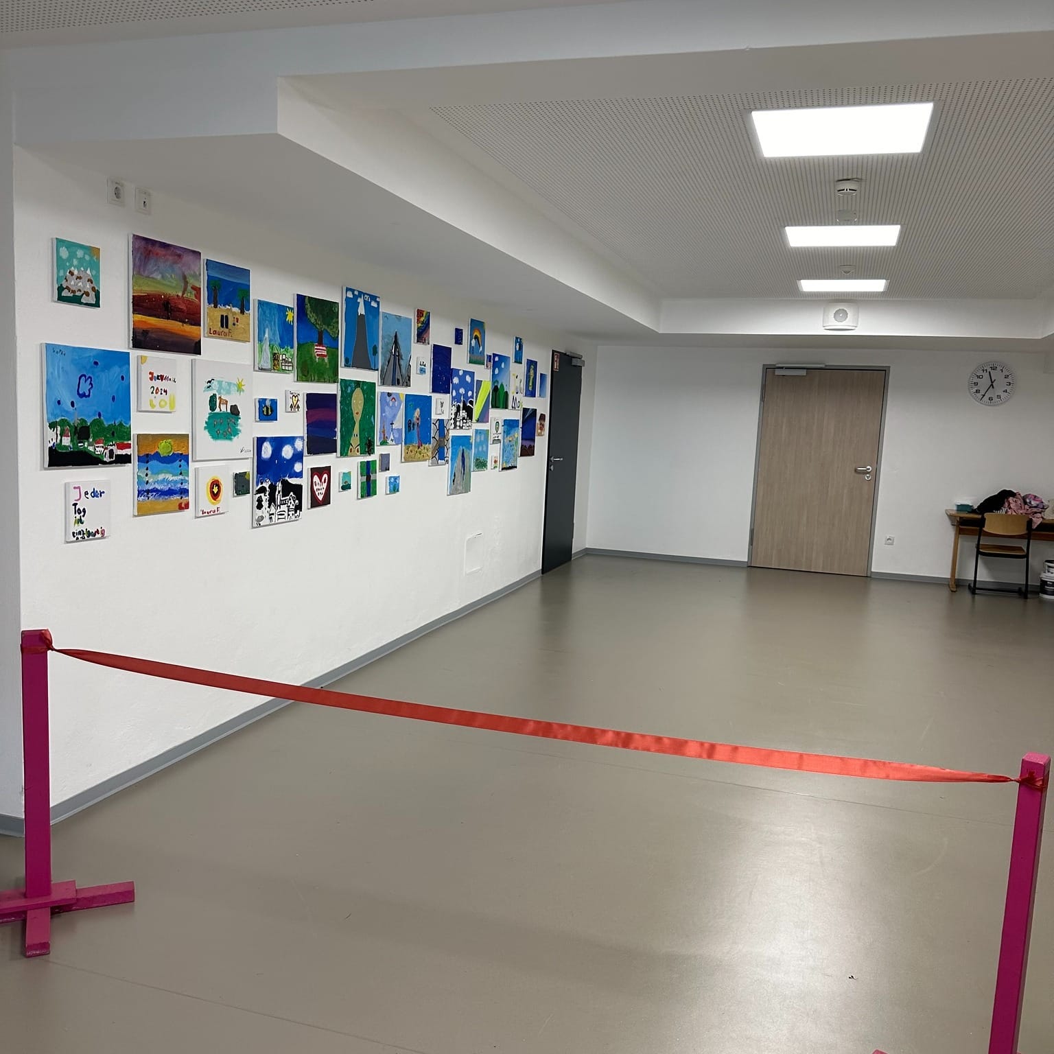 Zum krönenden Abschluss haben wir eine Kinder Kunstgalerie eröffnet – natürlich mit einer feierlichen roten Schleife! 🎀 Der Bürgermeister war da, und alle waren so stolz auf das, was wir gemeinsam erreicht haben. Ein wunderbarer Moment für alle Beteiligten! 👏🌟