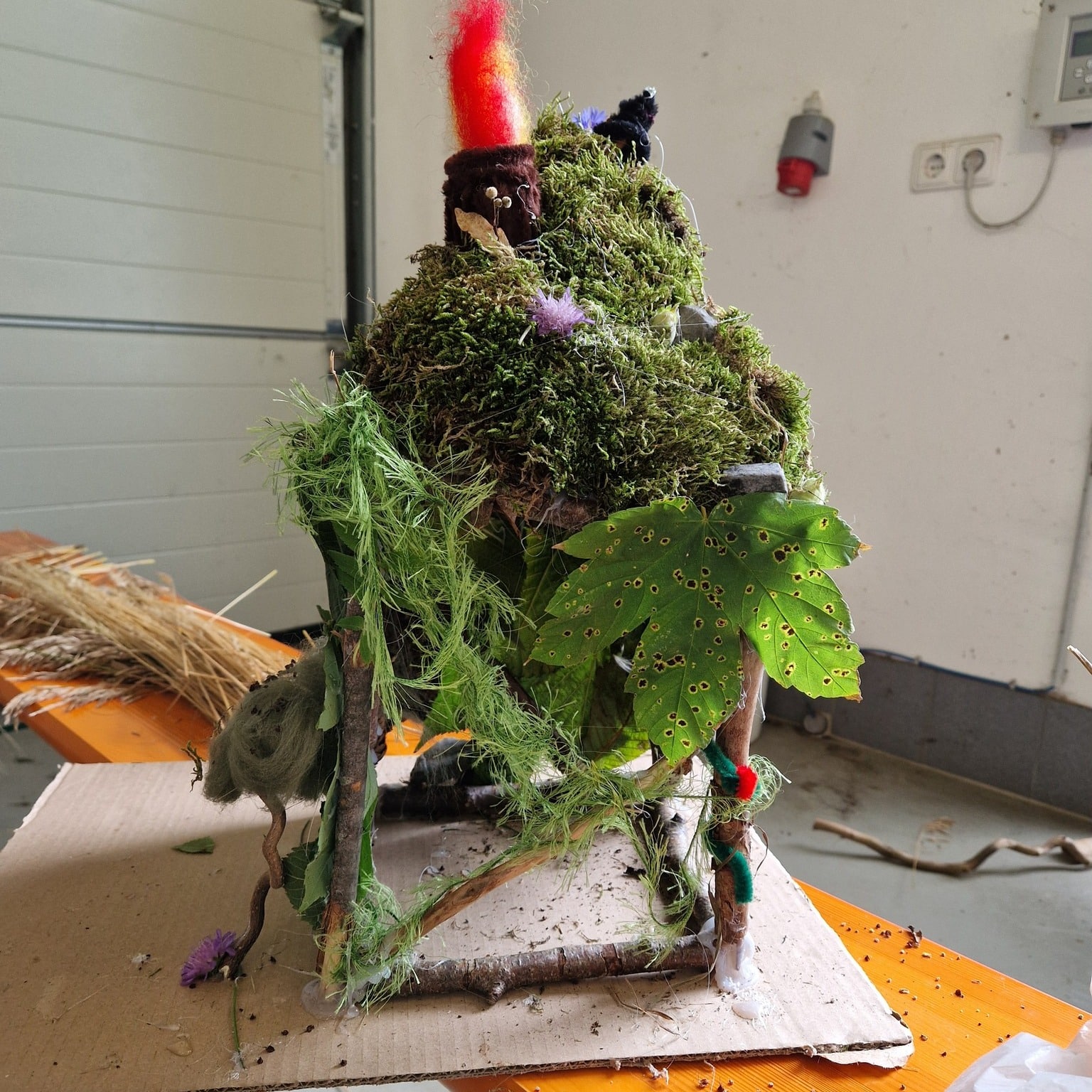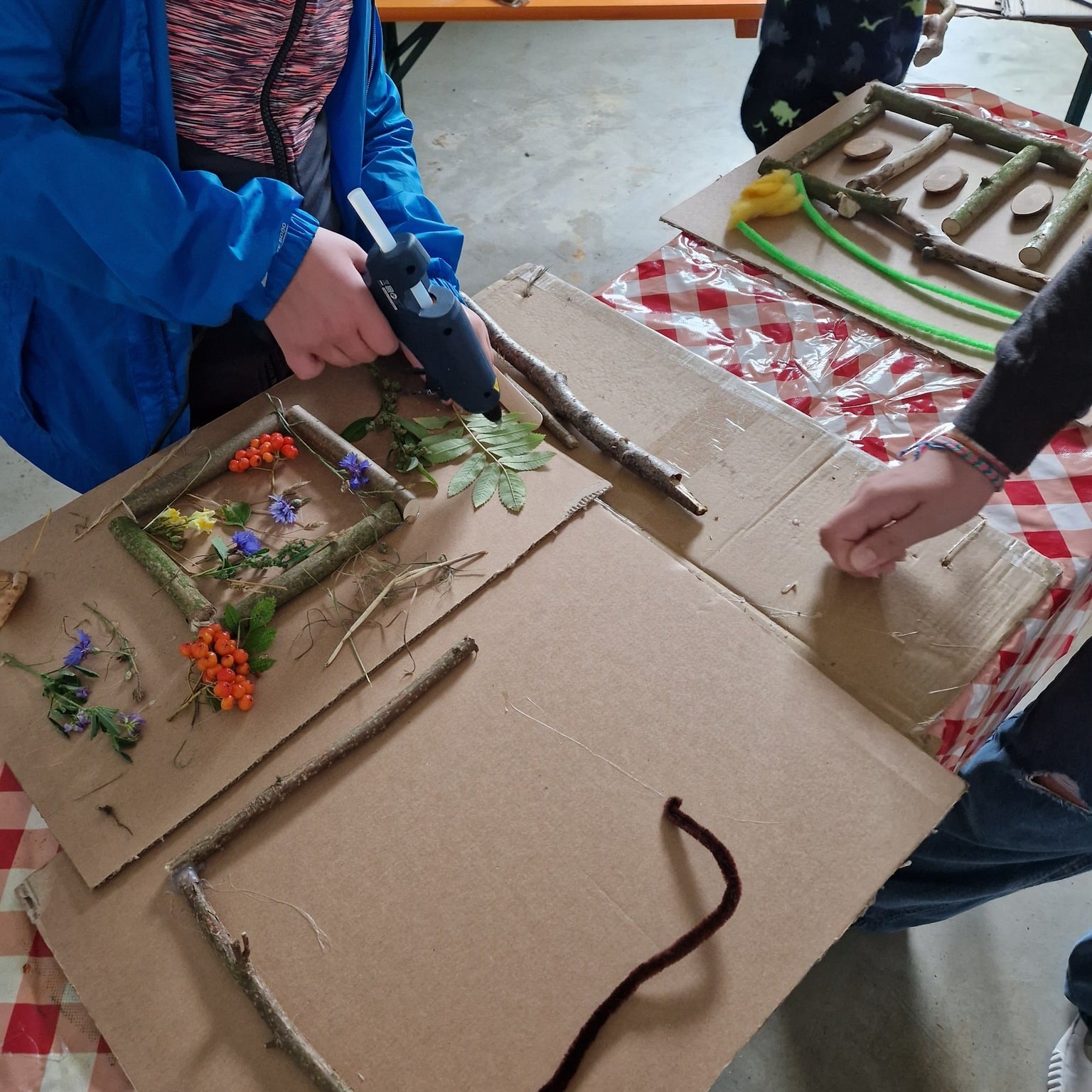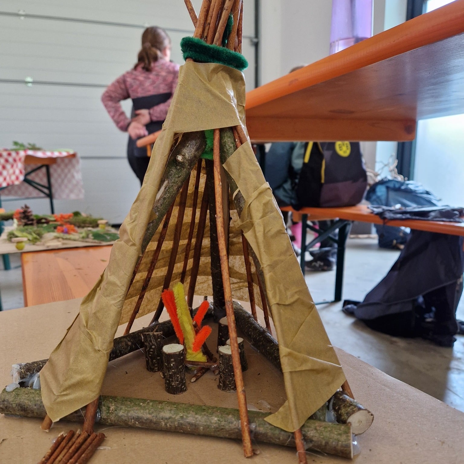 Aus den gesammelten Schätzen und einigen Materialien aus den JuKu-Vorräten entstanden fantasievolle Kunstwerke – von kleinen Häusern und Gärten über Tipis bis hin zu bunten Legebildern.