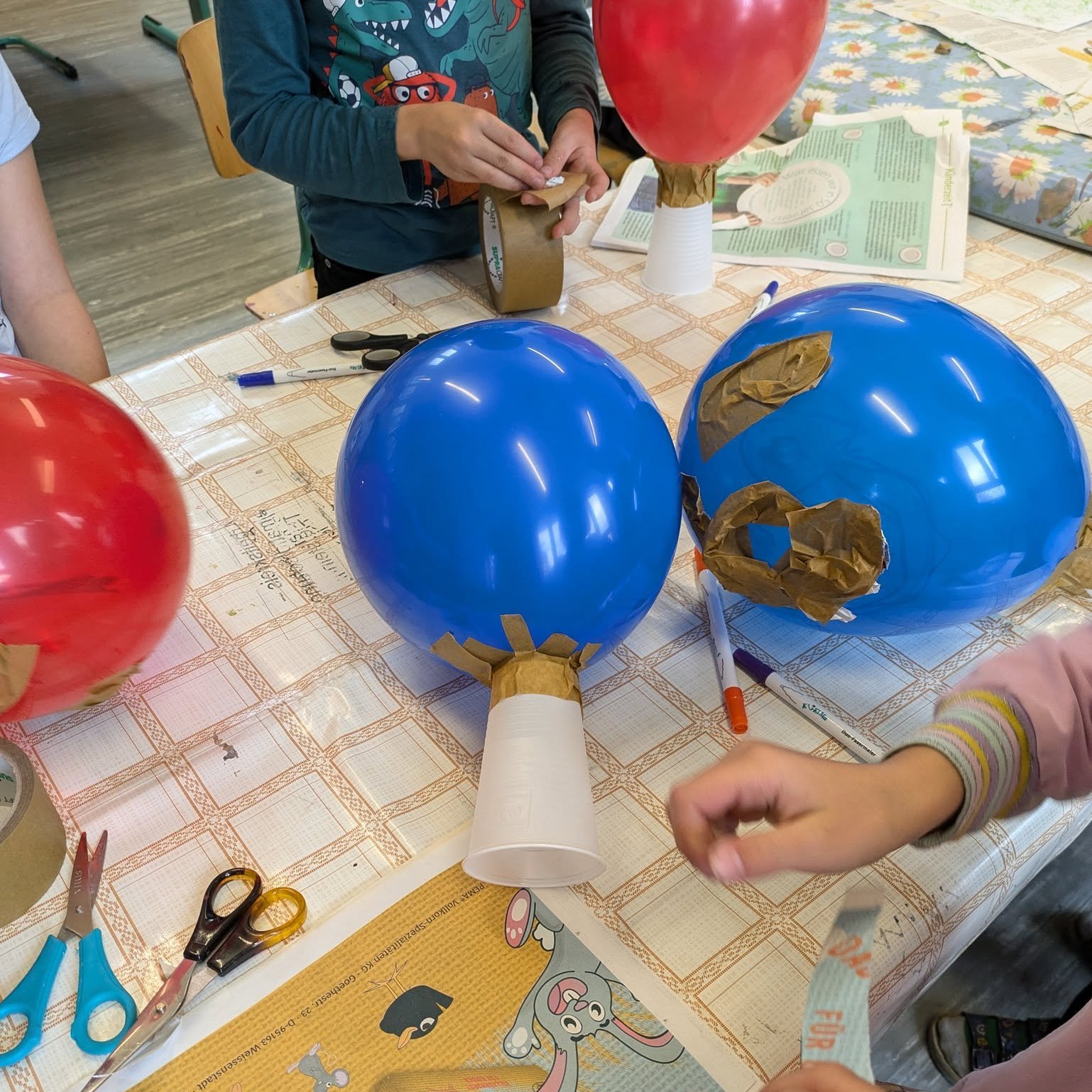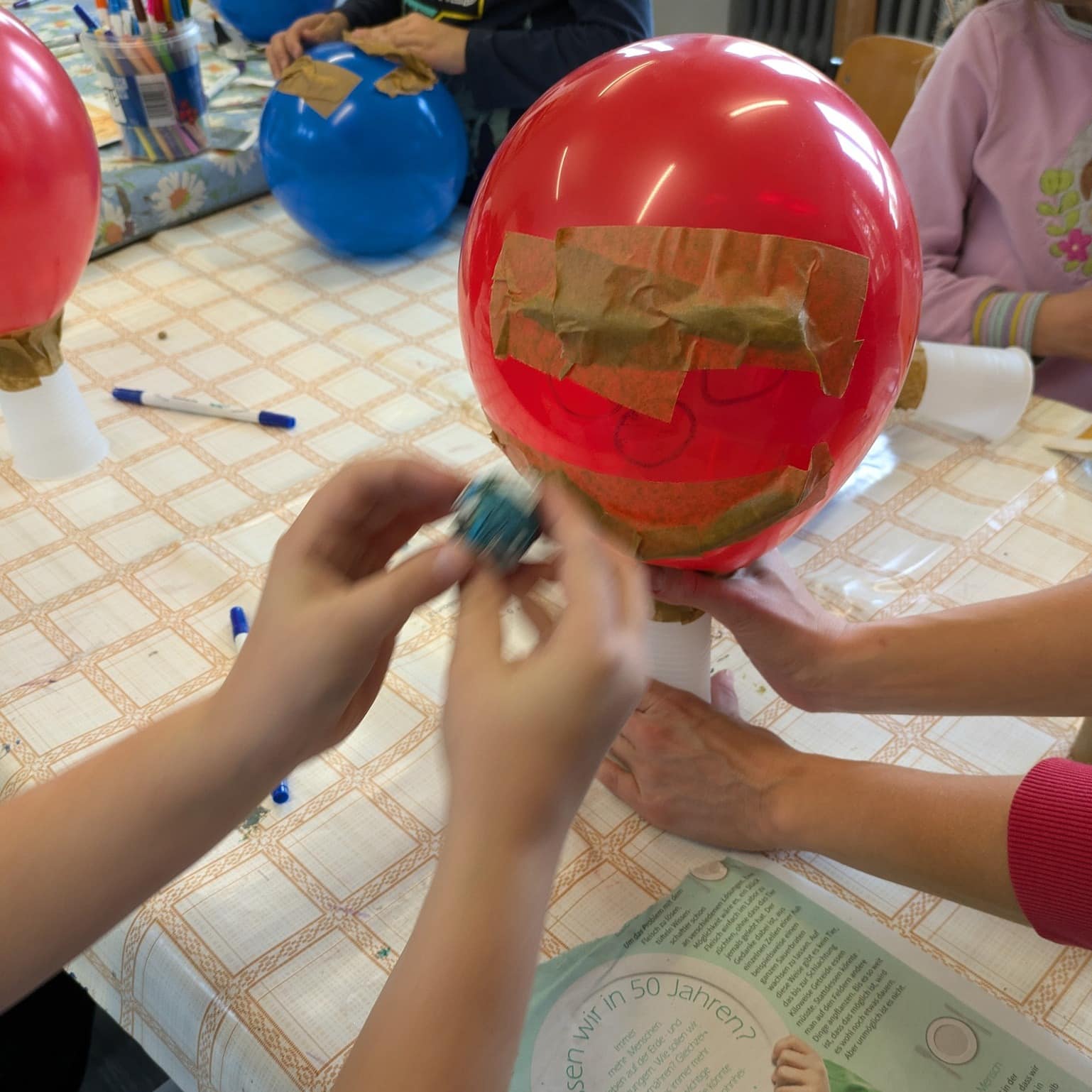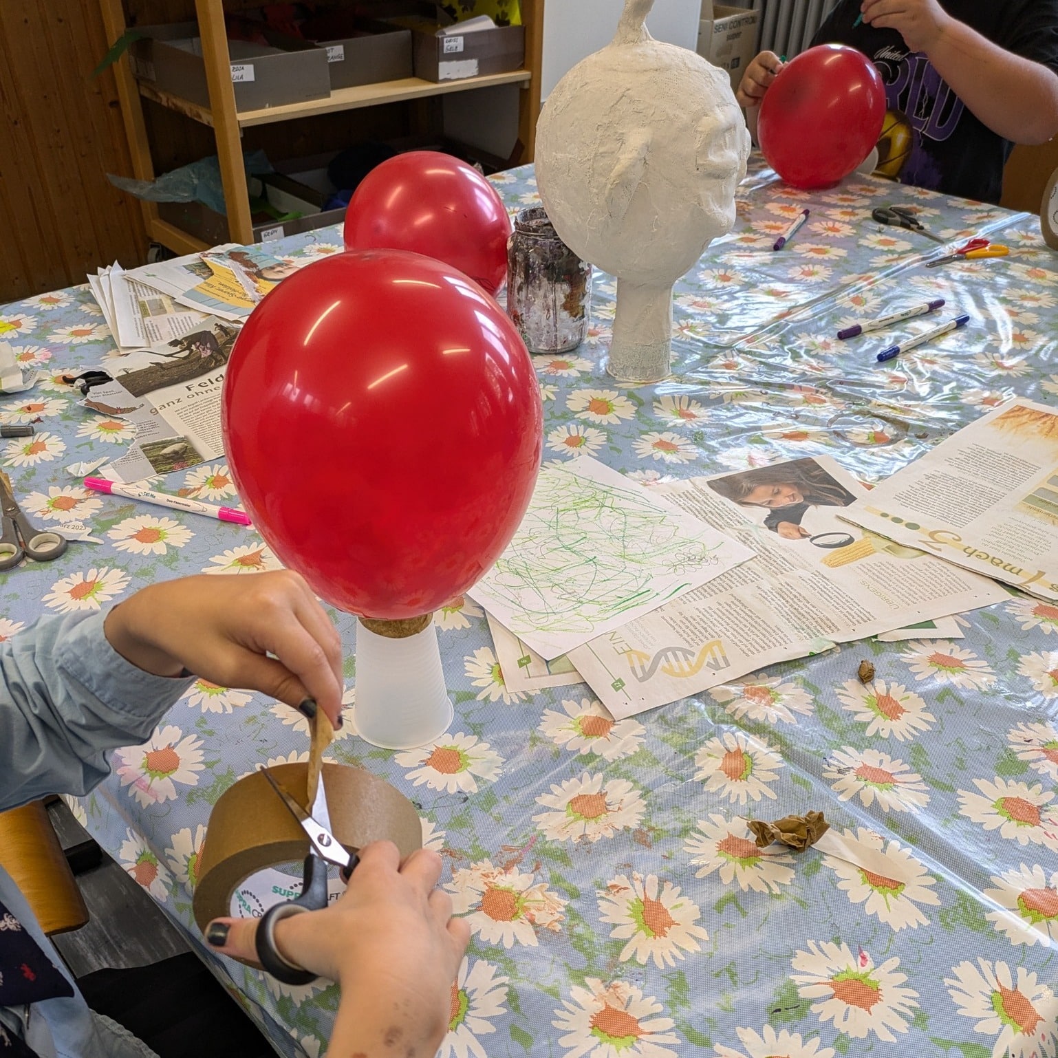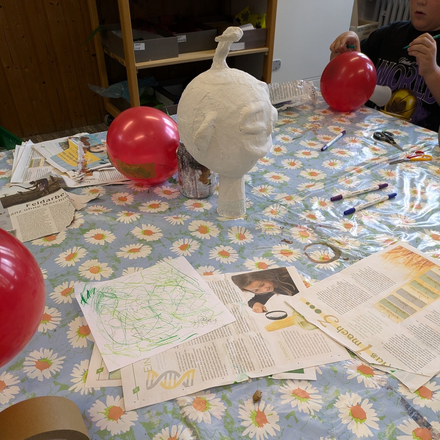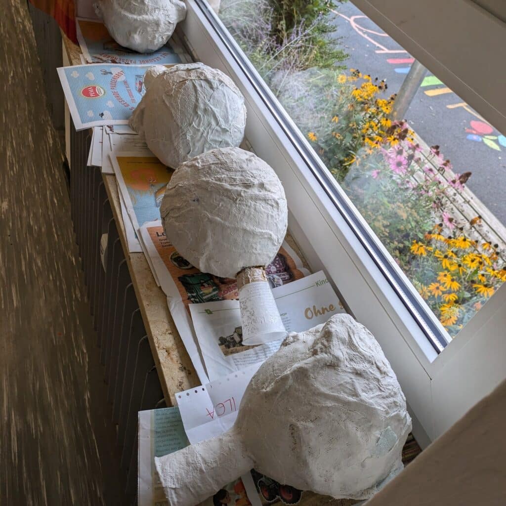 Mit Luftballons, Bechern, Zeitungen und Klebeband entstanden einzigartige Köpfe! 🏺🎨 Nachdem die Grundformen aufgebaut waren, wurden sie mit Gipsbinden stabilisiert – eine spannende Erfahrung für die Kinder! 🤩