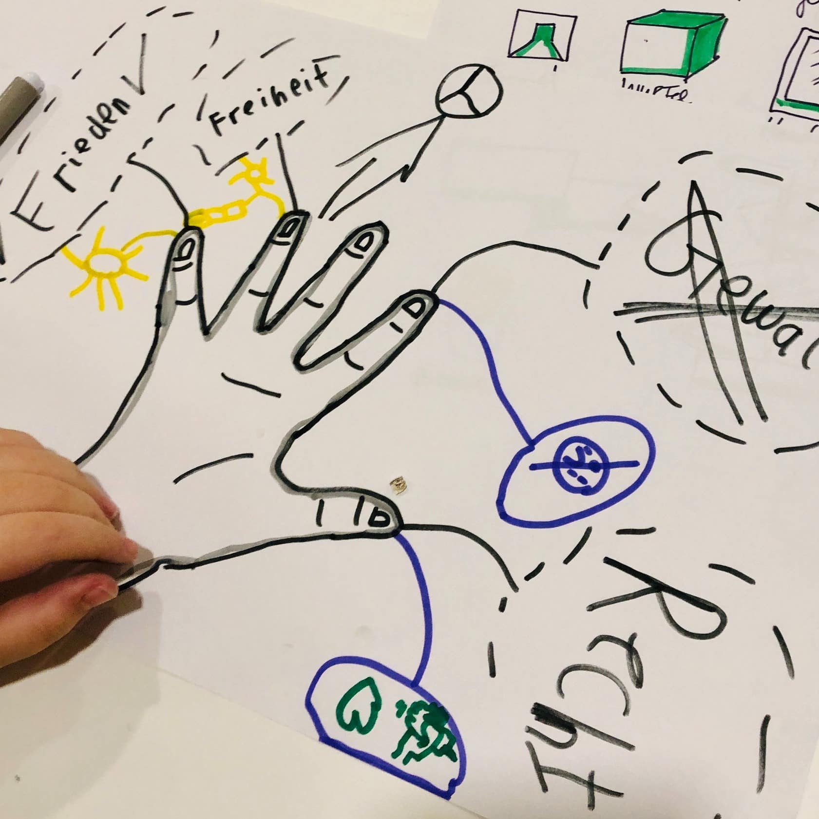 Anhand meiner 5-Finger-Mindmap haben die Jugendlichen mit Sketchnotes kreativ gezeigt, wie man Themen, Symbole und Bedürfnisse visuell ausdrücken kann, statt nur mit Worten. Das Lob für die kreative Arbeit und den neuen Blick auf Demokratie war spürbar und motivierend. 💭✏️