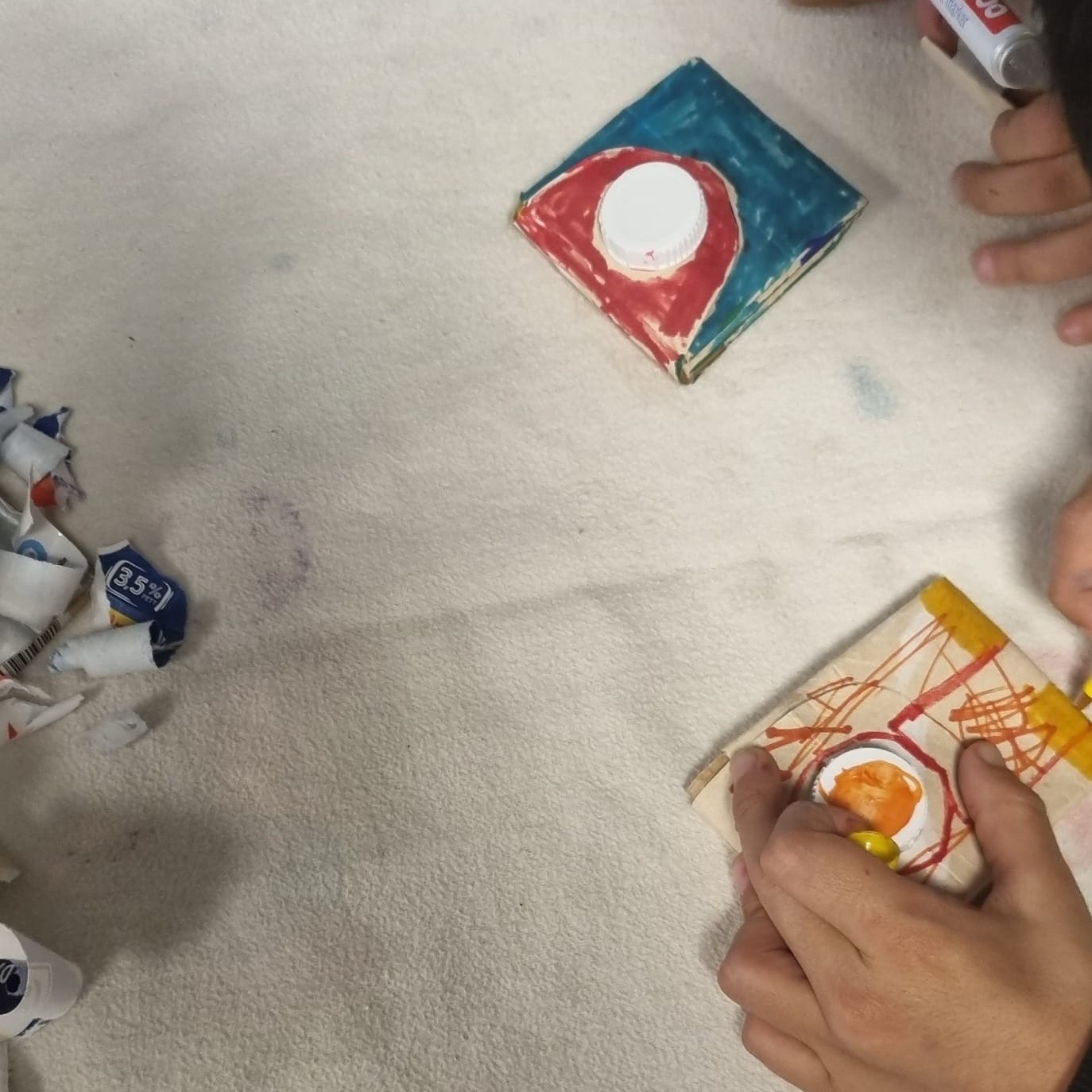 Bei diesem Termin haben die Kinder herausgefunden, dass aus Rot und Gelb Orange entsteht, aus Blau und Gelb...