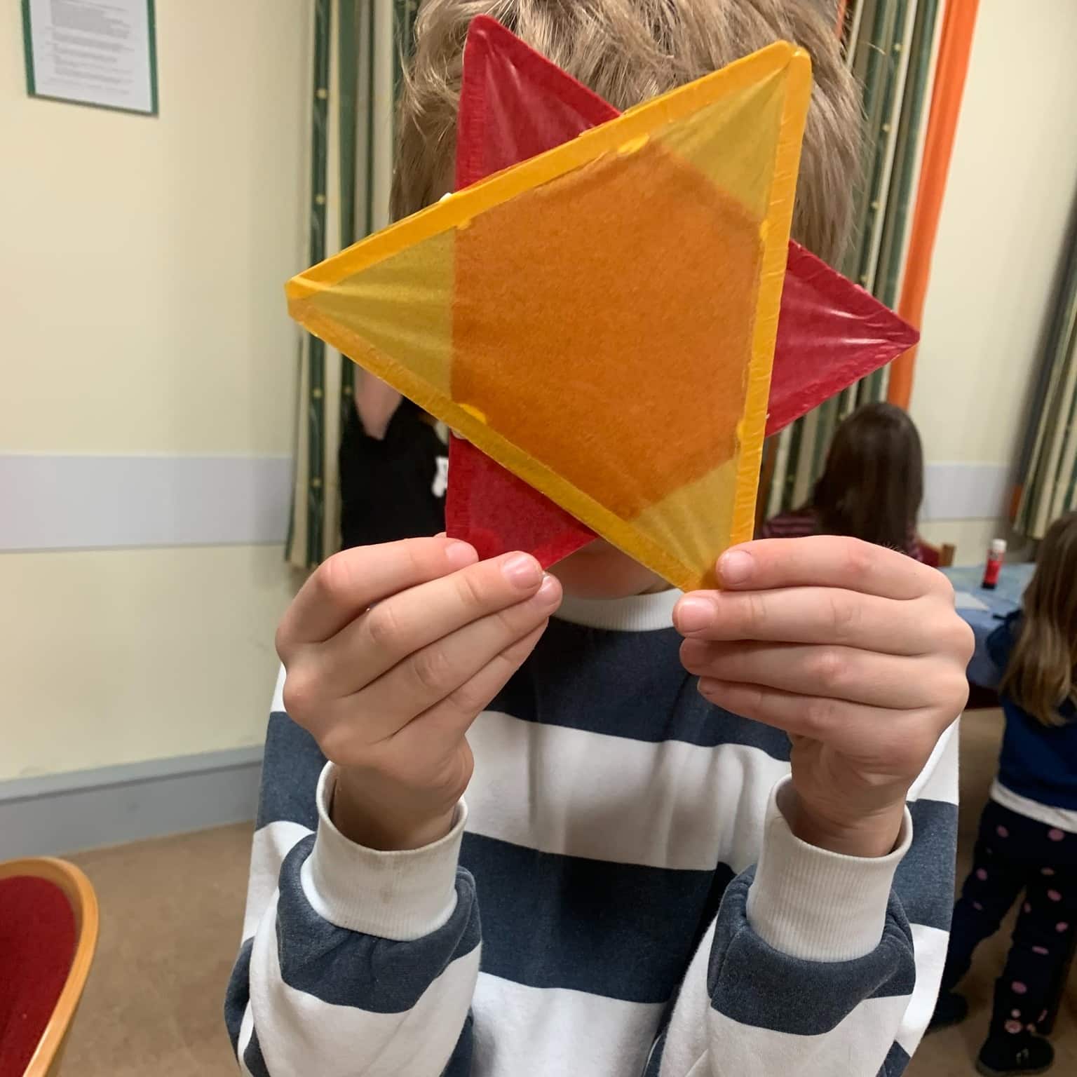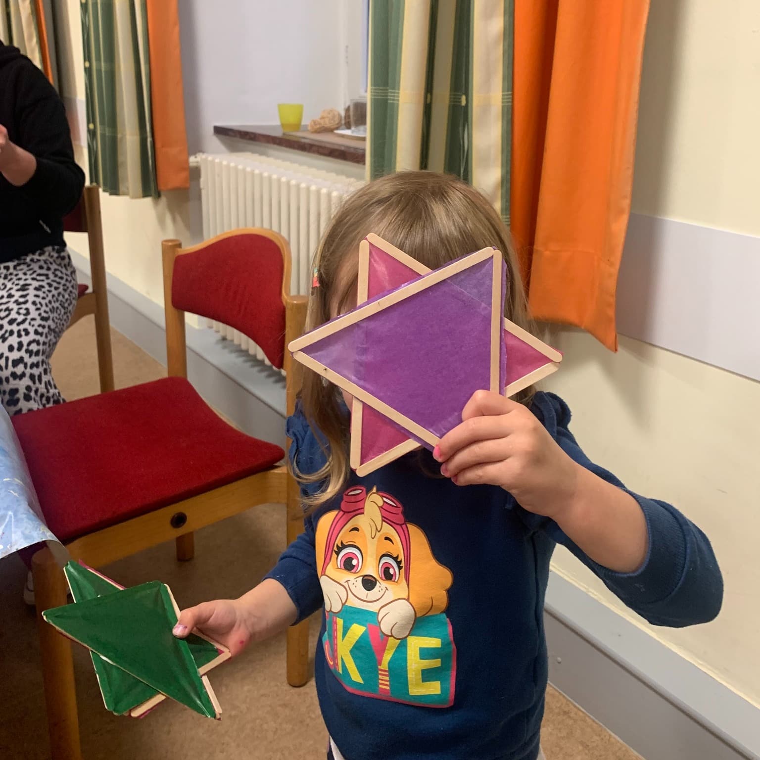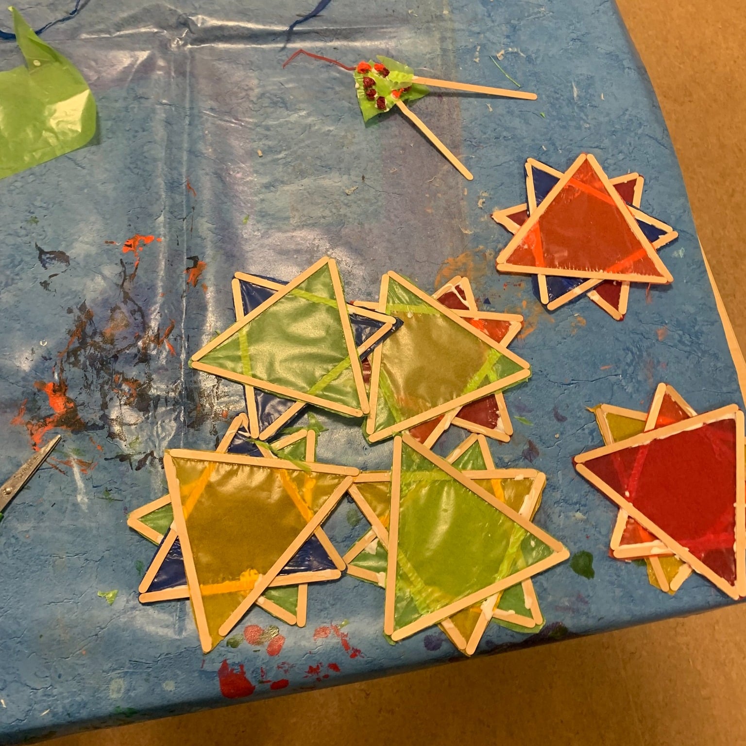 Die Teilnehmenden haben aus zwei Dreiecken, Holzstäbchen und buntem Transparentpapier funkelnde Sterne gestaltet. Mit viel Geduld und Kreativität...