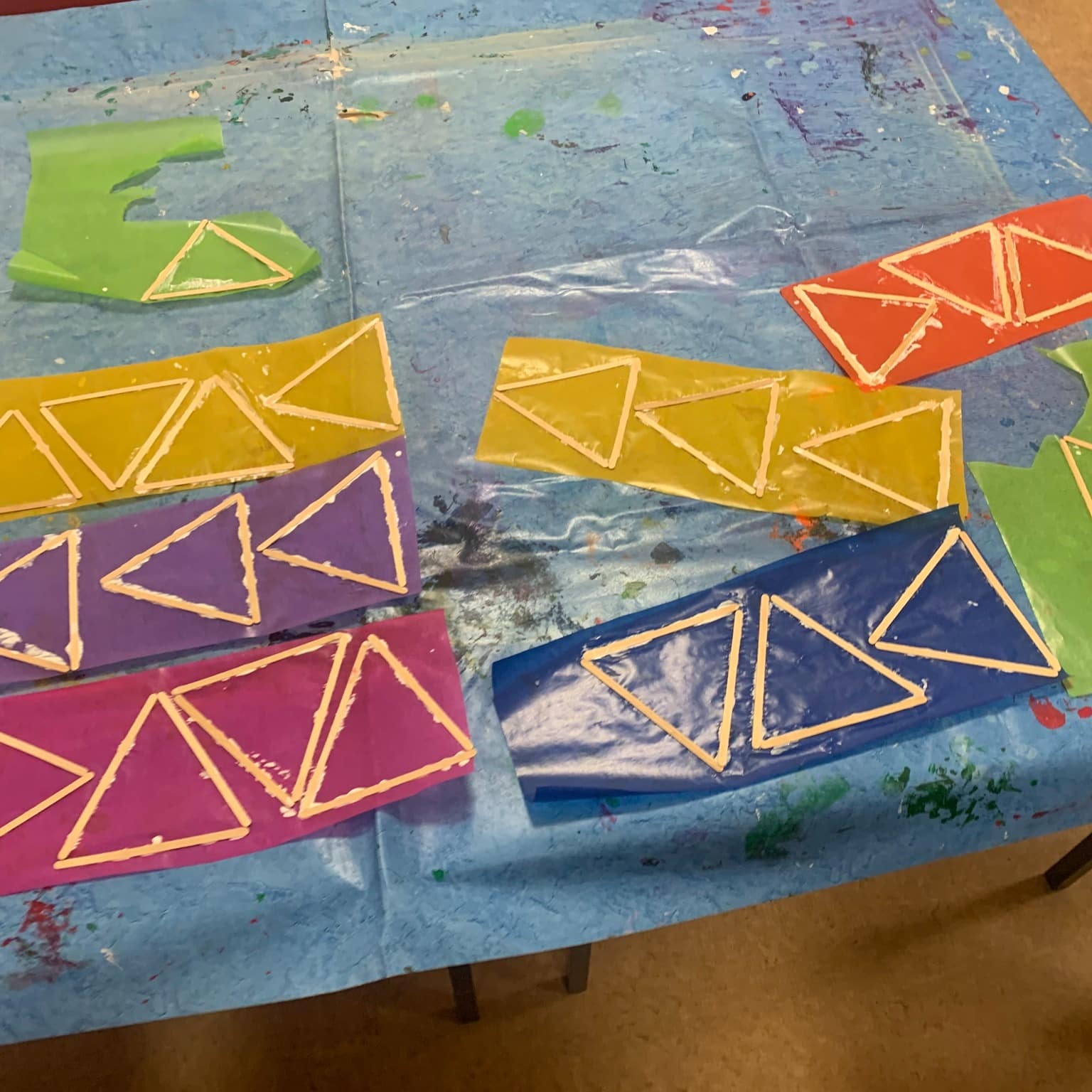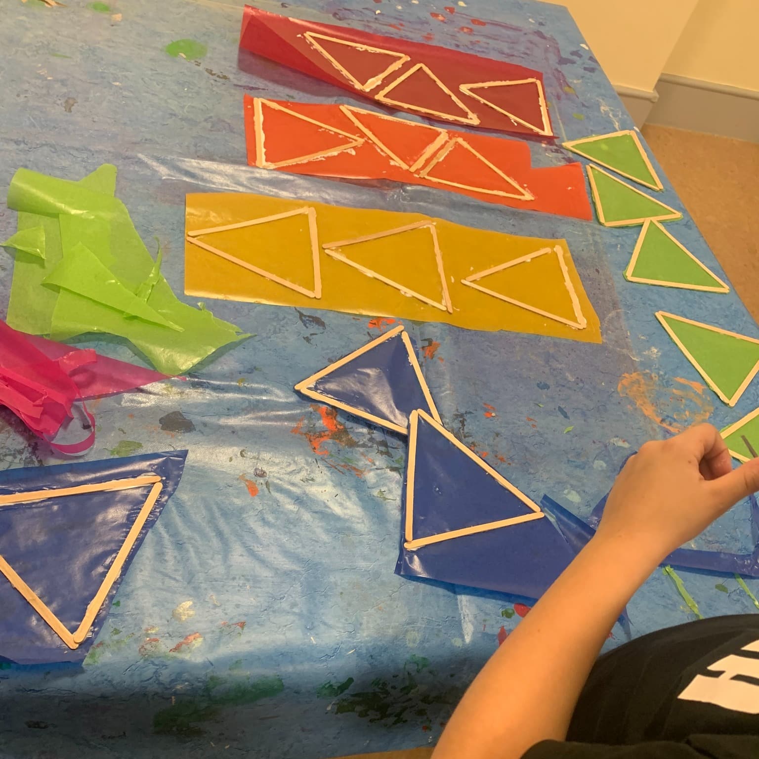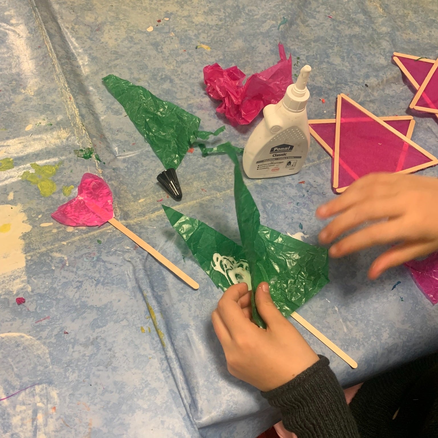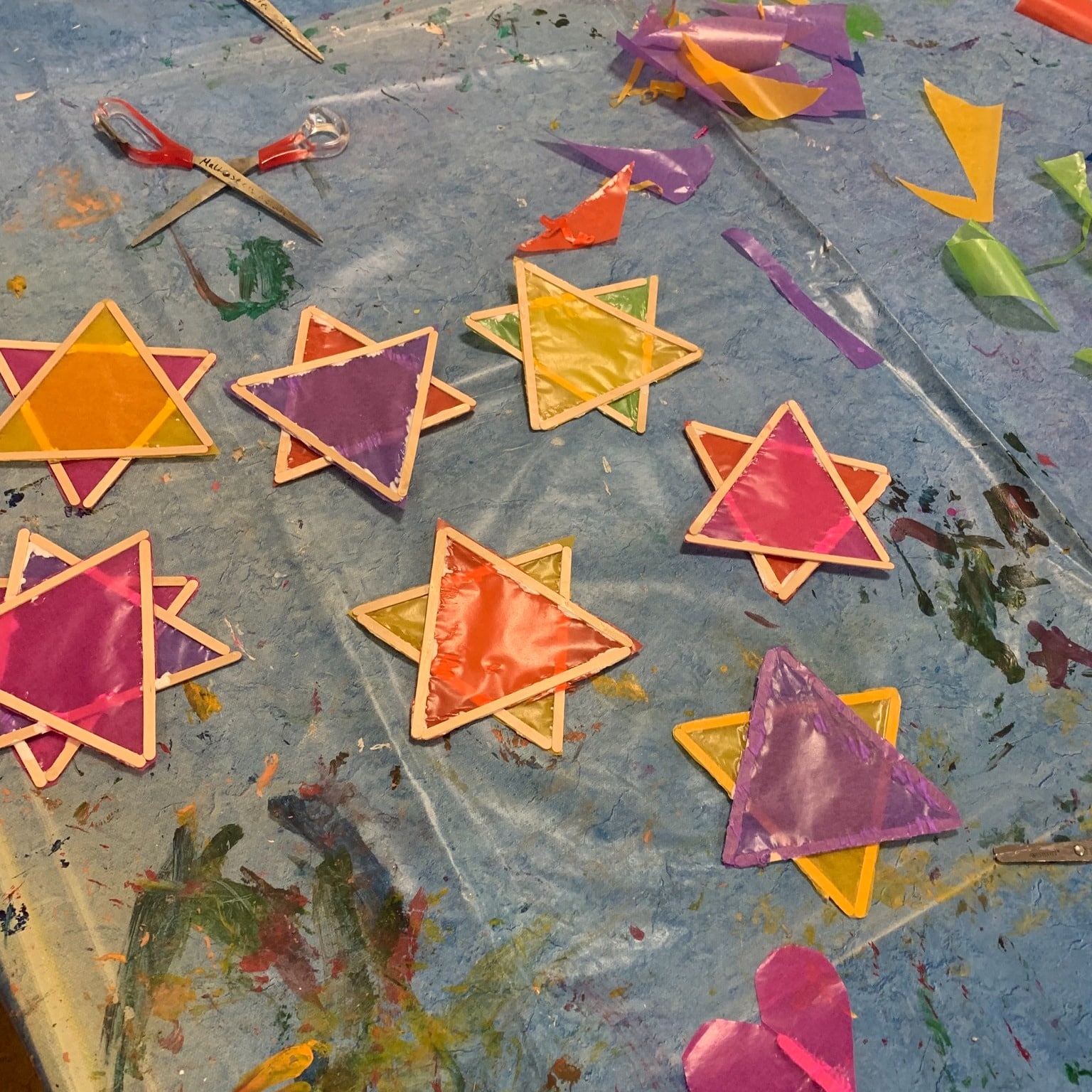 Die Teilnehmenden haben aus zwei Dreiecken, Holzstäbchen und buntem Transparentpapier funkelnde Sterne gestaltet. Mit viel Geduld und Kreativität...