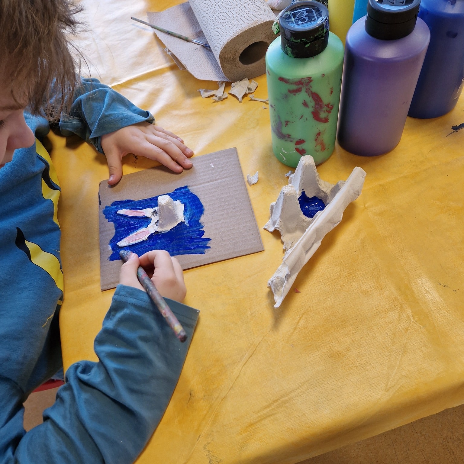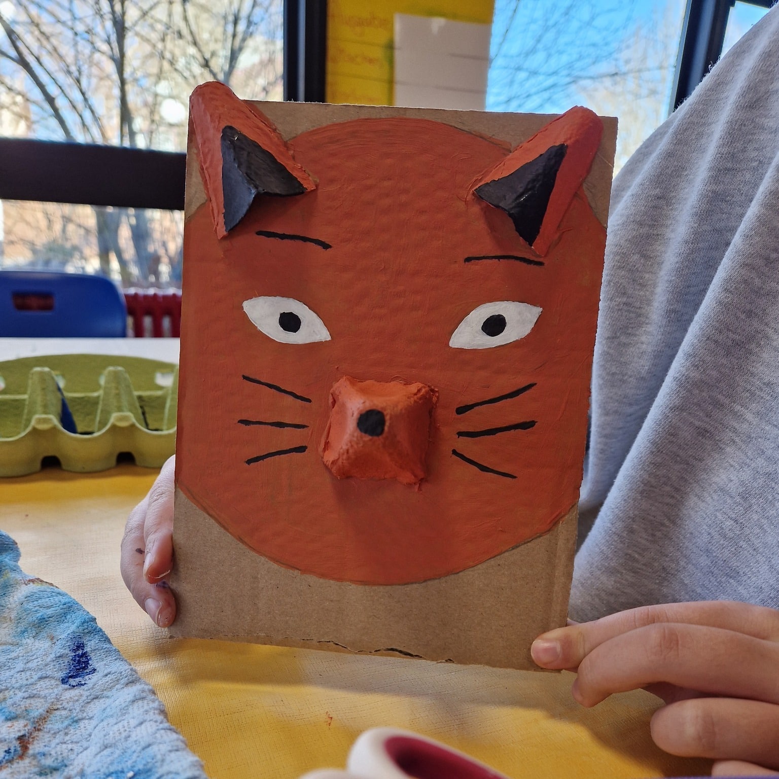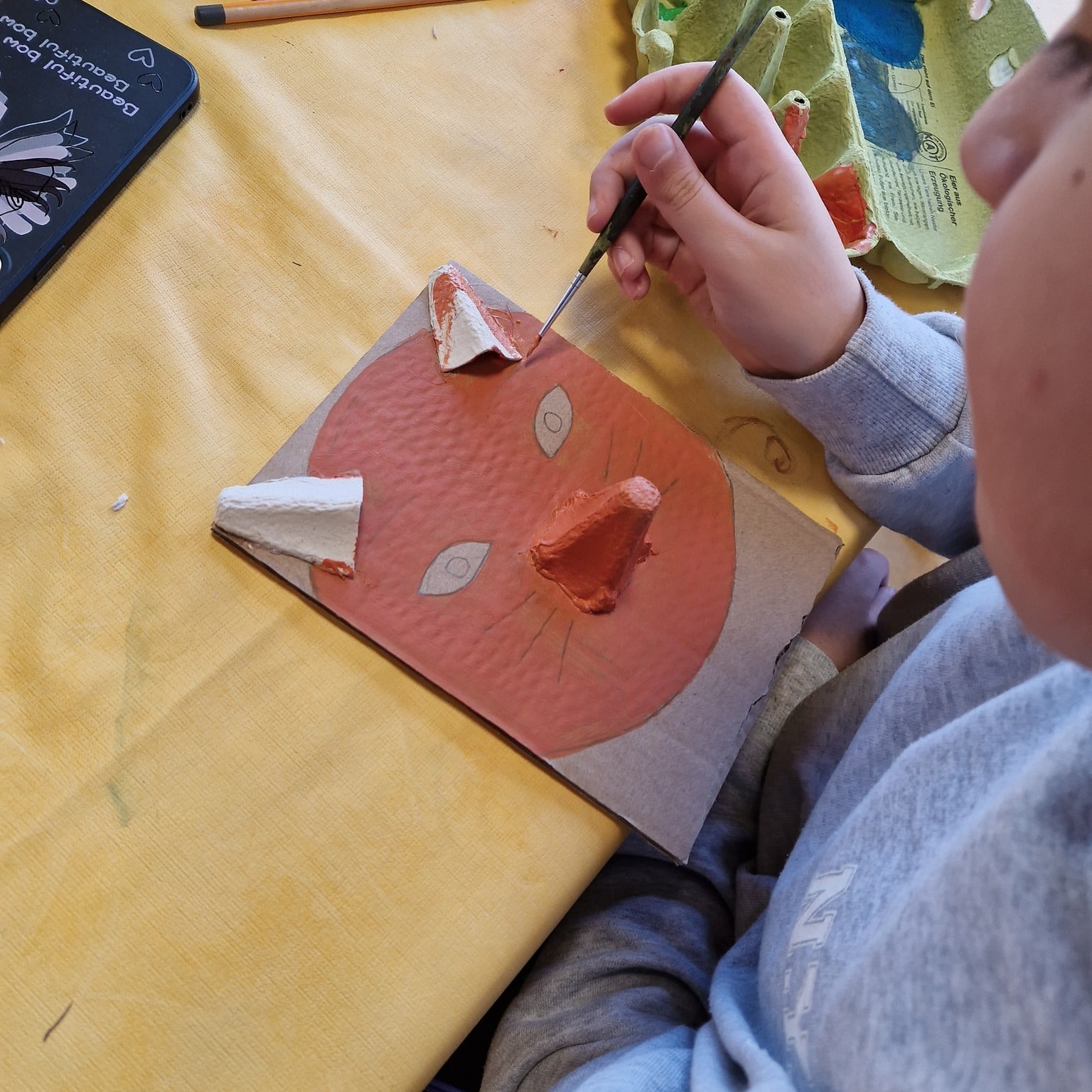 Mit jeder Menge Fantasie und Begeisterung entstanden aus Eierschachteln und Pappe tierische Kunstwerke. Ob Fuchs, Maus oder Hase – die Kinder schnitten, klebten und malten mit viel Freude. Die plastischen Nasen und Ohren bekamen mit Acrylfarben ihren ganz eigenen Charakter, und ein gemalter Rahmen rundete jedes Bild ab.