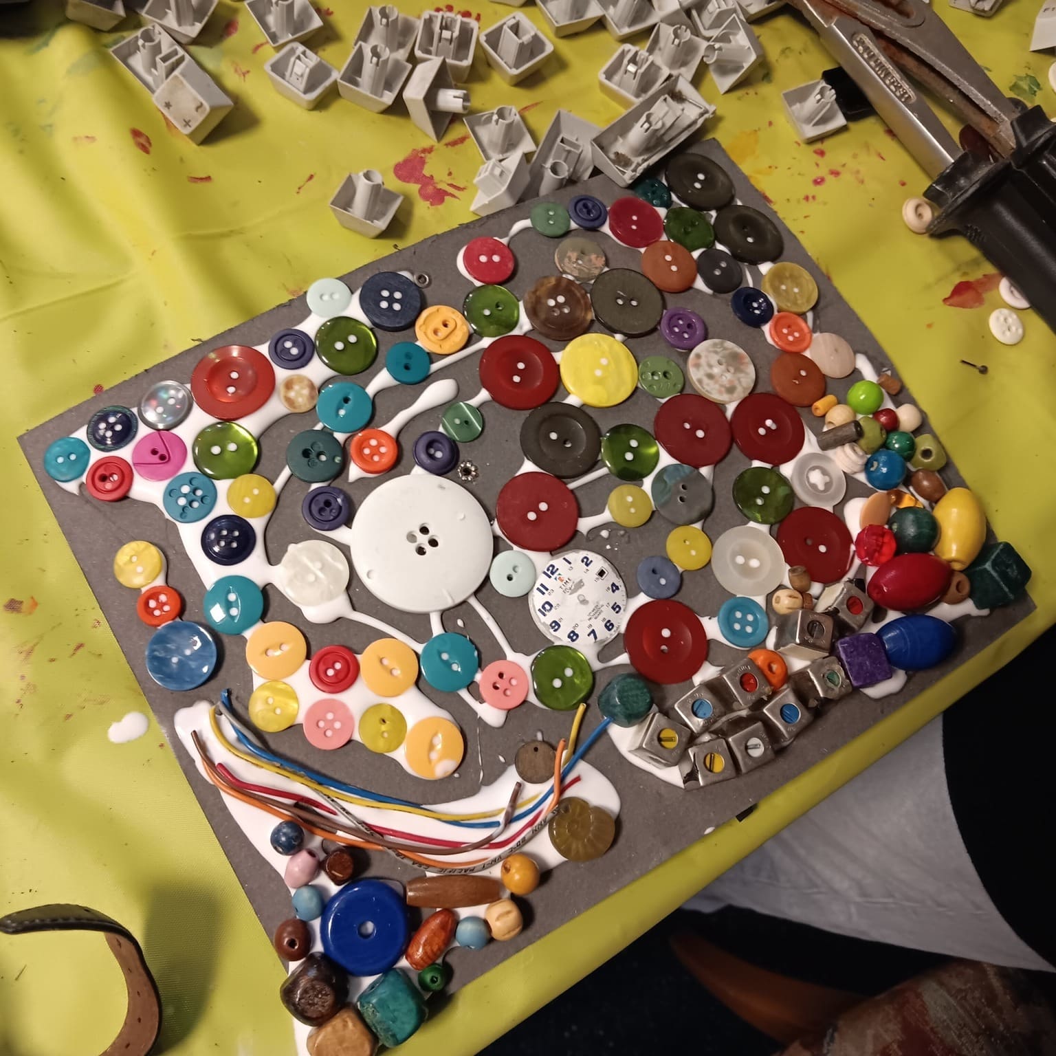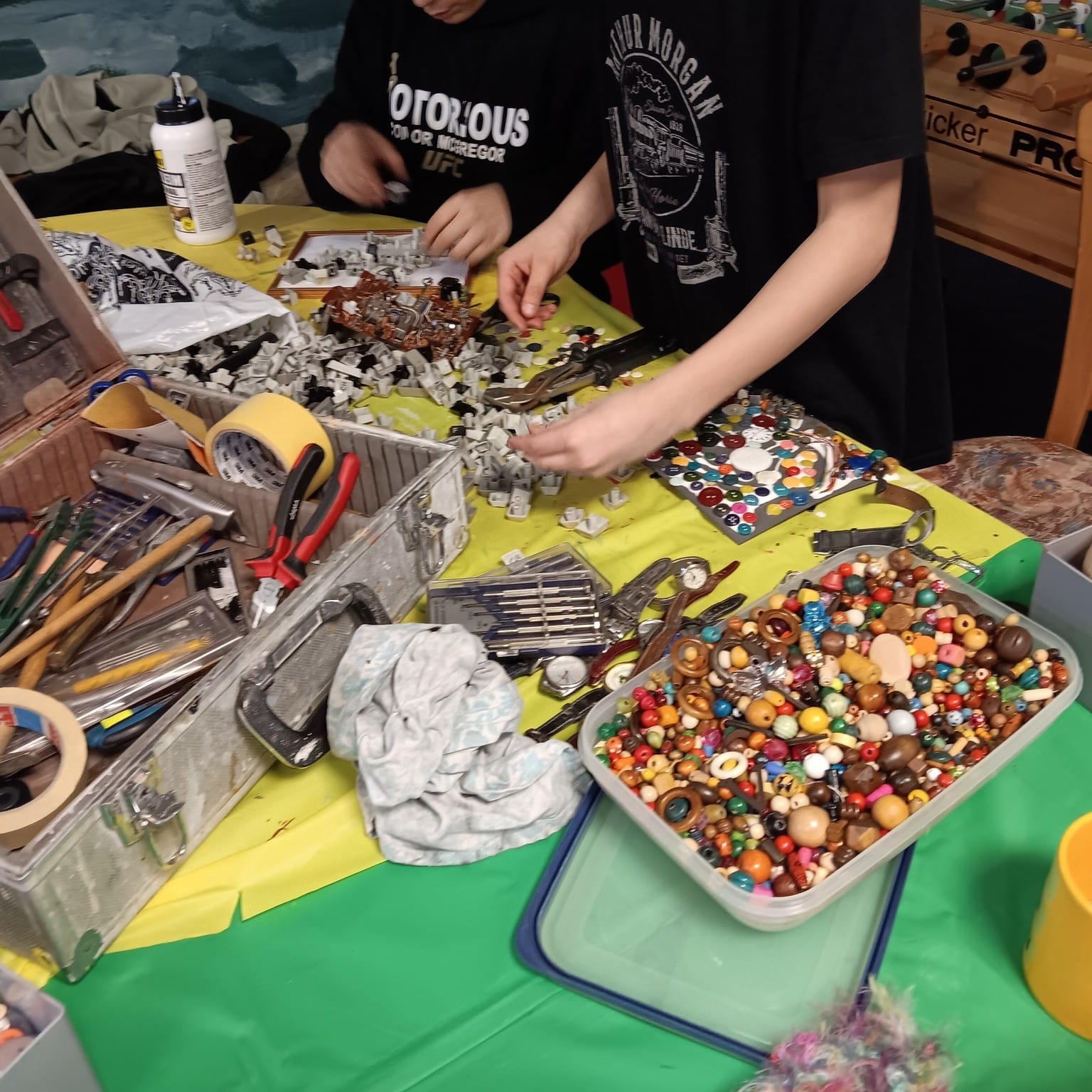 Mit viel Konzentration und Hingabe haben die Kinder ihre eigenen Kunstwerke aus alten Armbanduhren, Perlen und anderem Dekozubehör geschaffen. Jeder hat mit Geduld und Fantasie einzigartige Assemblagen gestaltet und aus vermeintlich „alten“ Materialien etwas ganz Neues erschaffen. 🌟