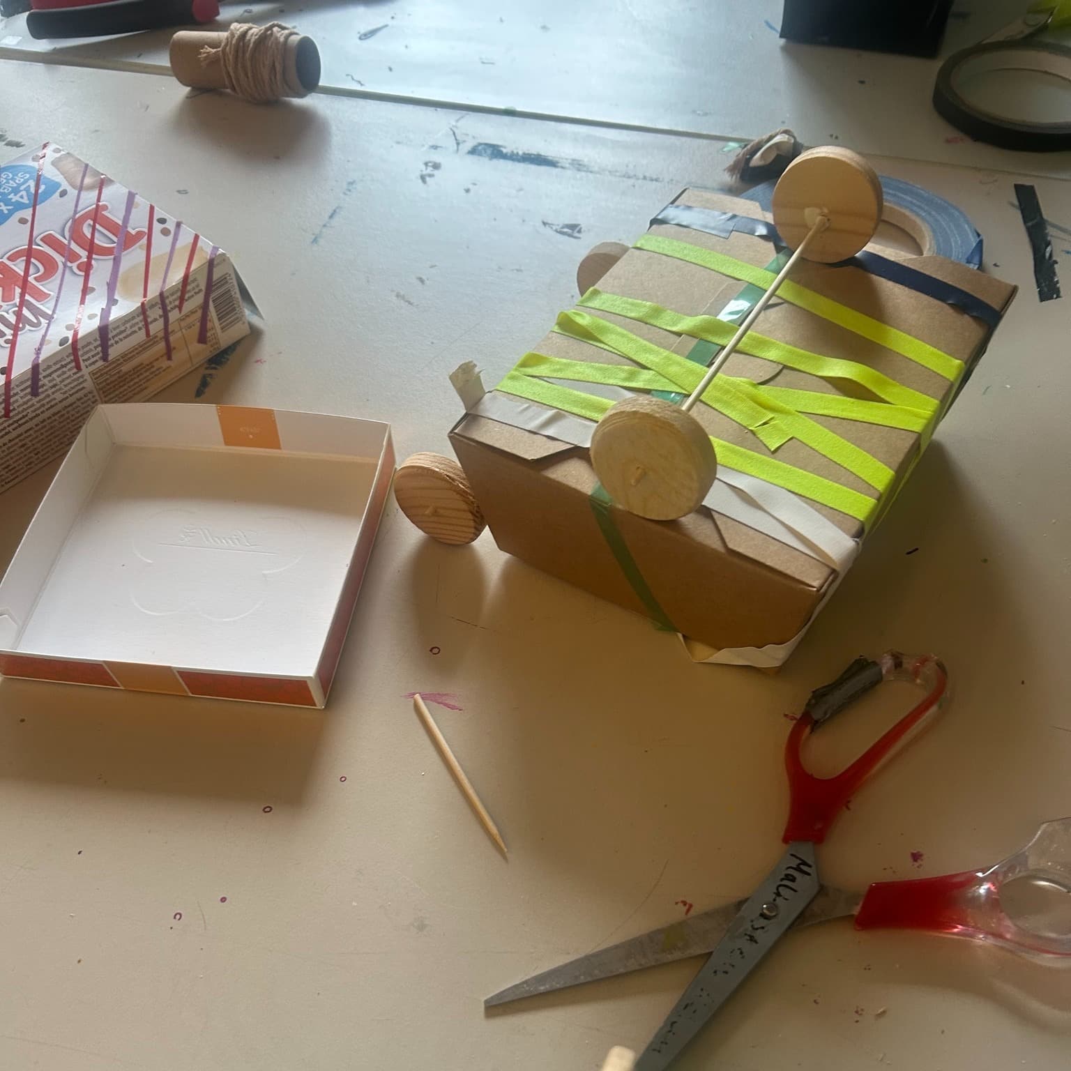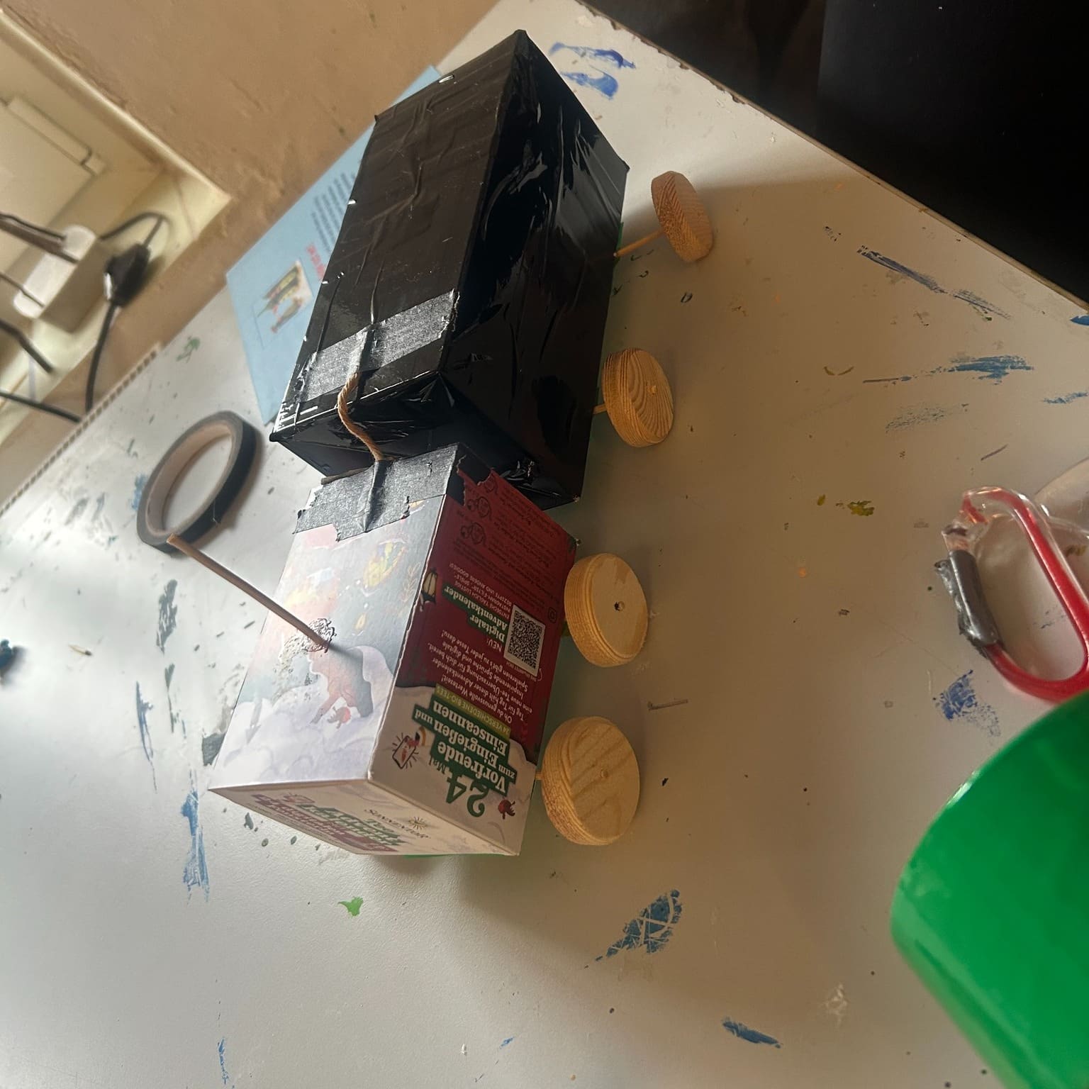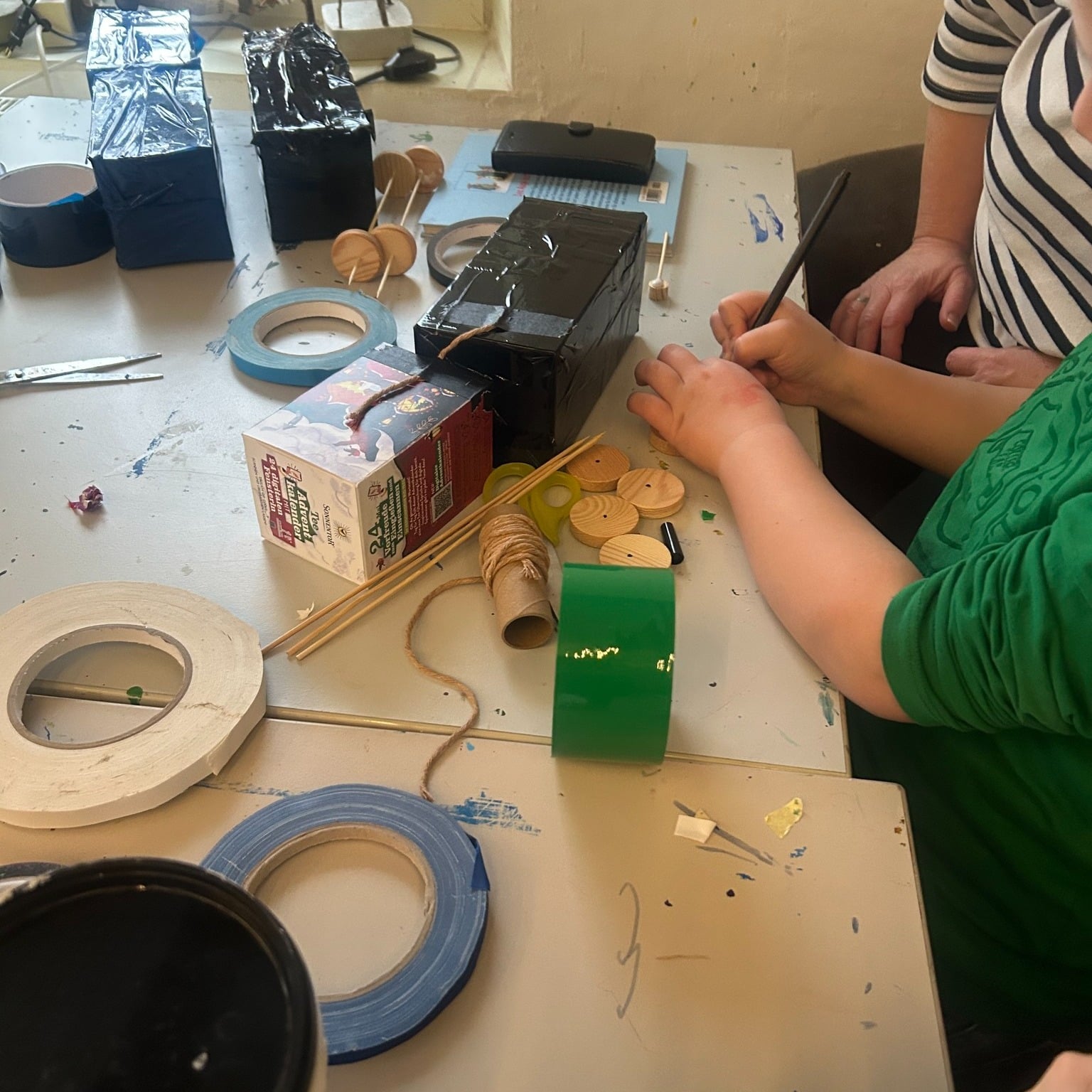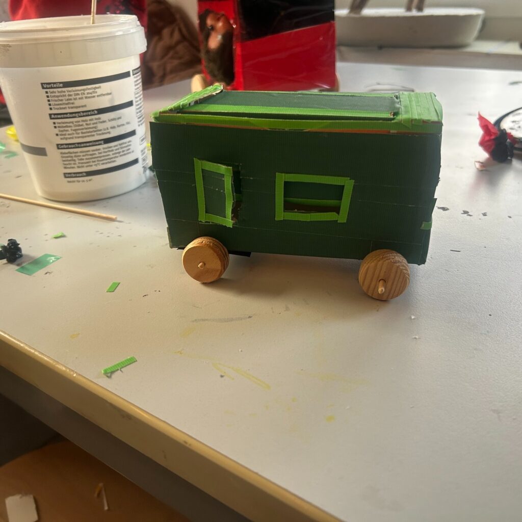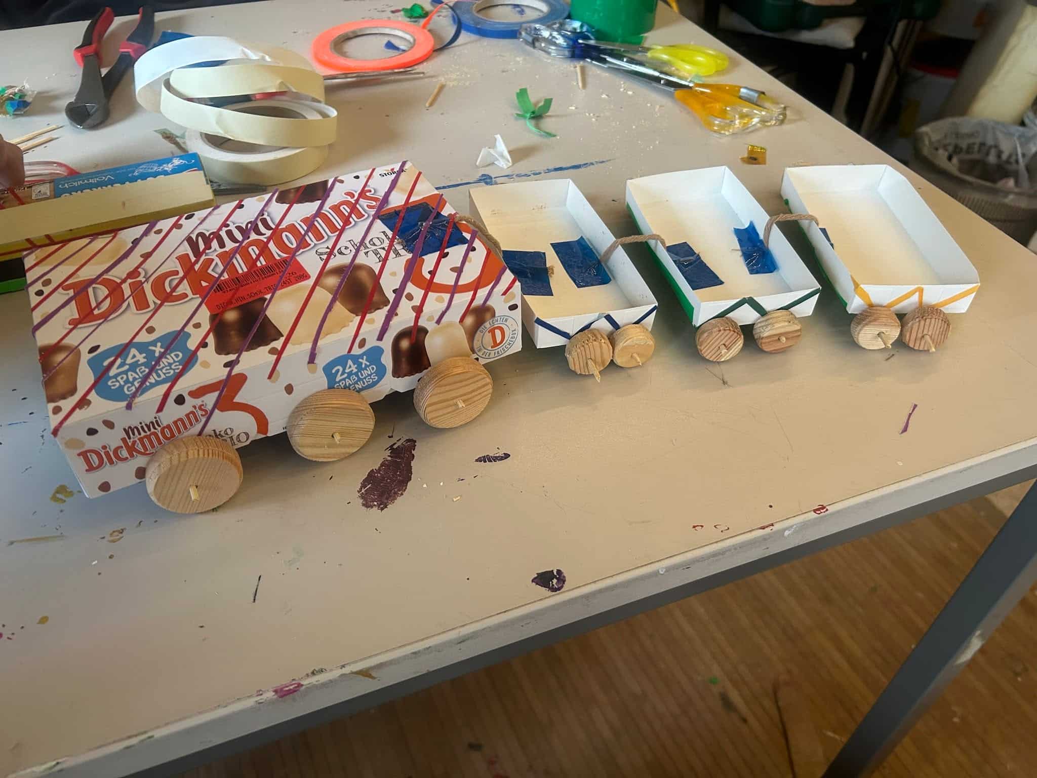 Mit Karton, Tape und Holzscheiben sind heute coole Flitzer entstanden – jedes ein Unikat mit viel Liebe zum Detail! Die Kinder haben fleißig geklebt, gemessen und getüftelt. Wer sich traute, durfte sogar selbst zur Bohrmaschine greifen und die Radmitte markieren.