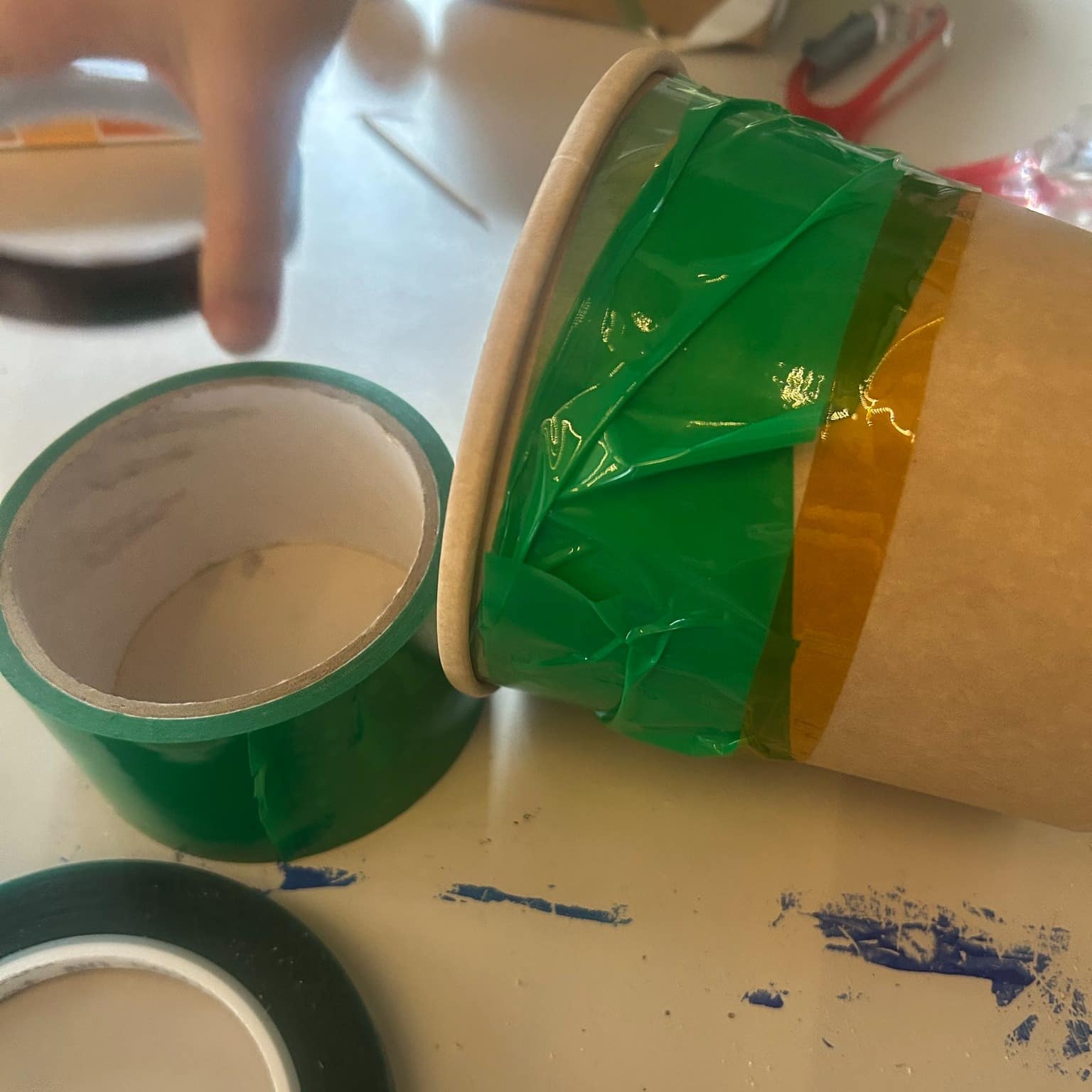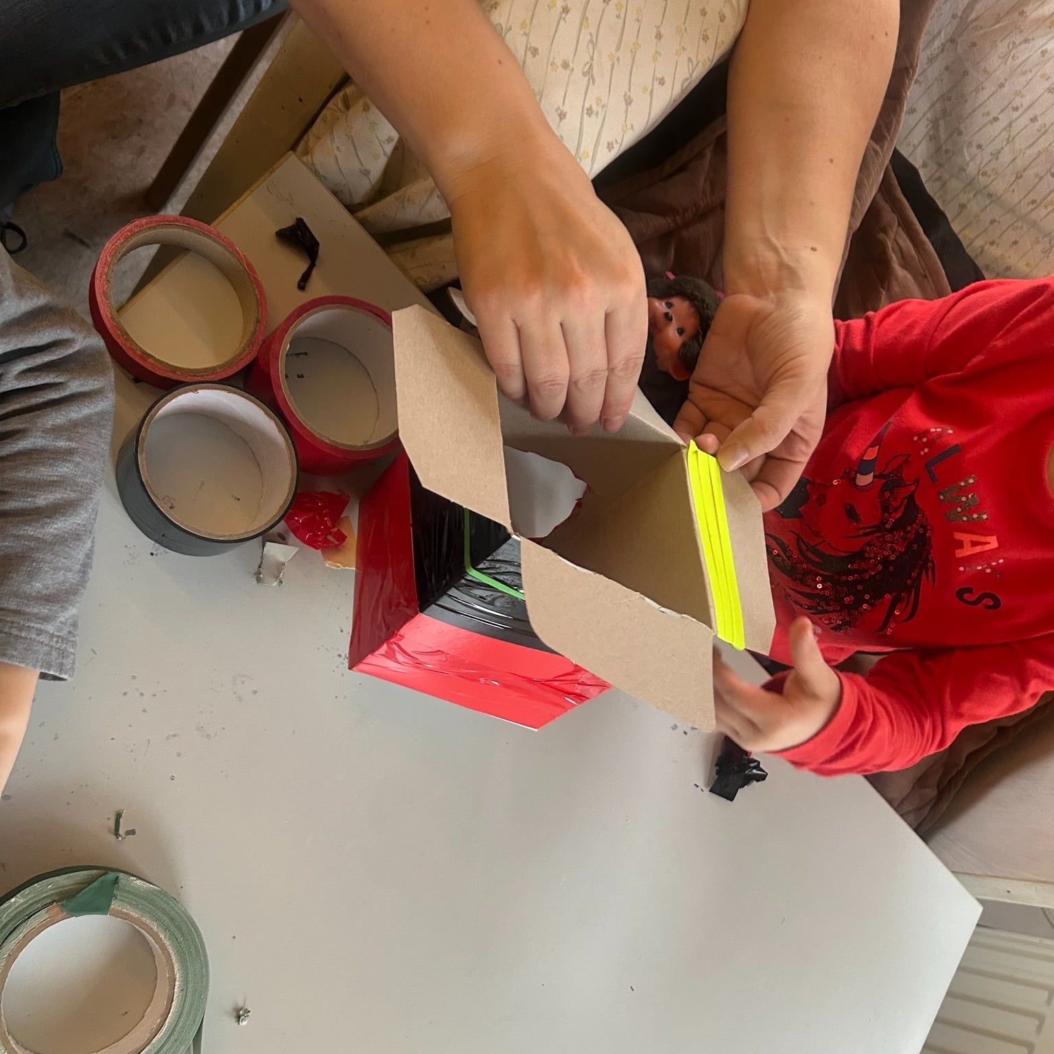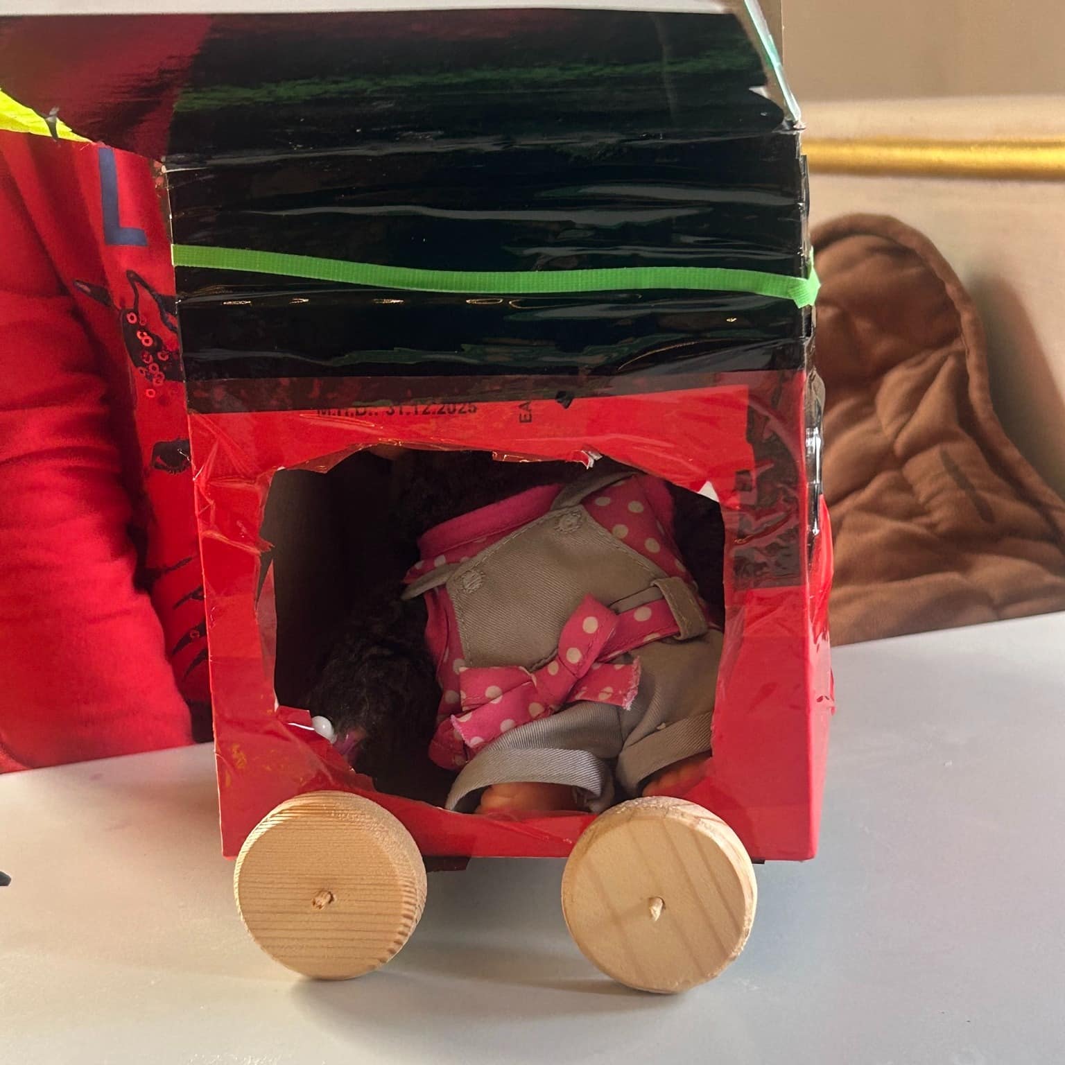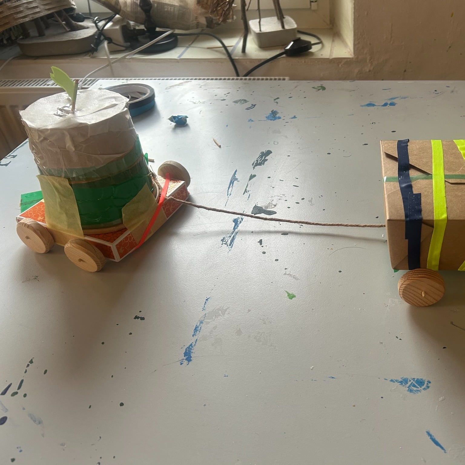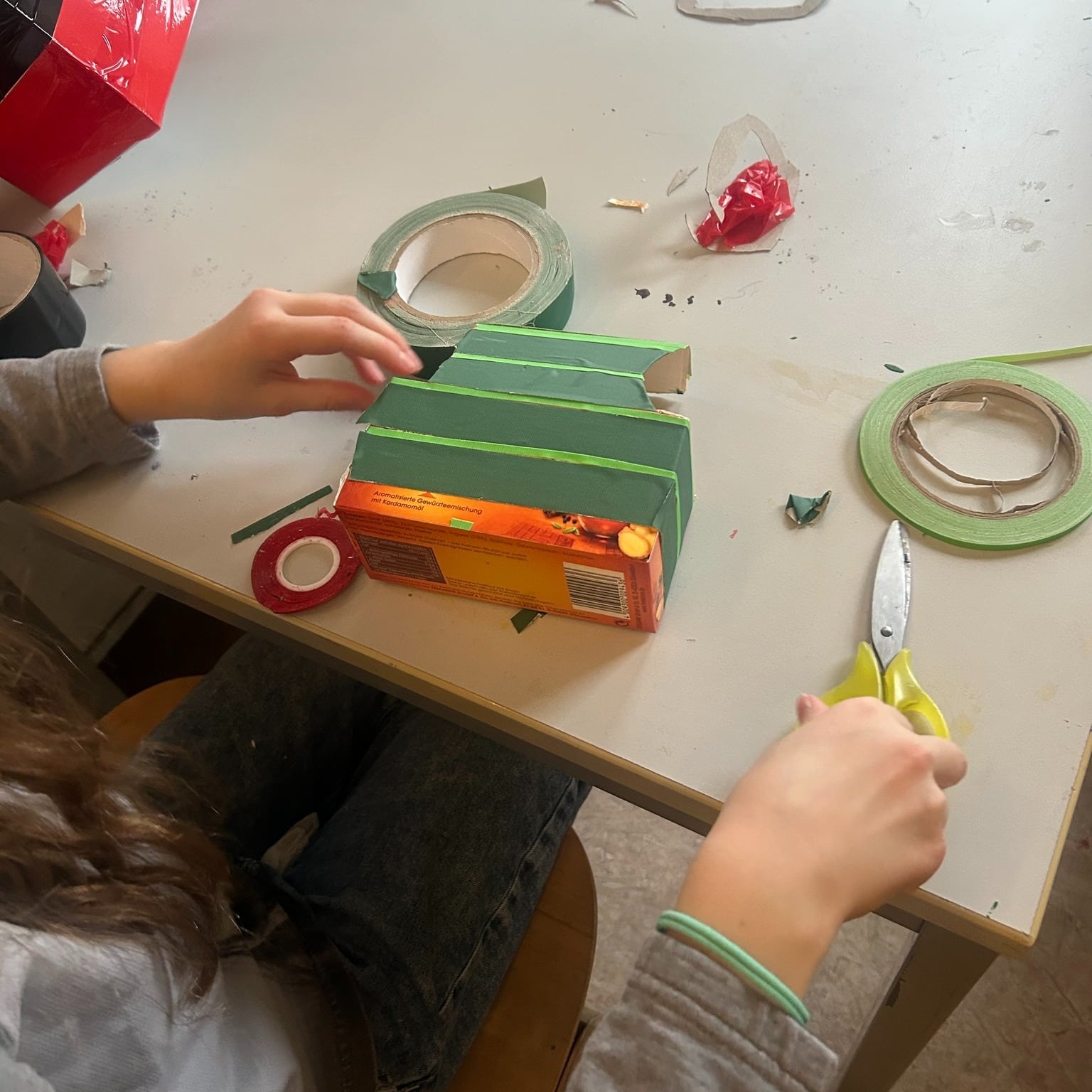Mit Karton, Tape und Holzscheiben sind heute coole Flitzer entstanden – jedes ein Unikat mit viel Liebe zum Detail! Die Kinder haben fleißig geklebt, gemessen und getüftelt. Wer sich traute, durfte sogar selbst zur Bohrmaschine greifen und die Radmitte markieren.