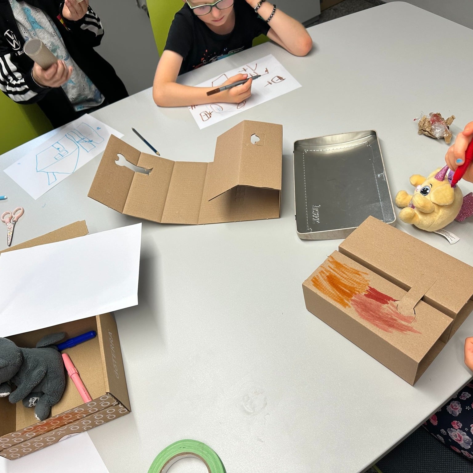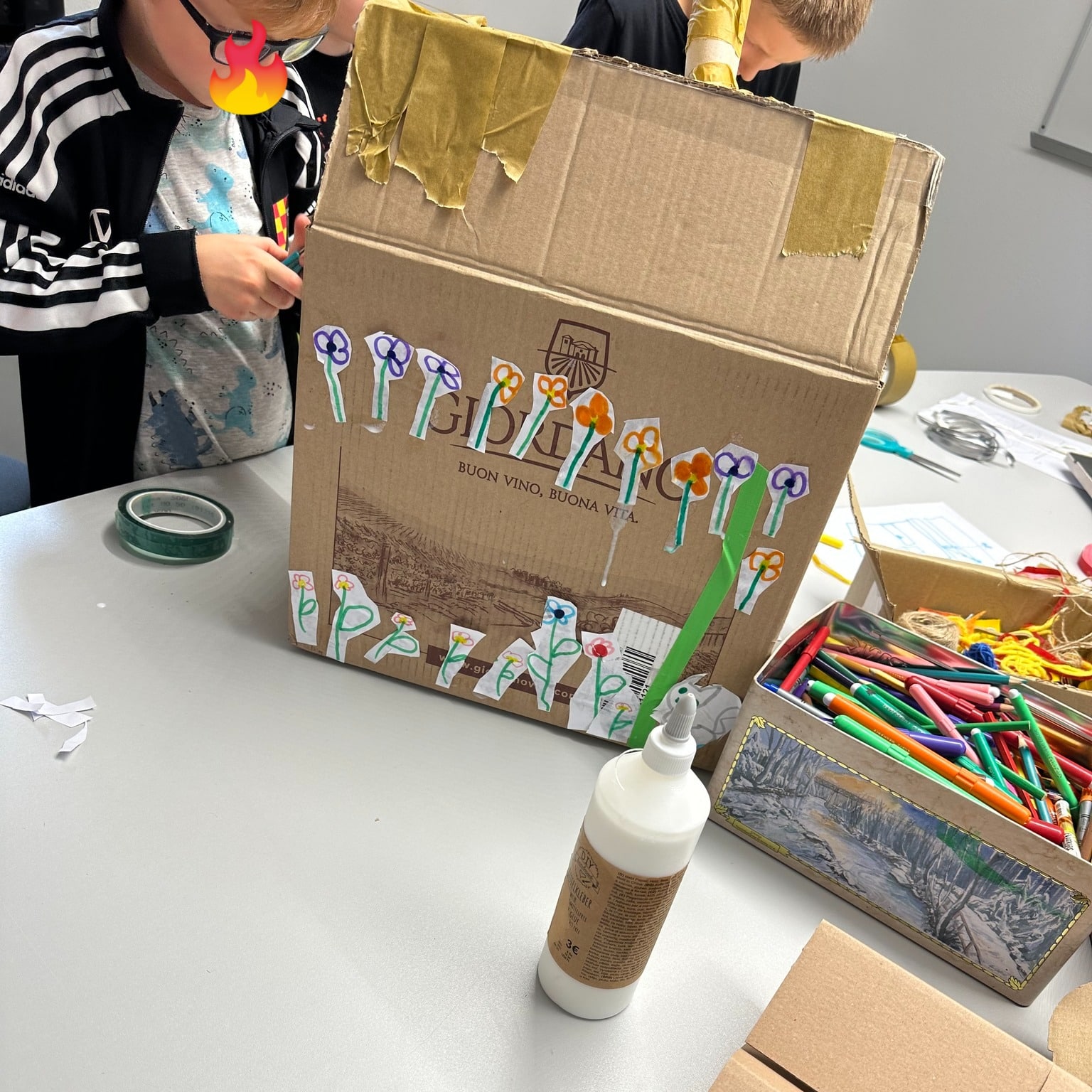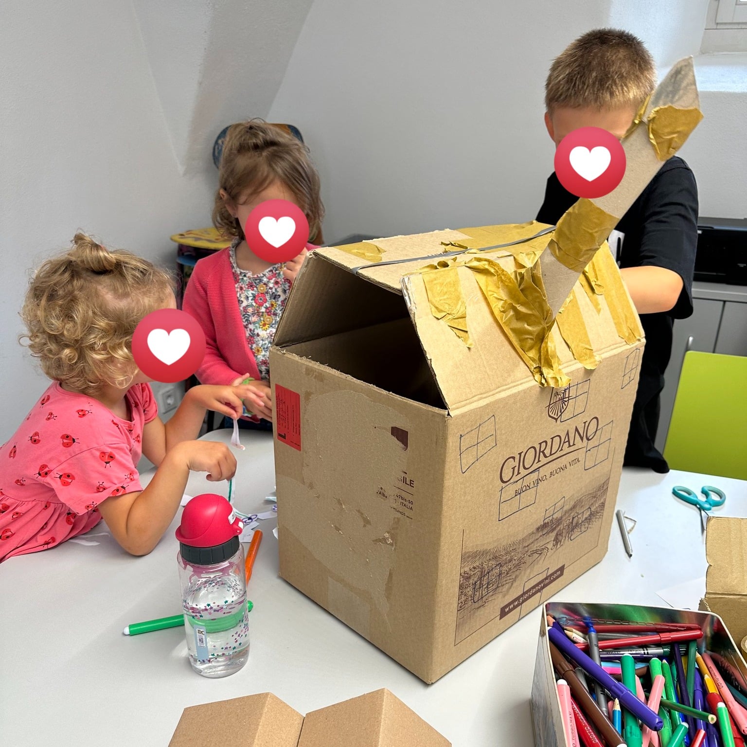 Mit buntem Tape, Filzstiften und farbenfrohen Illustrationen wurde das Schachtelhaus noch weiter verschönert – ein echtes Gemeinschaftskunstwerk voller Farbe und Fantasie! 💛