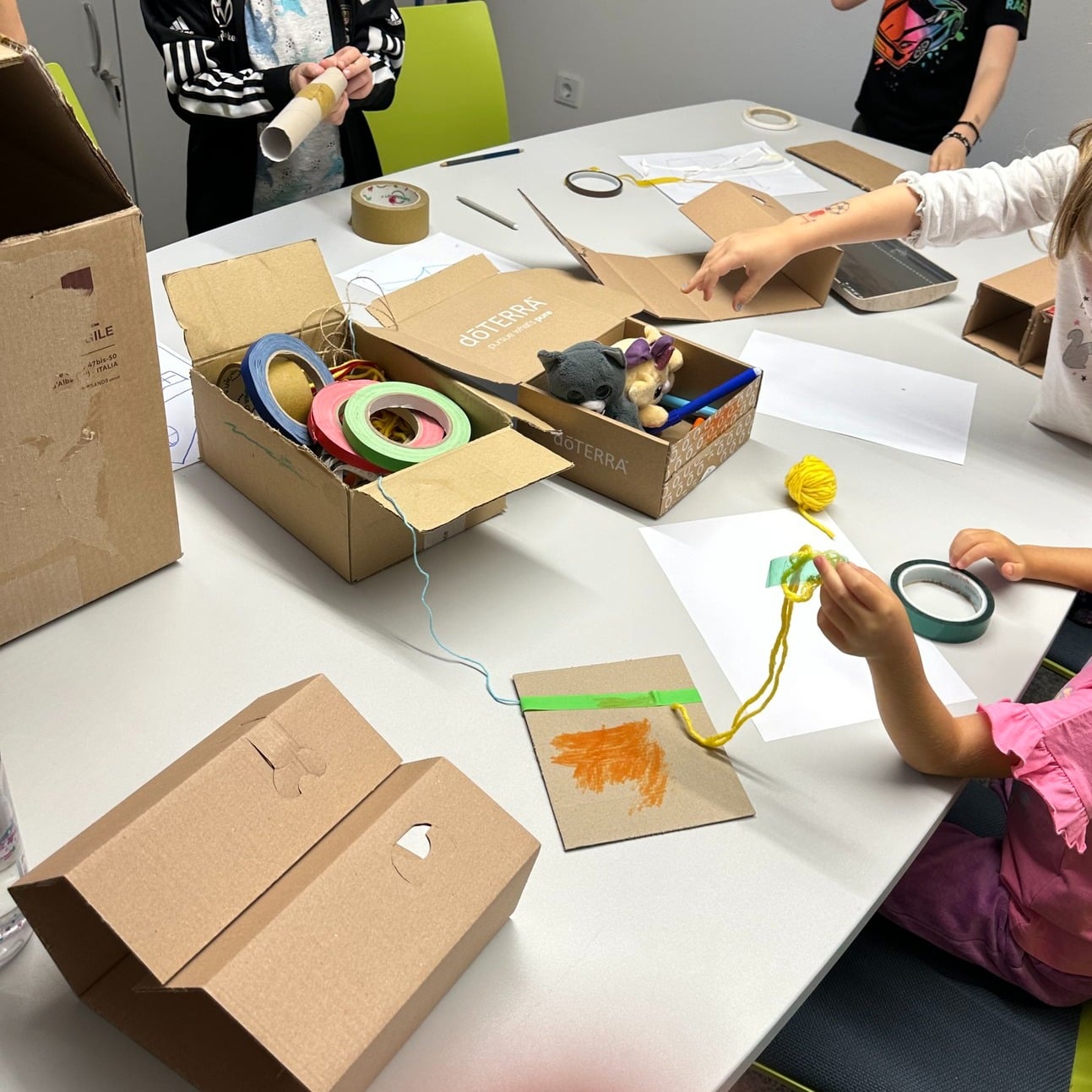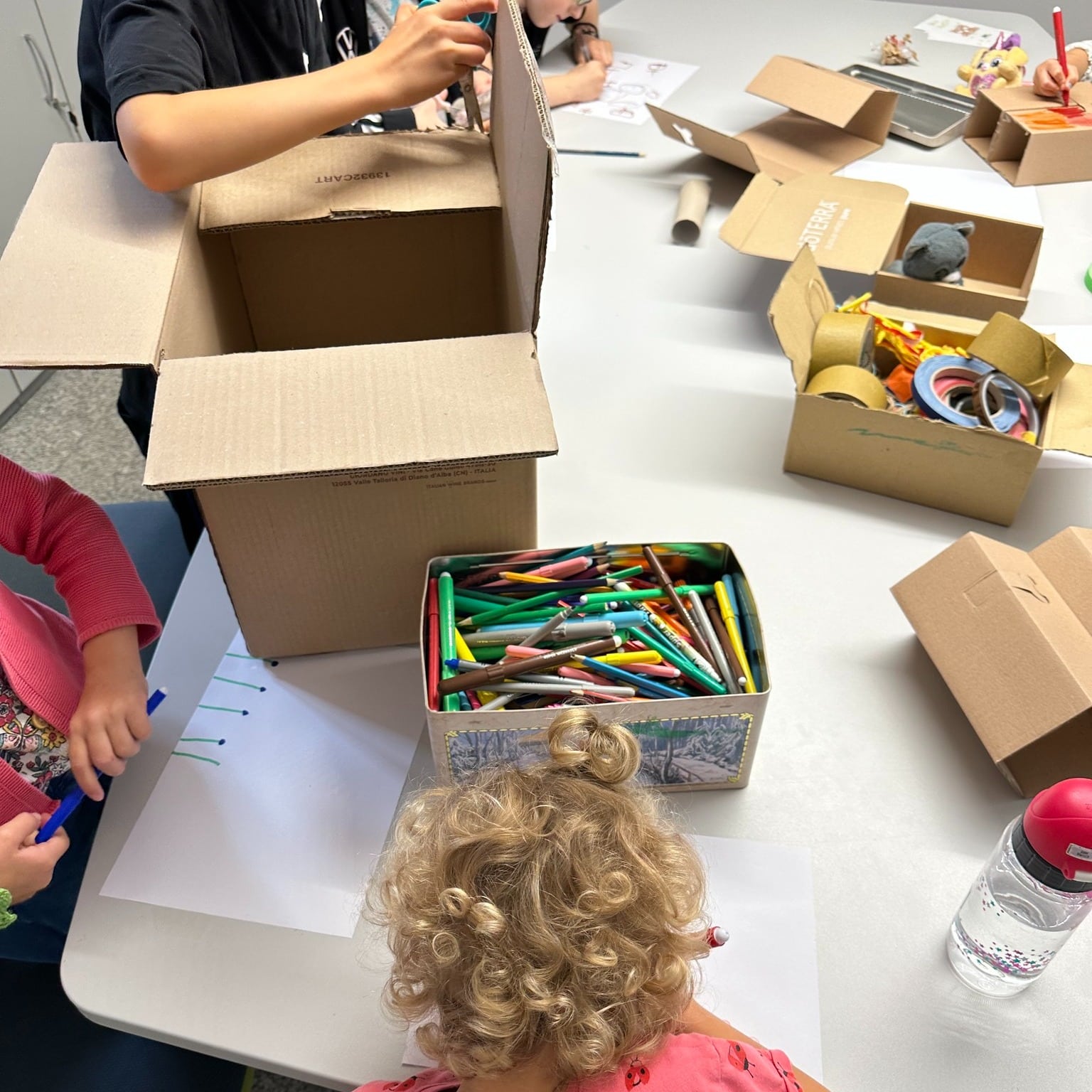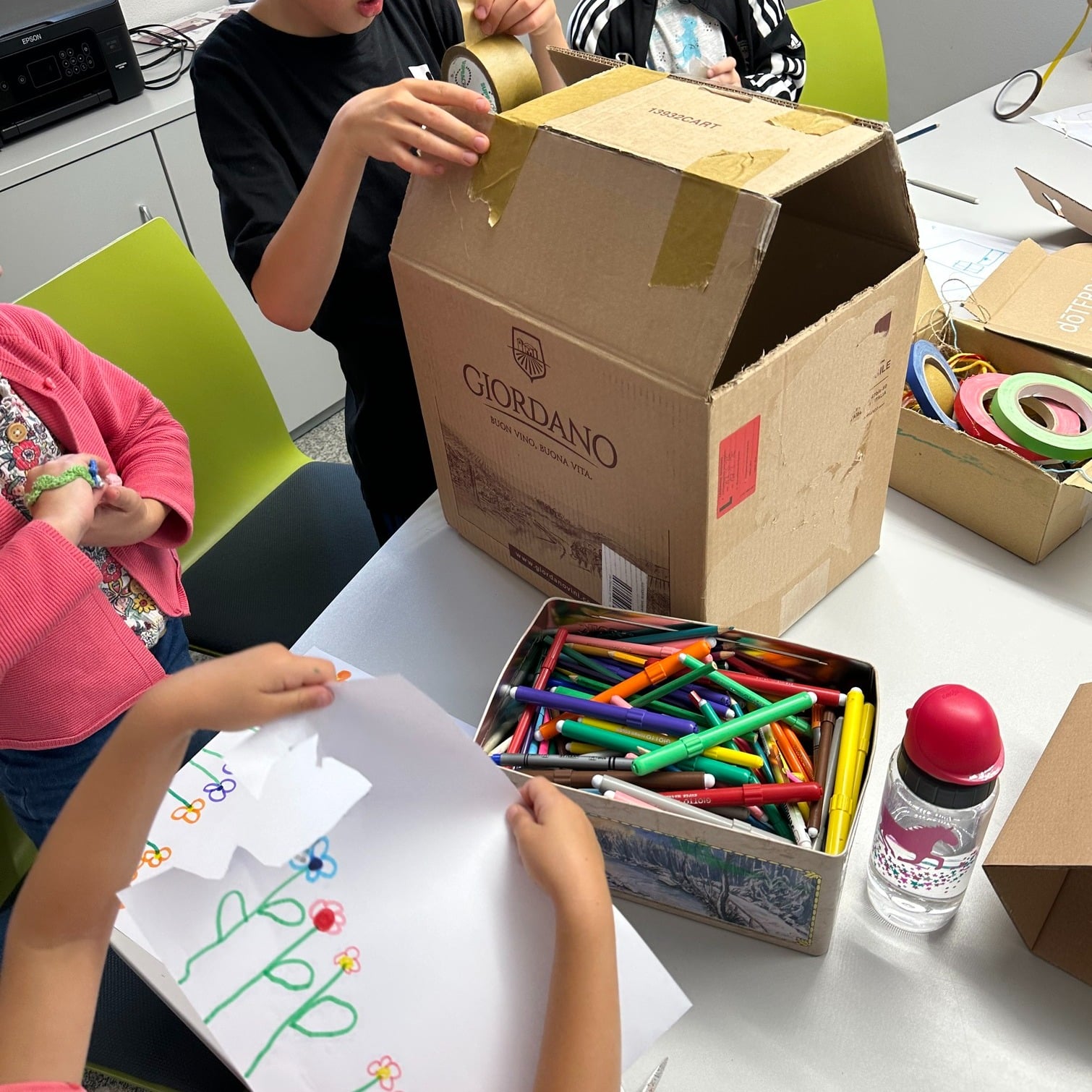 Mit buntem Tape, Filzstiften und farbenfrohen Illustrationen wurde das Schachtelhaus noch weiter verschönert – ein echtes Gemeinschaftskunstwerk voller Farbe und Fantasie! 💛