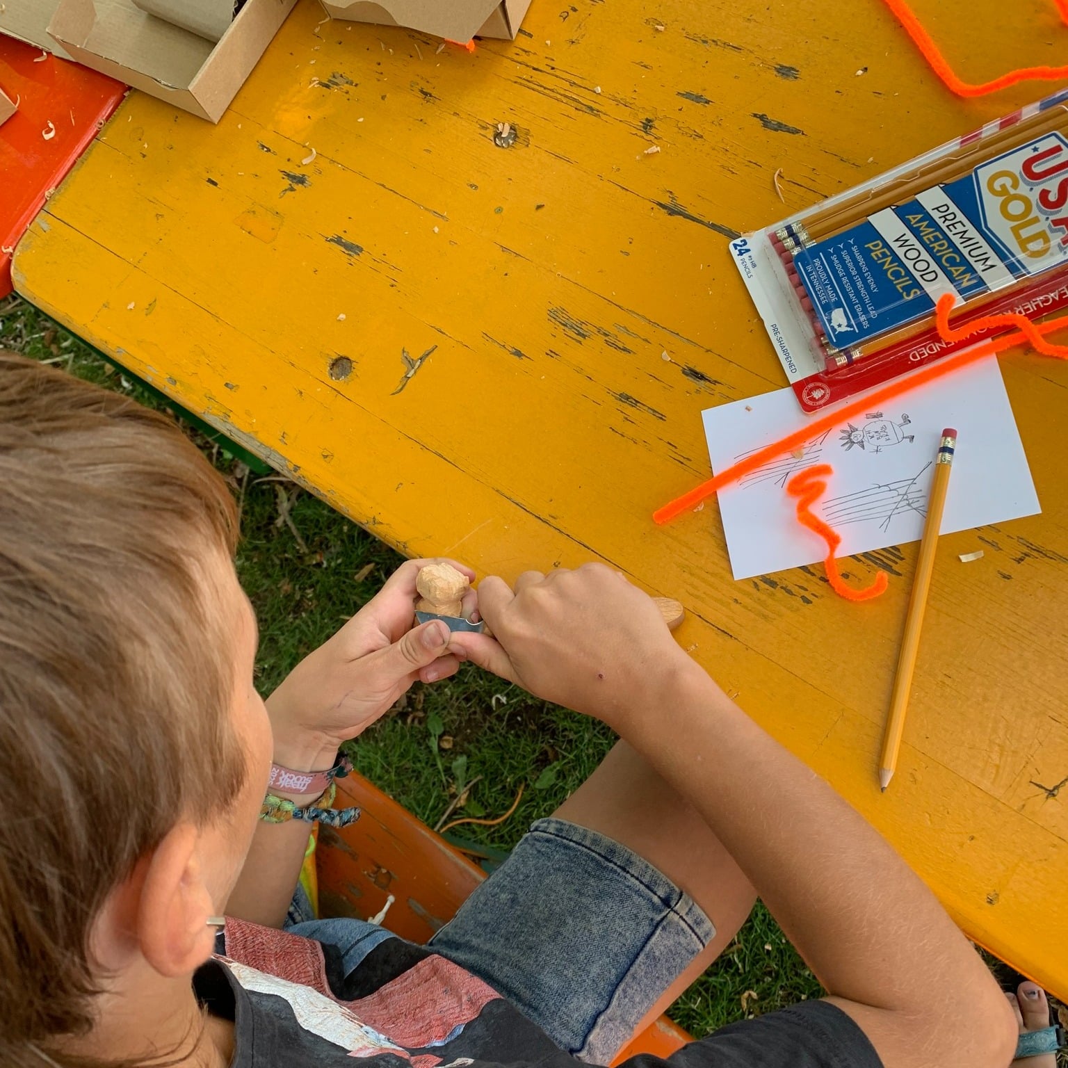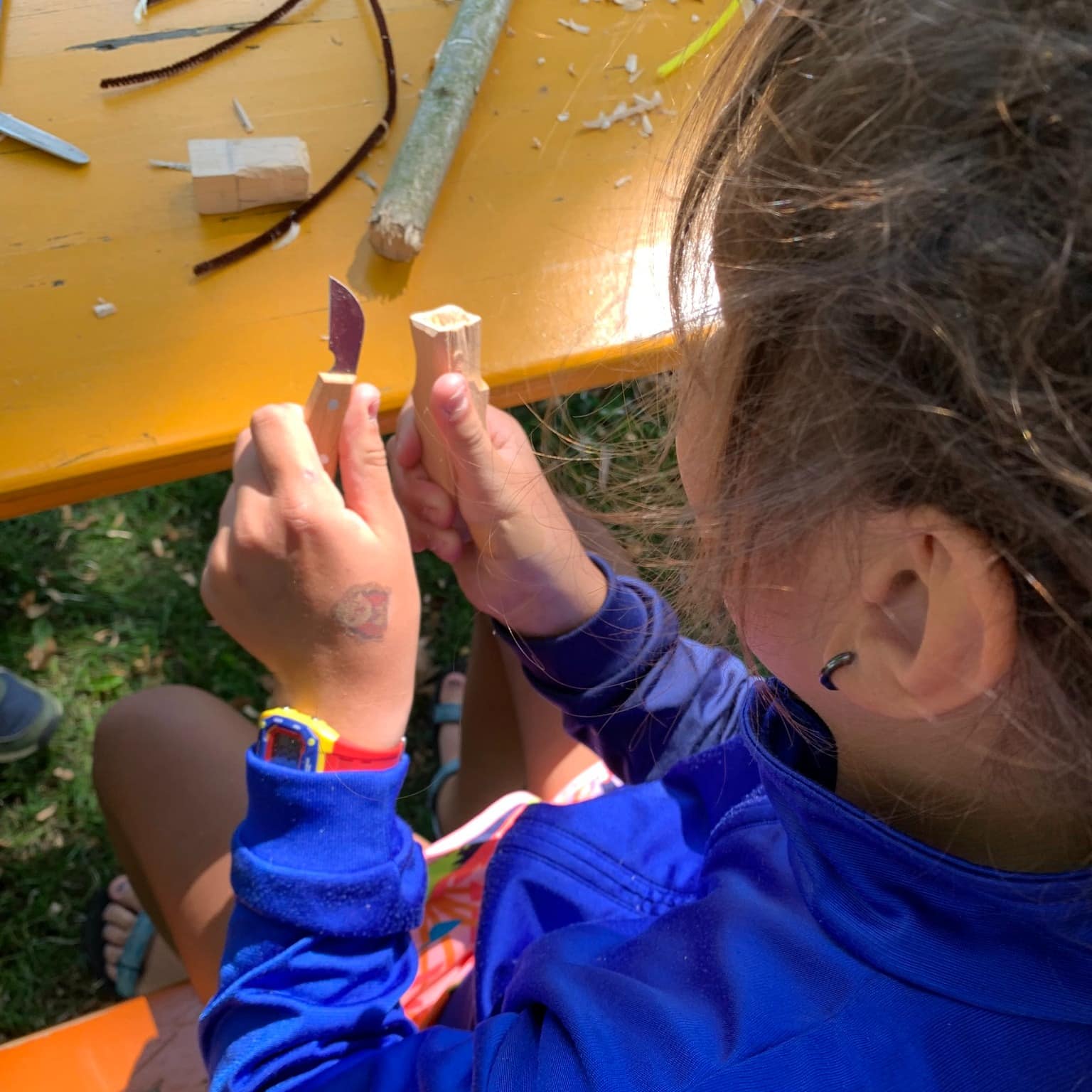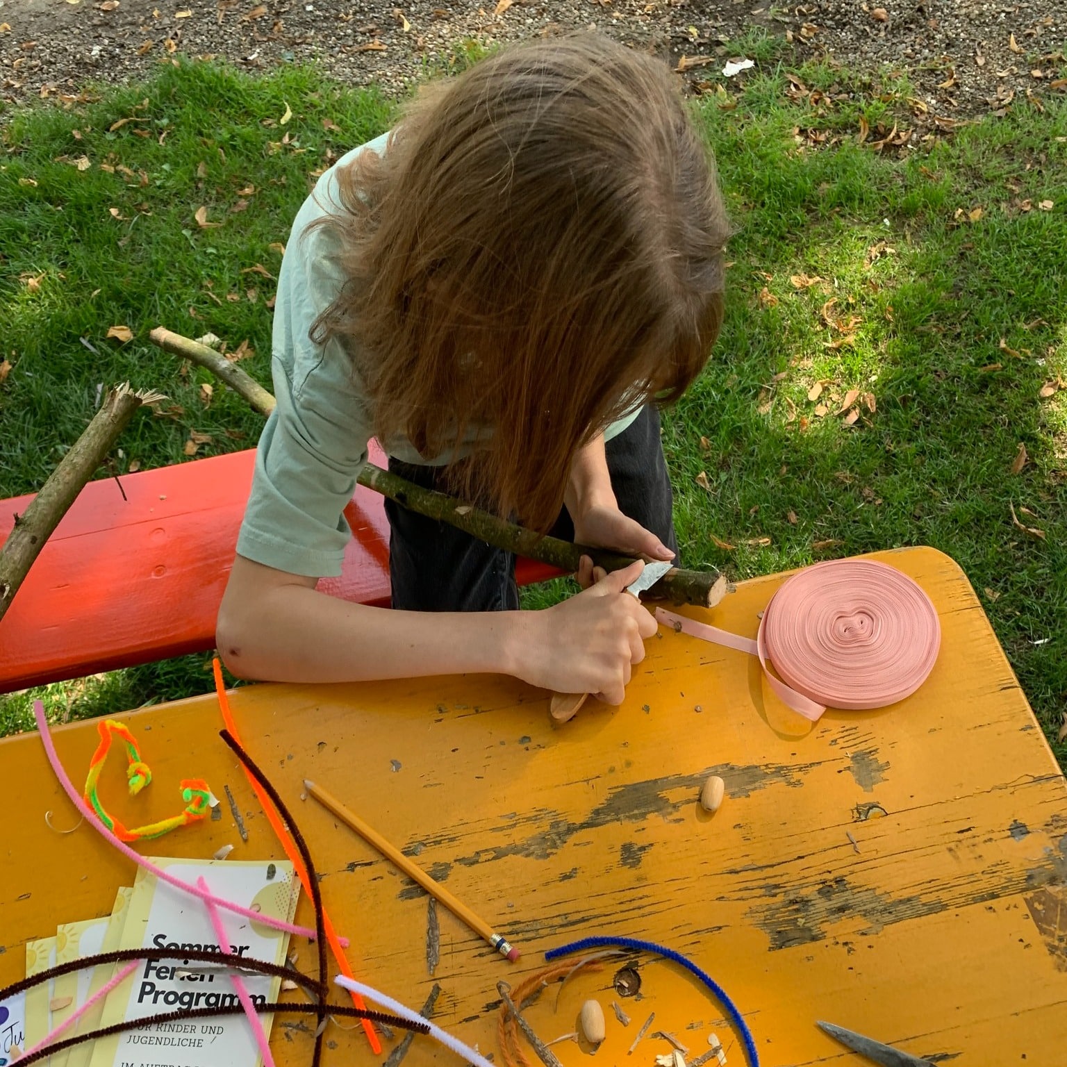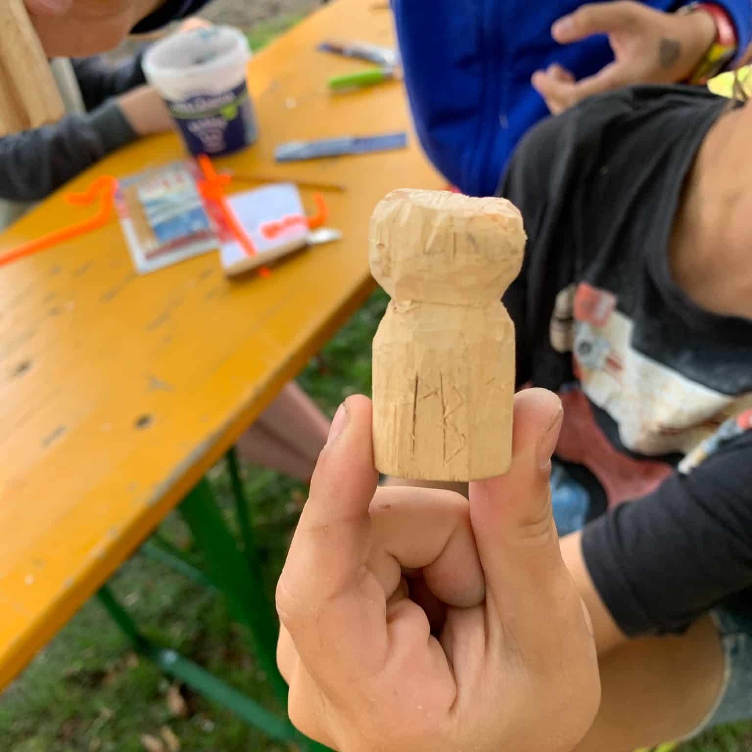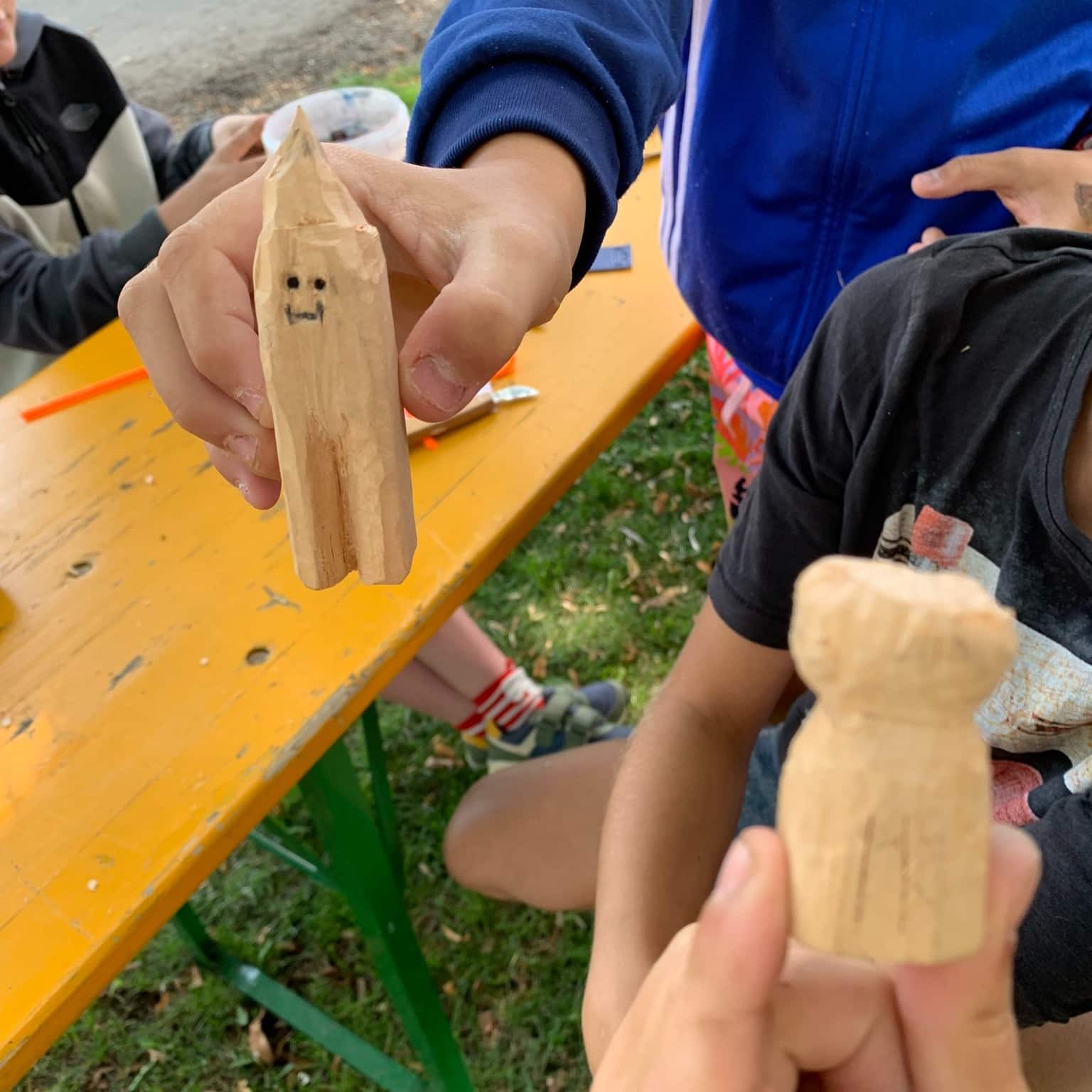 Bei bestem Wetter haben die Kinder im Park gemeinsam geschnitzt. Nach einer Sicherheitseinweisung starteten alle ihre ersten Versuche mit Grünholz und holten die ersten kleinen Figuren direkt aus dem Holz heraus.