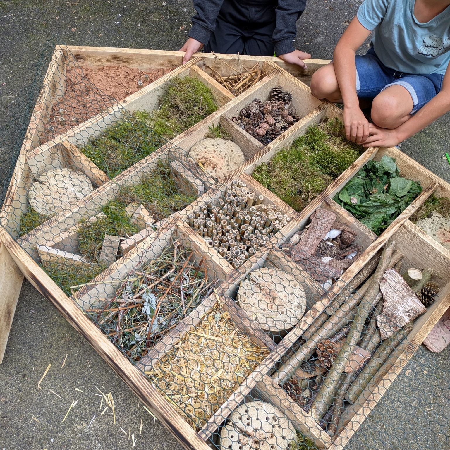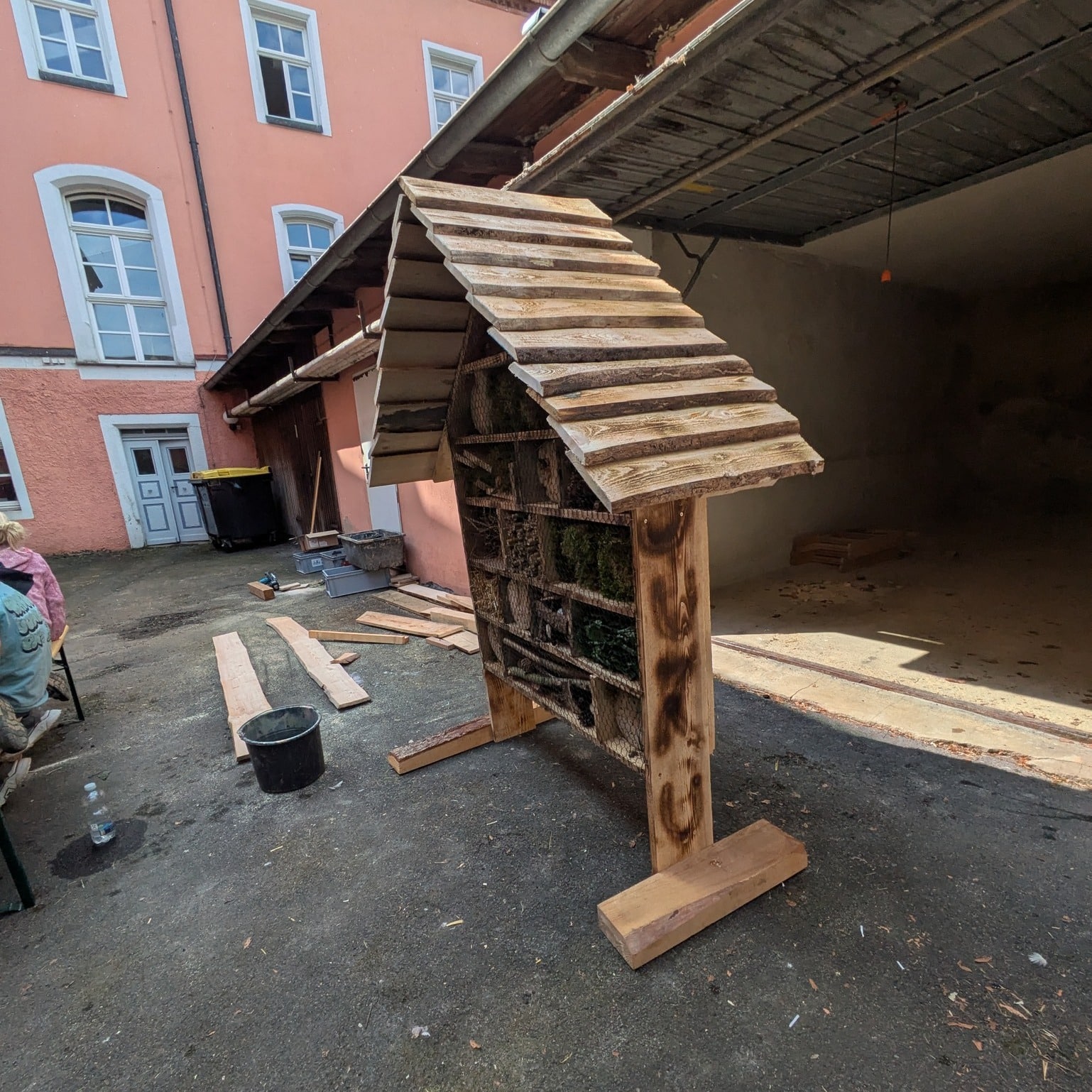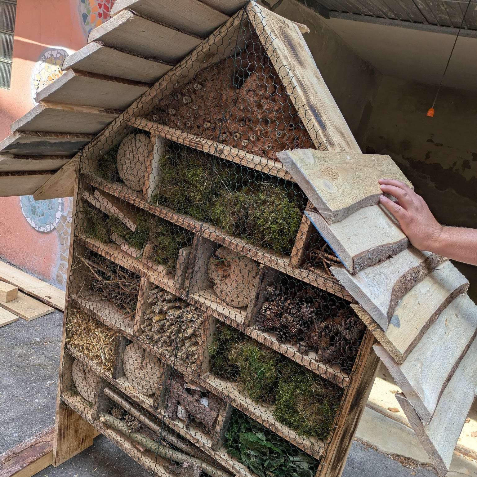 Drei Tage lang wurde gebohrt, gesägt, geschraubt und geschliffen – mit voller Begeisterung und jeder Menge Teamgeist entstand ein großartiges Insektenhotel! 🔩🪚