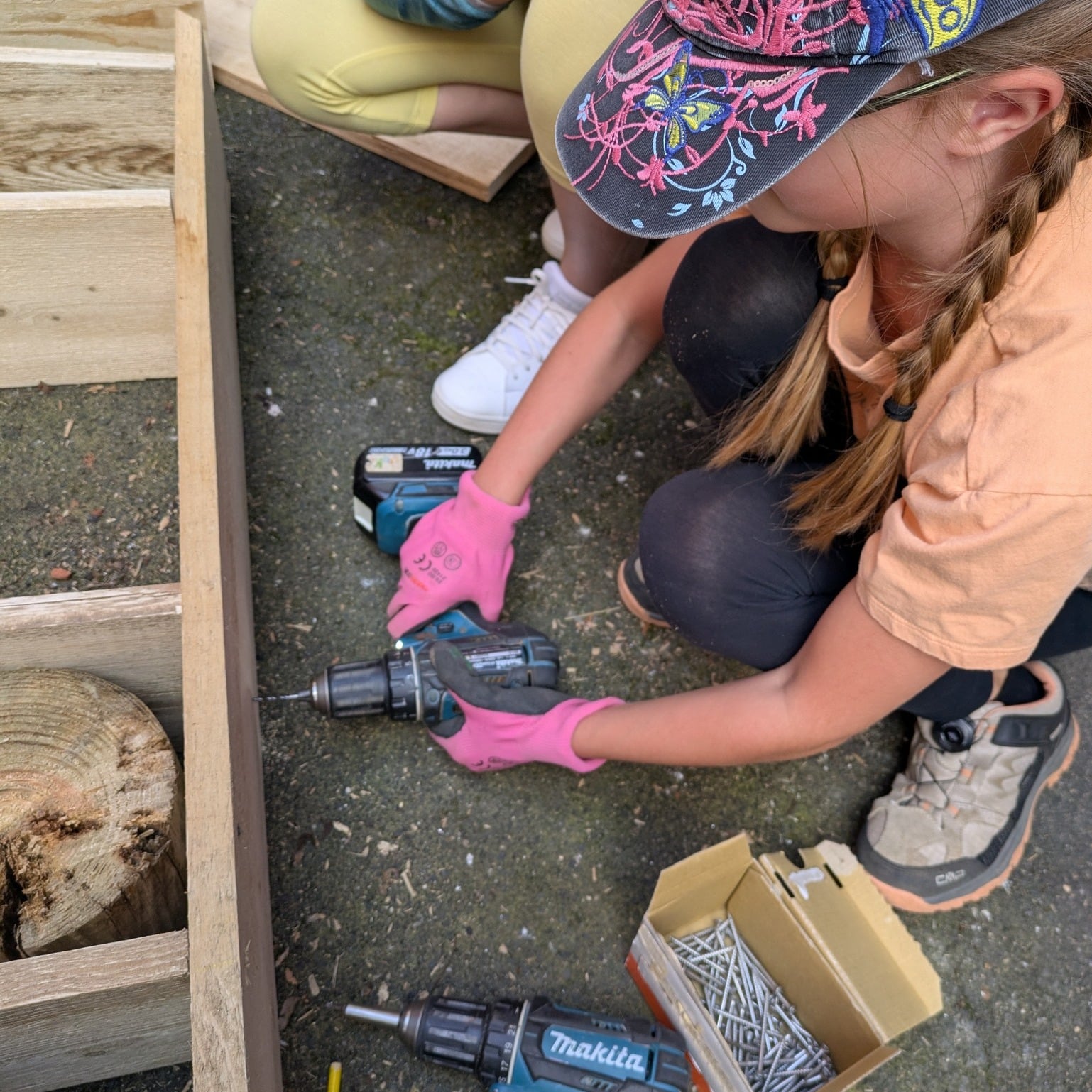 Die Kinder arbeiteten hochkonzentriert mit Bohrmaschine, Akkuschrauber und Schleifgerät – ganz selbstverständlich und mit sichtbarem Stolz auf ihr handwerkliches Können.