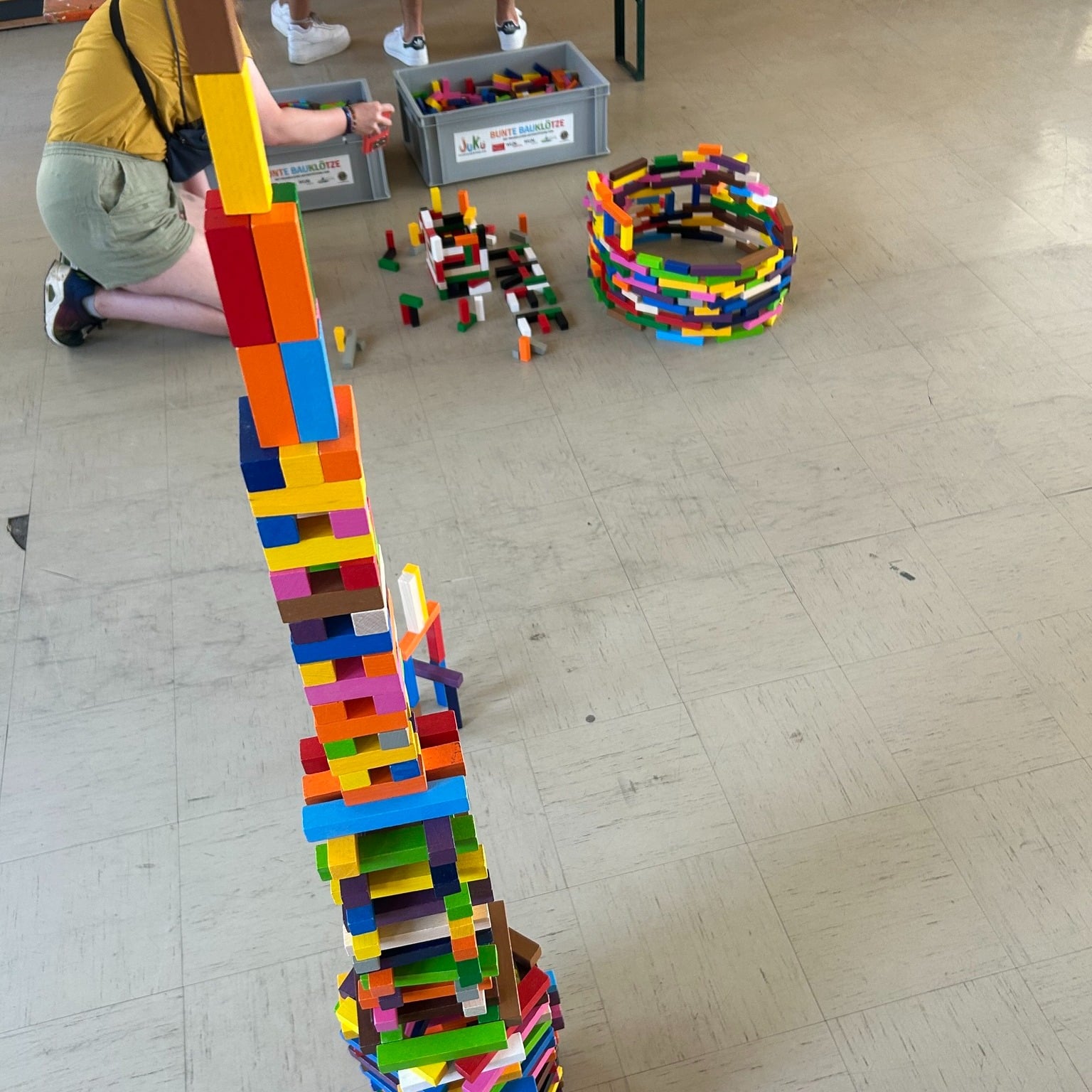Gemeinsam haben die Teilnehmenden riesige Bauklötztürme errichtet und sich kunstvoll mit Tape Art ausgetobt – voller Freude, Leidenschaft und kreativer Energie. Unter Anleitung von Bärbel Quehl entstanden Räume zum Staunen, Mitmachen und Ausprobieren.