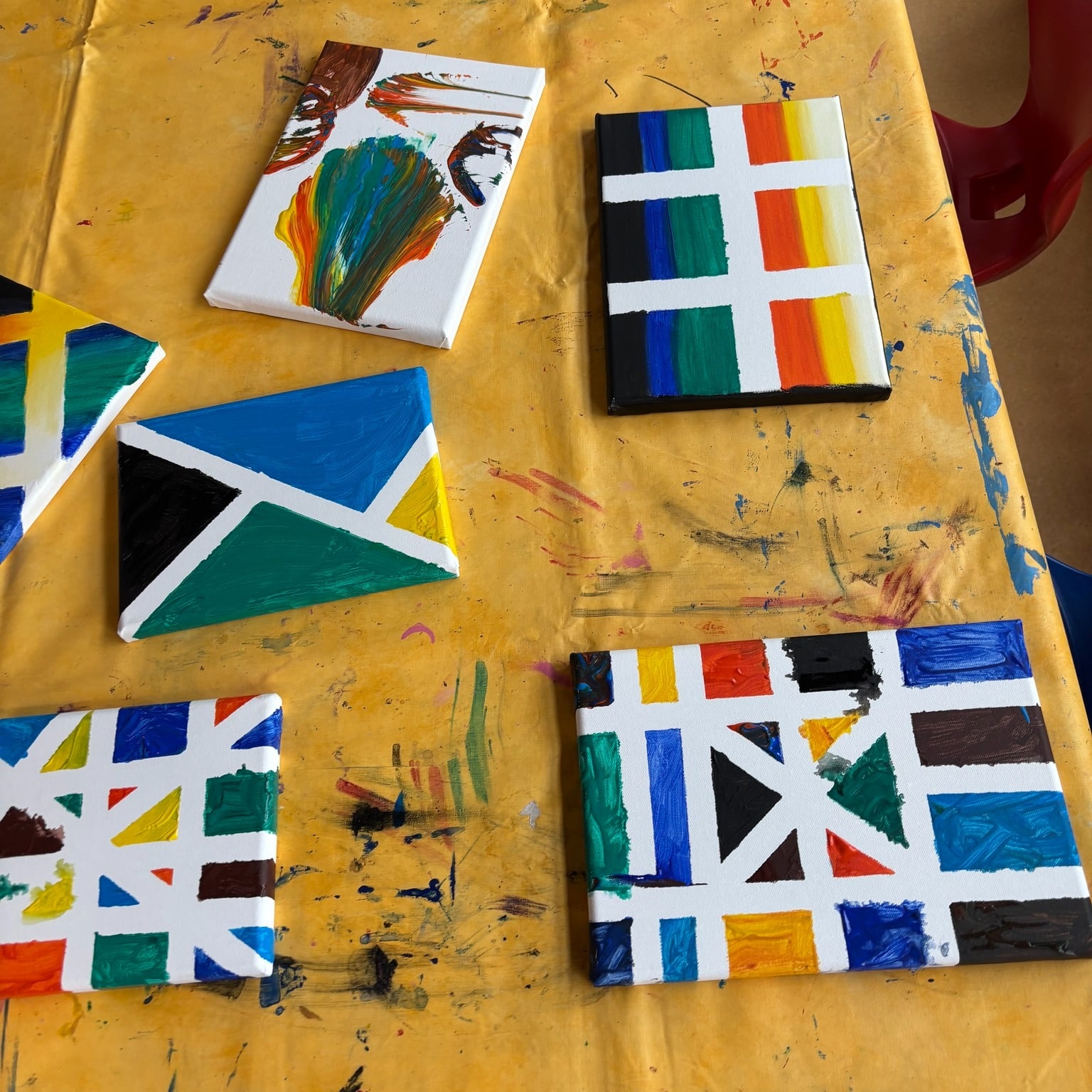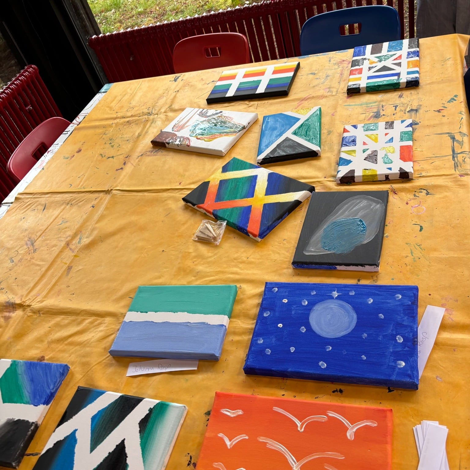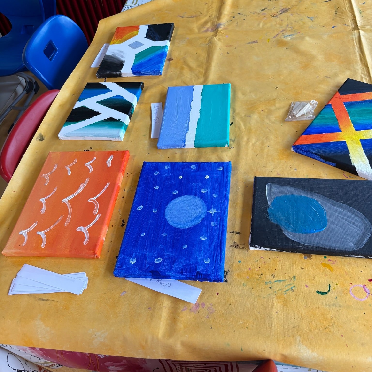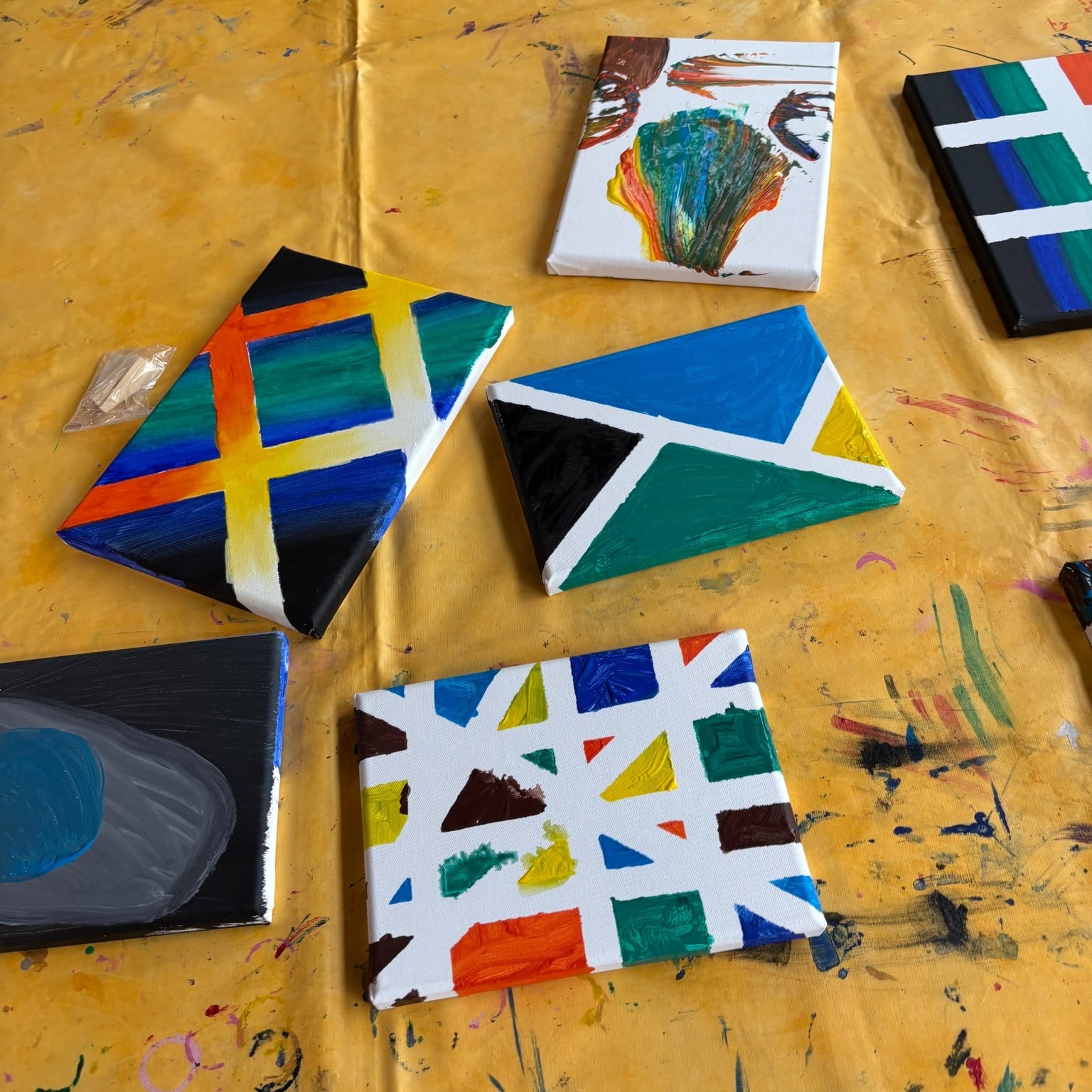 Die Teilnehmenden haben bunte Acrylbilder in verschiedenen Techniken gestaltet. Mit Tape Art kombiniert entstanden geometrische, farbenfrohe Kunstwerke, die ihre ganz eigene Stimmung zeigen. Kreativität, Freude und Experimentierfreude standen dabei im Vordergrund.