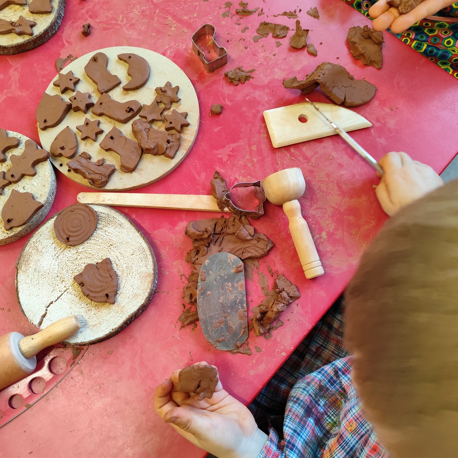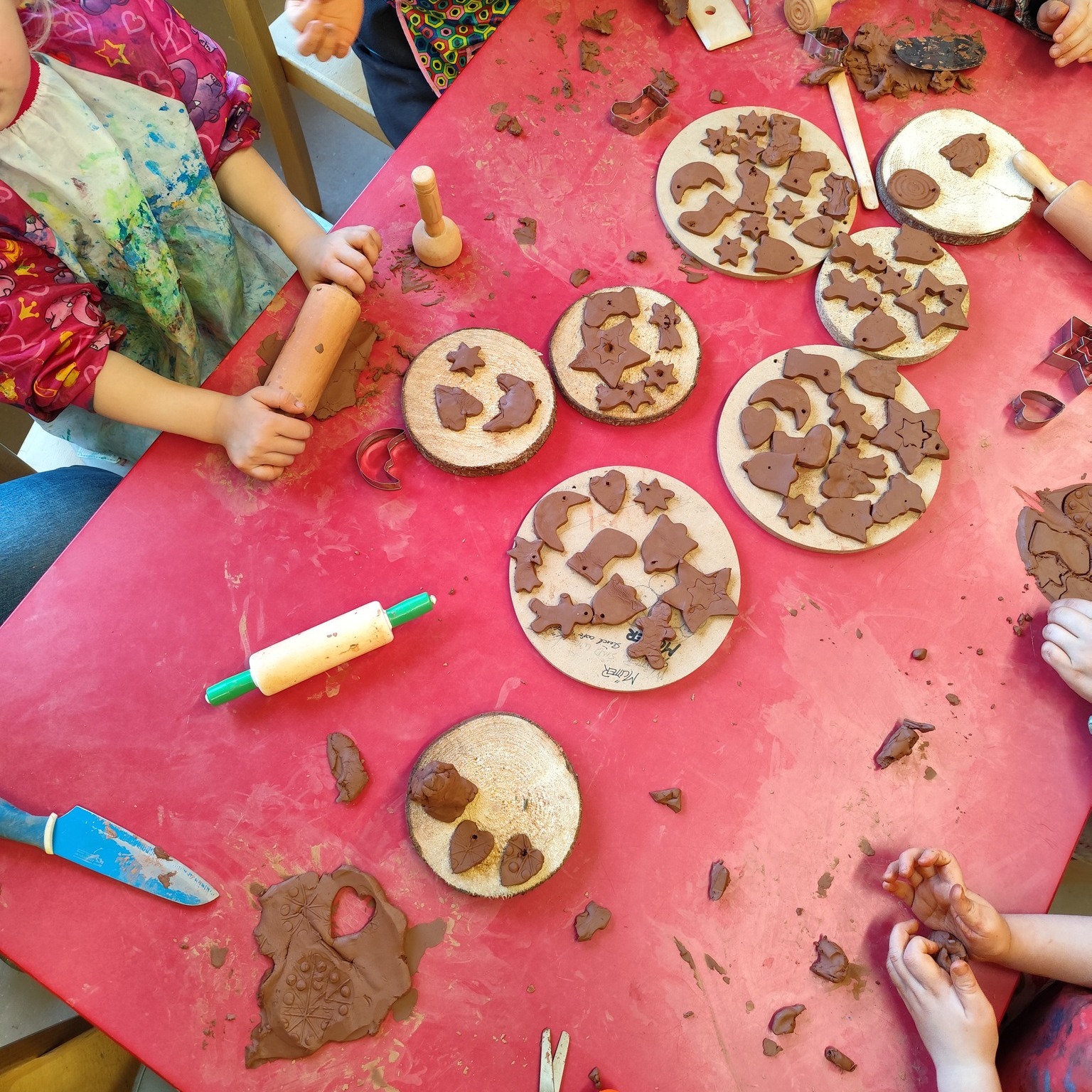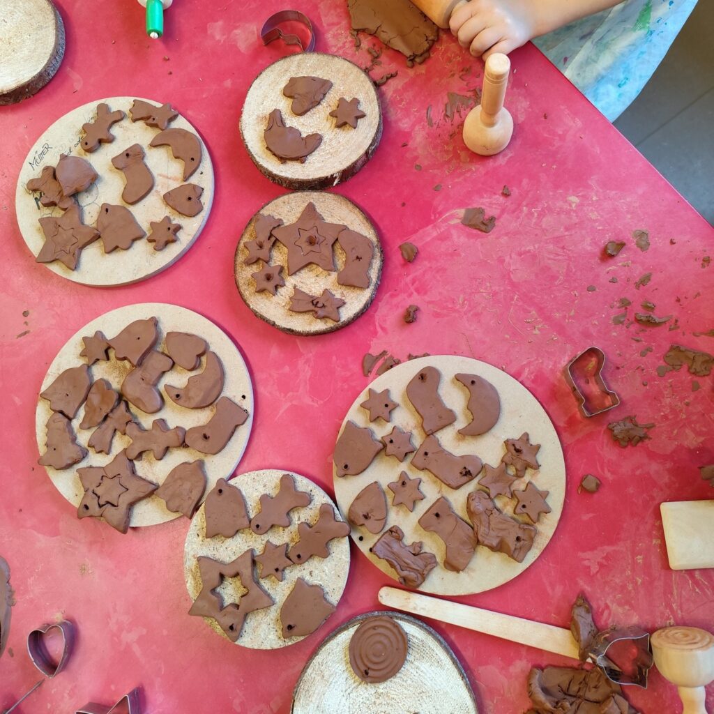 Während die Engobeschichtung auf den Werkstücken noch trocknete, nutzten wir die Zeit kreativ: Gemeinsam mit den Kindern wurden kleine „Plätzchen“ aus Ton ausgestochen. Sterne, Herzen und andere weihnachtliche Motive entstanden dabei mit viel Konzentration und Freude.