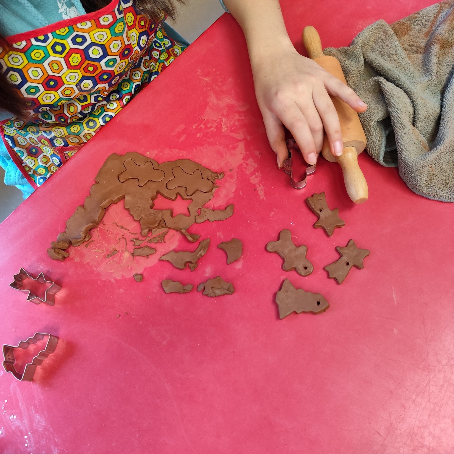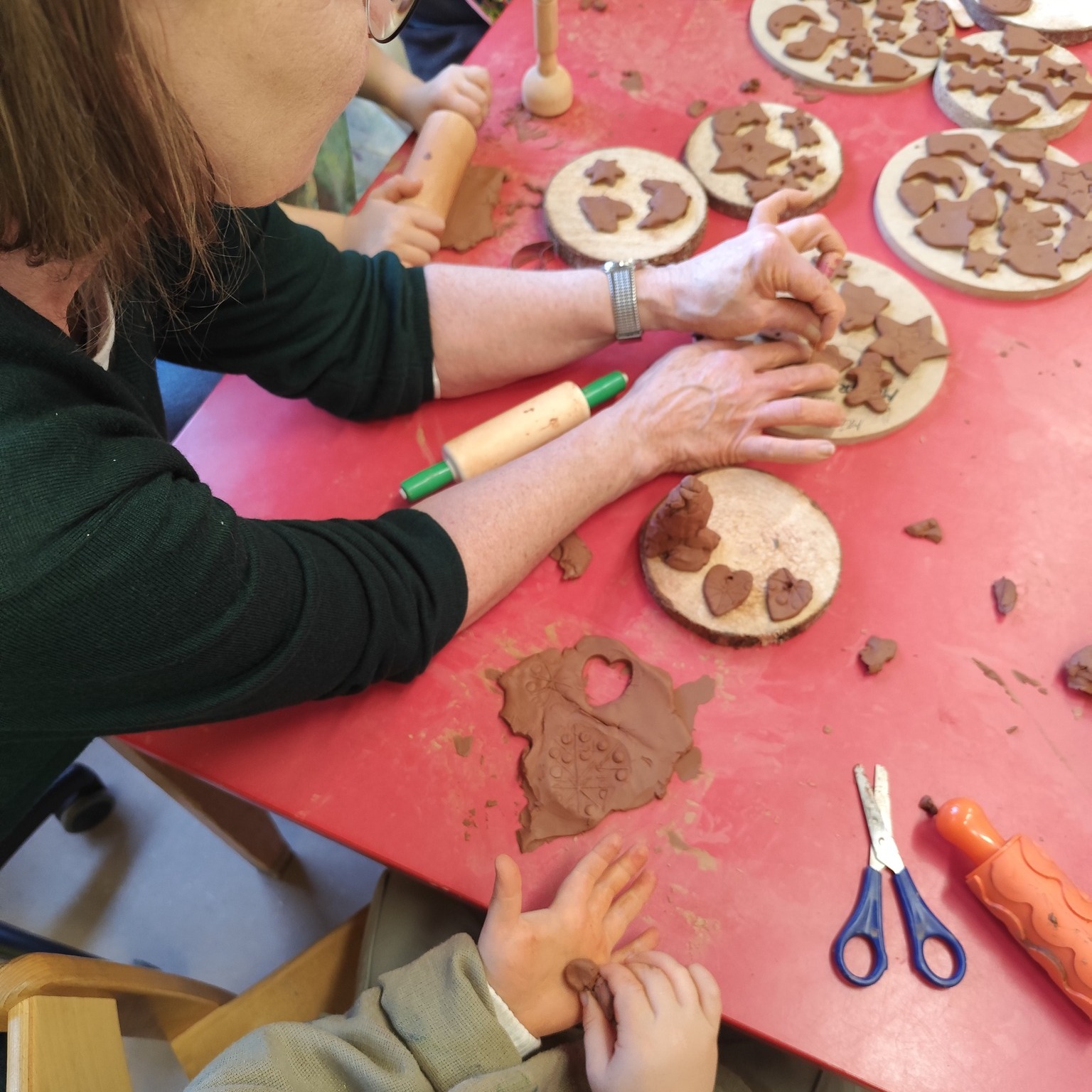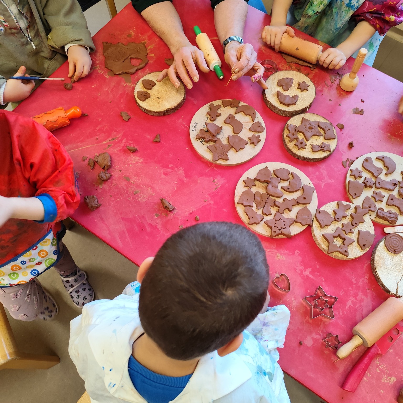 Während die Engobeschichtung auf den Werkstücken noch trocknete, nutzten wir die Zeit kreativ: Gemeinsam mit den Kindern wurden kleine „Plätzchen“ aus Ton ausgestochen. Sterne, Herzen und andere weihnachtliche Motive entstanden dabei mit viel Konzentration und Freude.
