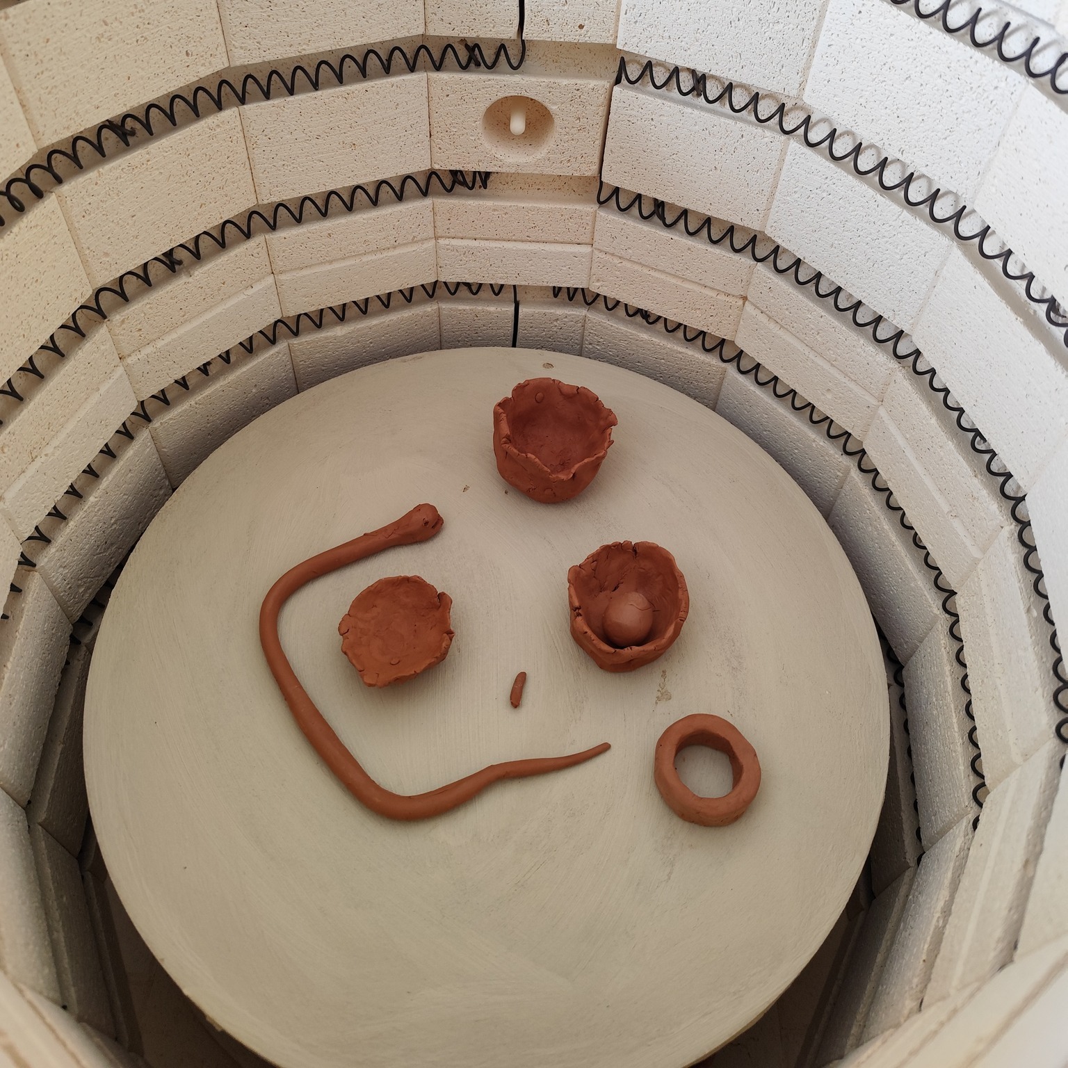 Eigentlich sollte der Ofen bereits für den Glühbrand gestartet werden — doch da die Engoben auf den Brennplatten noch nicht ganz trocken waren, wurde kurzerhand umdisponiert. So wurde aus der Wartezeit eine wunderbare Gelegenheit für ein zusätzliches kreatives Erlebnis.