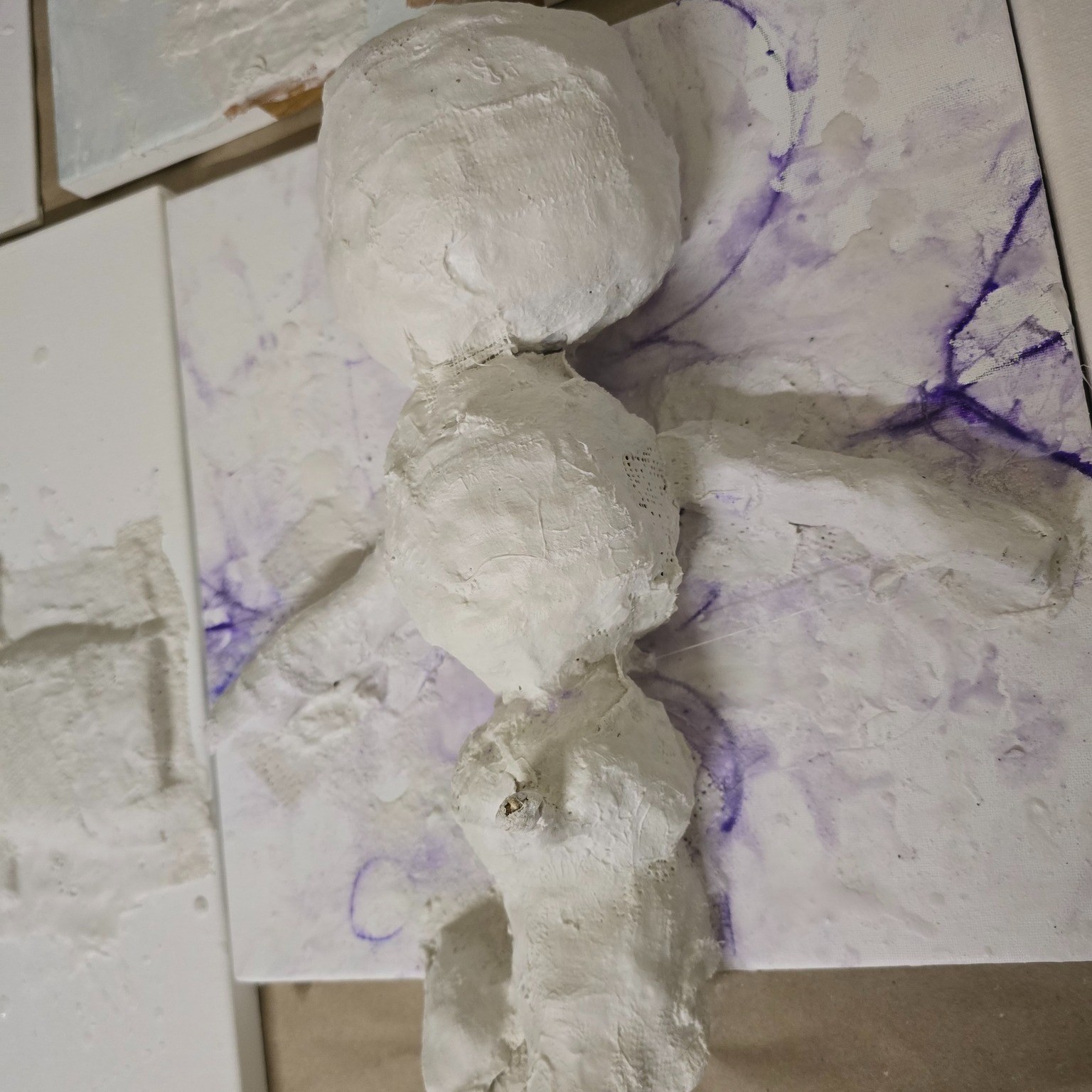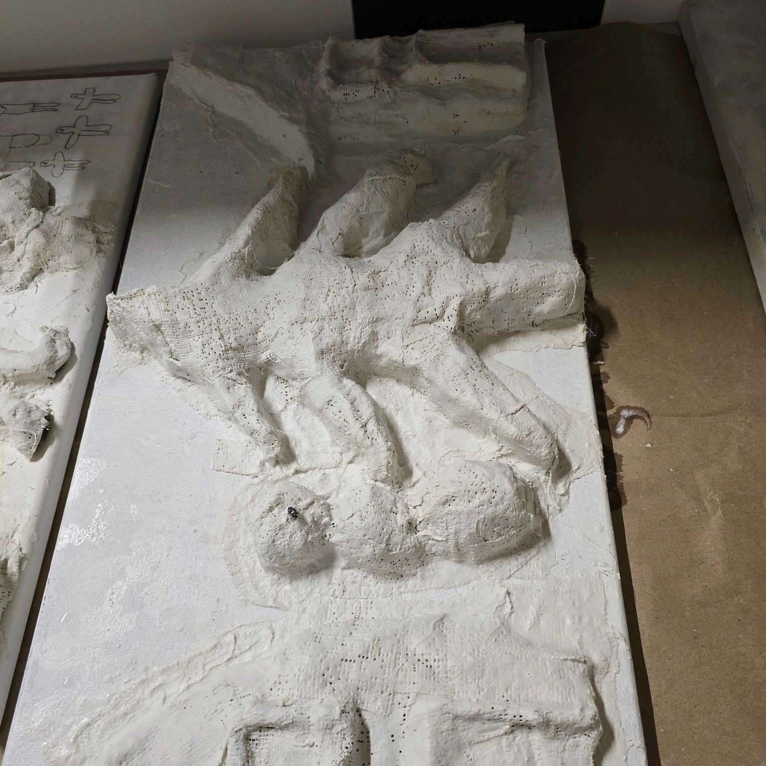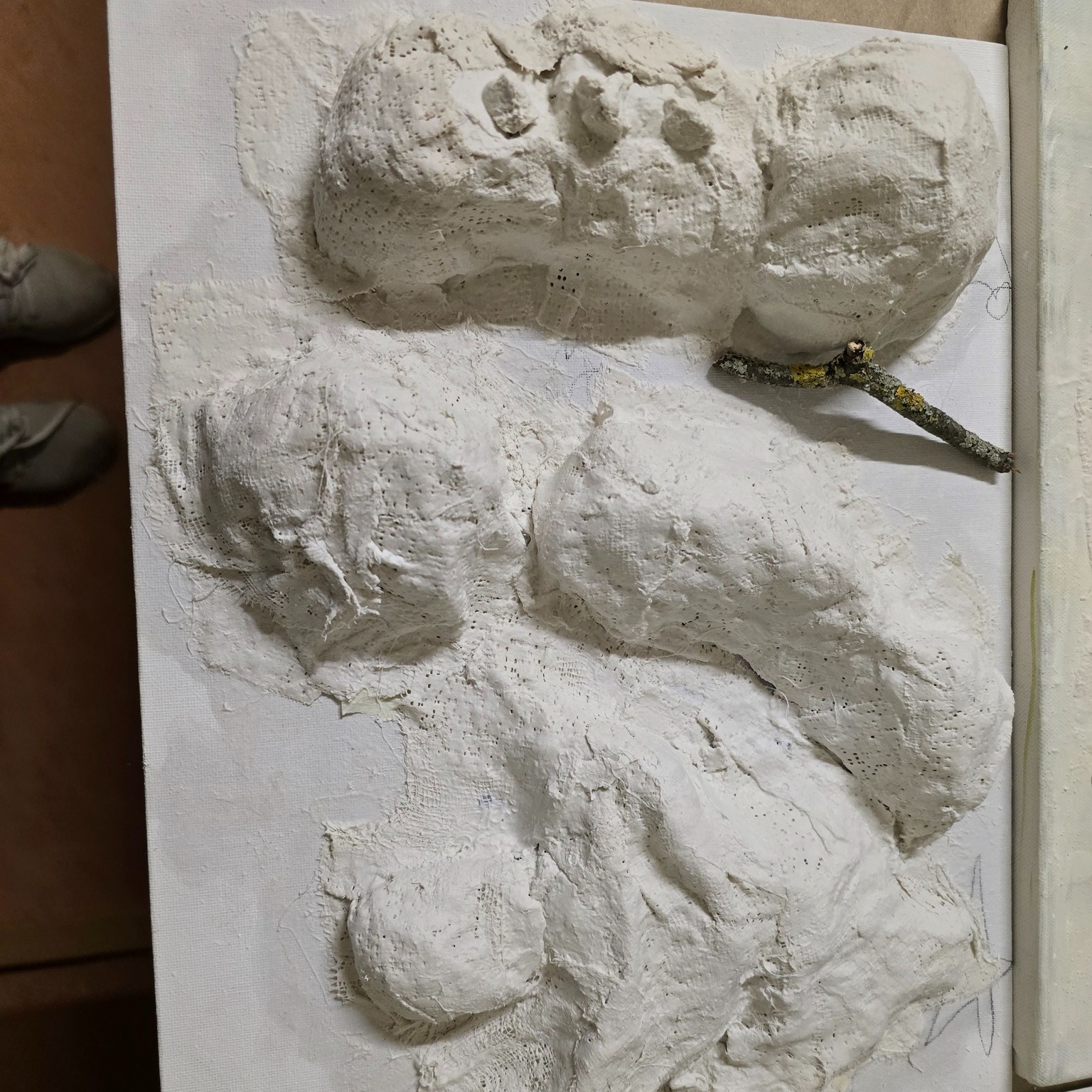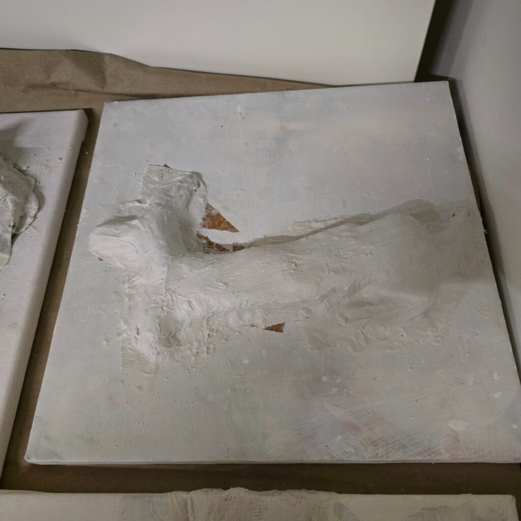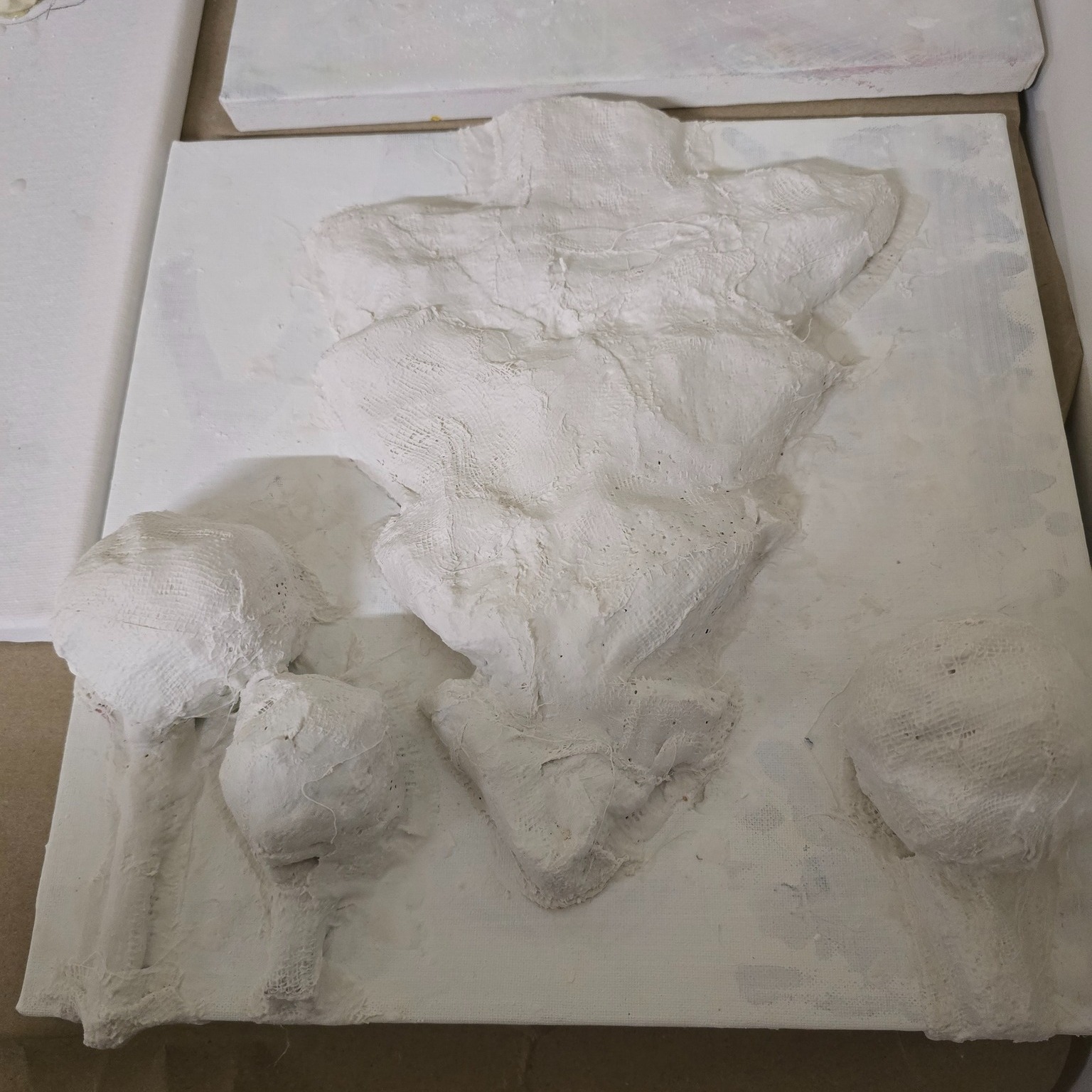 Die Teilnehmenden wählten ihre Leinwände aus und zeichneten zunächst grobe Motive auf. Mit Papier und Klebeband wurden die Motive dann in plastische Formen gebracht und auf der Leinwand befestigt. Anschließend kam eine Schicht Gipsbinden darüber – so konnten die Modelle noch weiter ausgearbeitet werden.