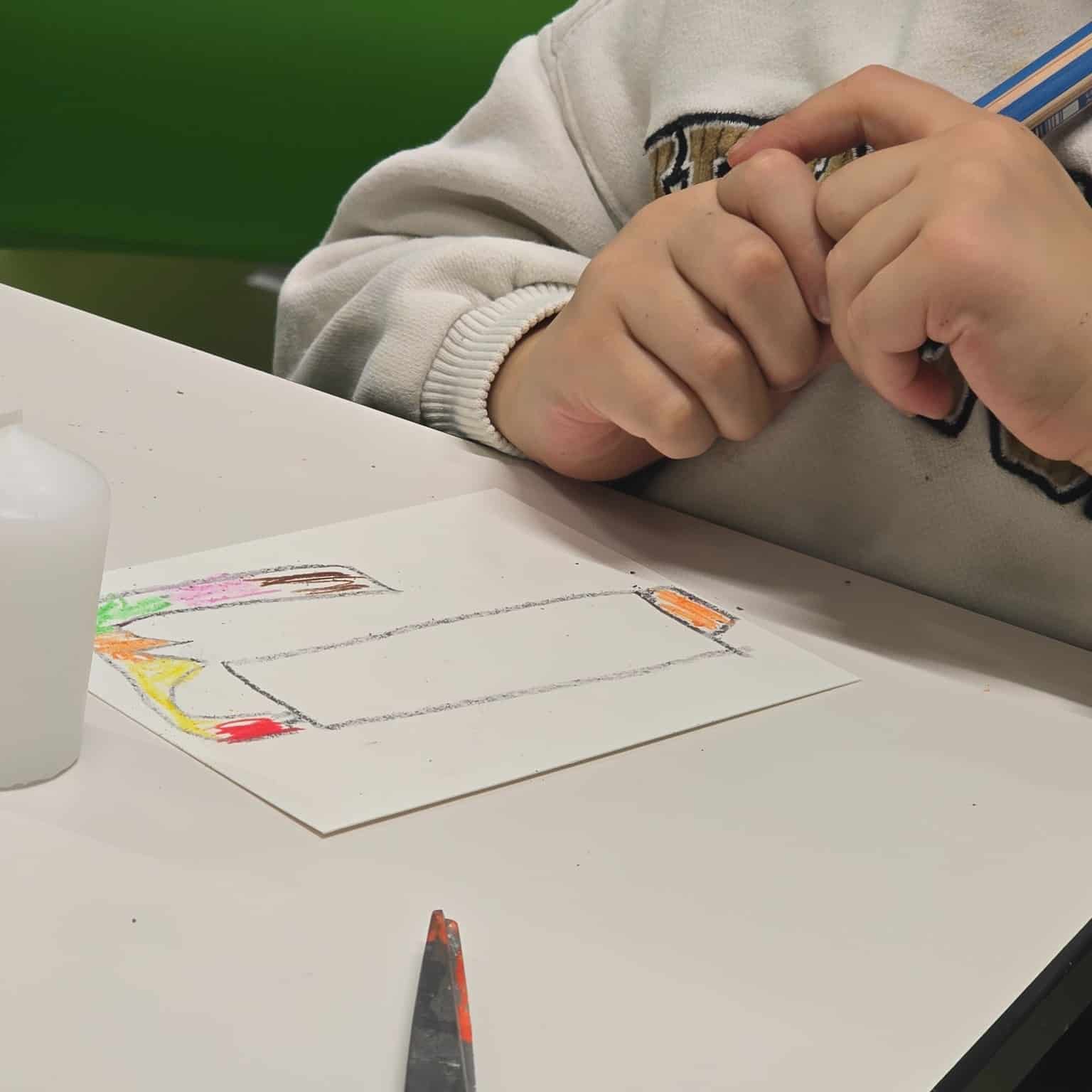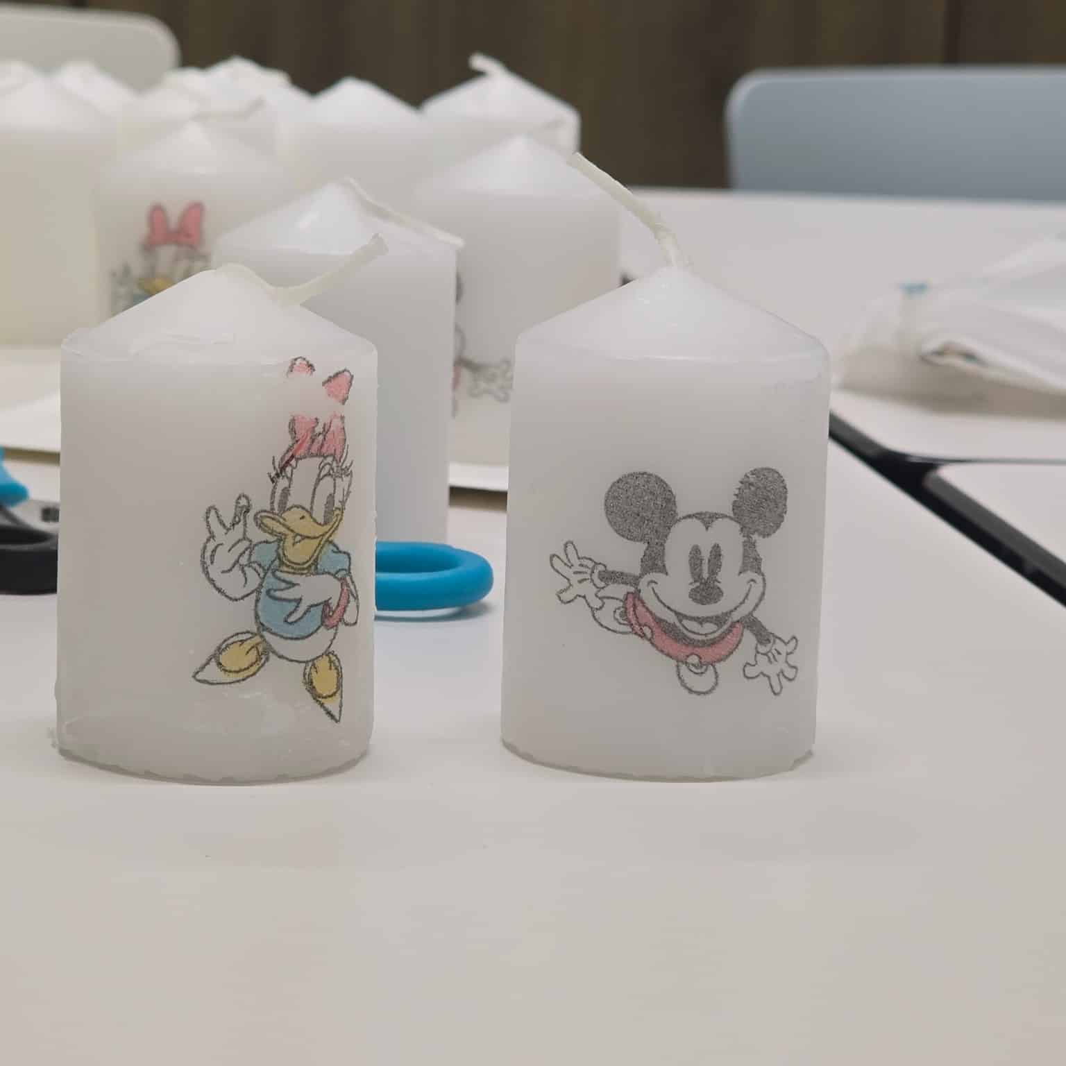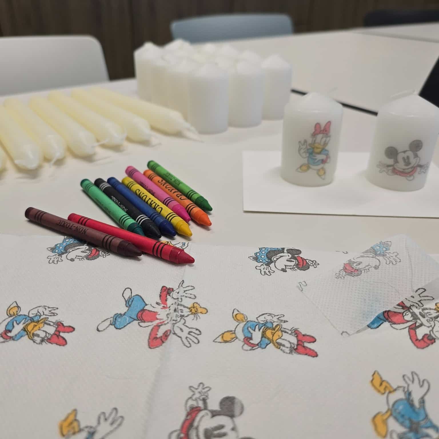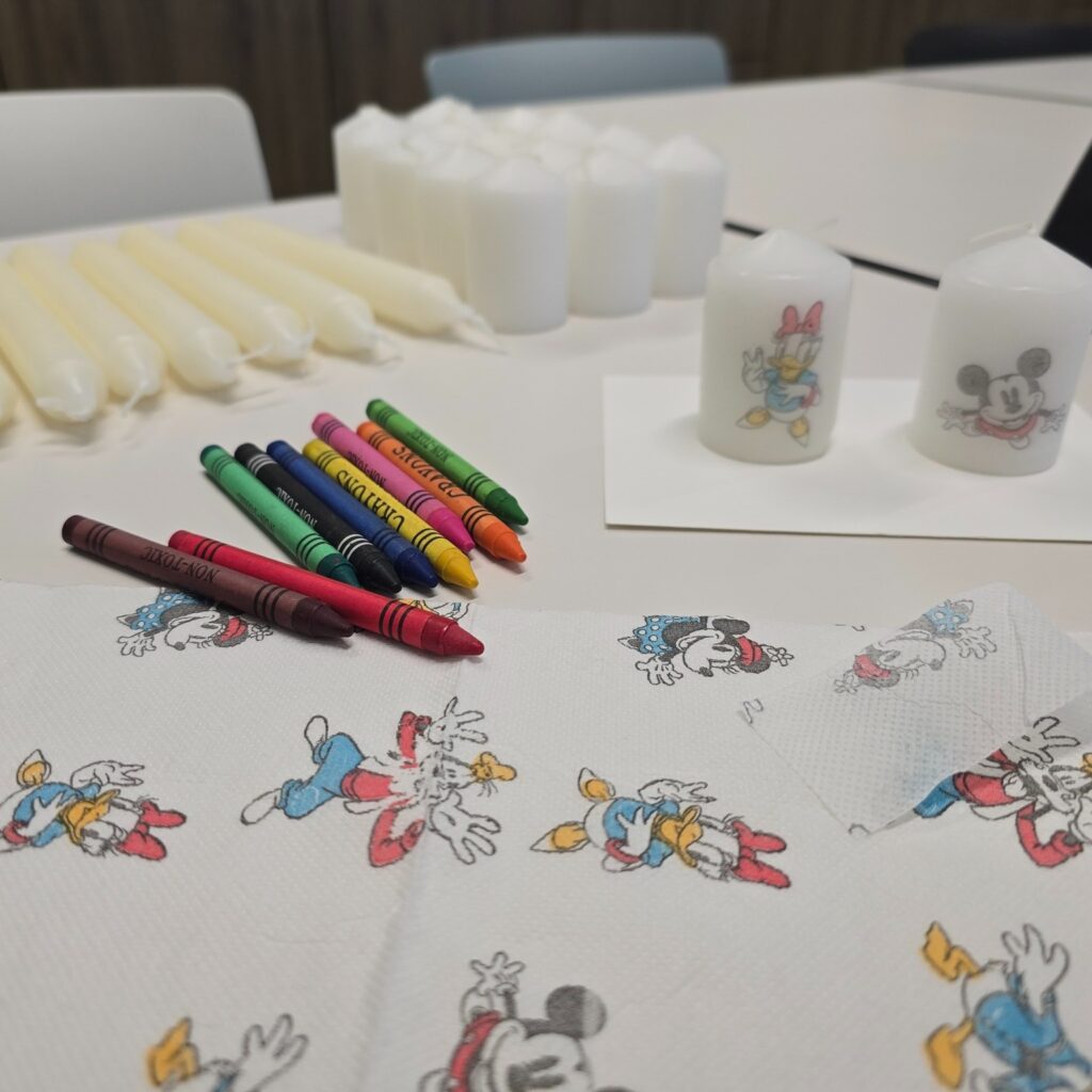 Mit Kerzen, Servietten, Fön, Schere und etwas Geduld entstanden zauberhafte eigene Kerzen! ✨ Die Kinder schnitten oder rissen die Motive aus, entfernten überschüssige Schichten, platzierten sie auf der Kerze, legten Backpapier darauf und fixierten alles vorsichtig mit dem Fön. Besonders spannend war für die Kids, wie Serviette und Kerze „verschmolzen“ und das Motiv lebendig wurde.