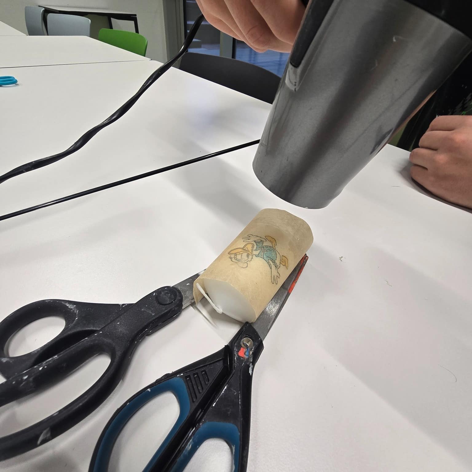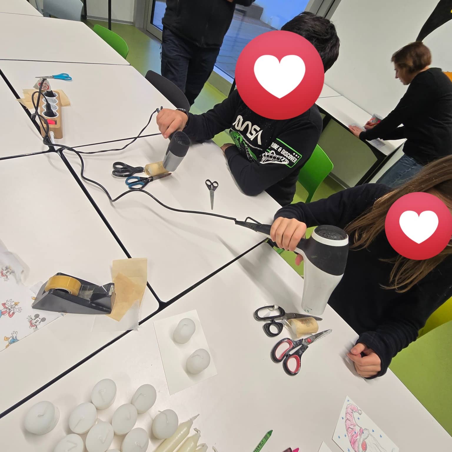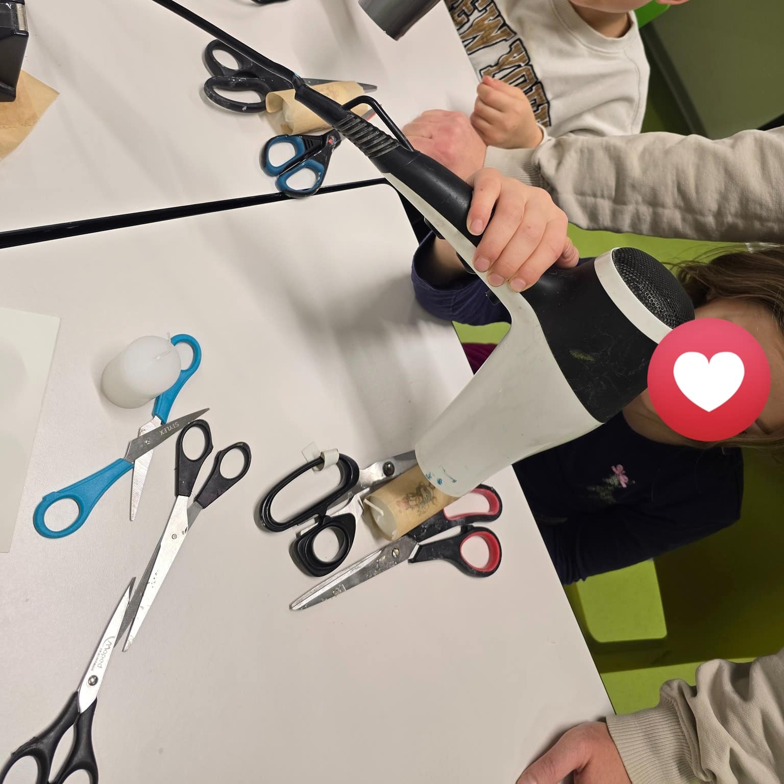 Mit Kerzen, Servietten, Fön, Schere und etwas Geduld entstanden zauberhafte eigene Kerzen! ✨ Die Kinder schnitten oder rissen die Motive aus, entfernten überschüssige Schichten, platzierten sie auf der Kerze, legten Backpapier darauf und fixierten alles vorsichtig mit dem Fön. Besonders spannend war für die Kids, wie Serviette und Kerze „verschmolzen“ und das Motiv lebendig wurde.