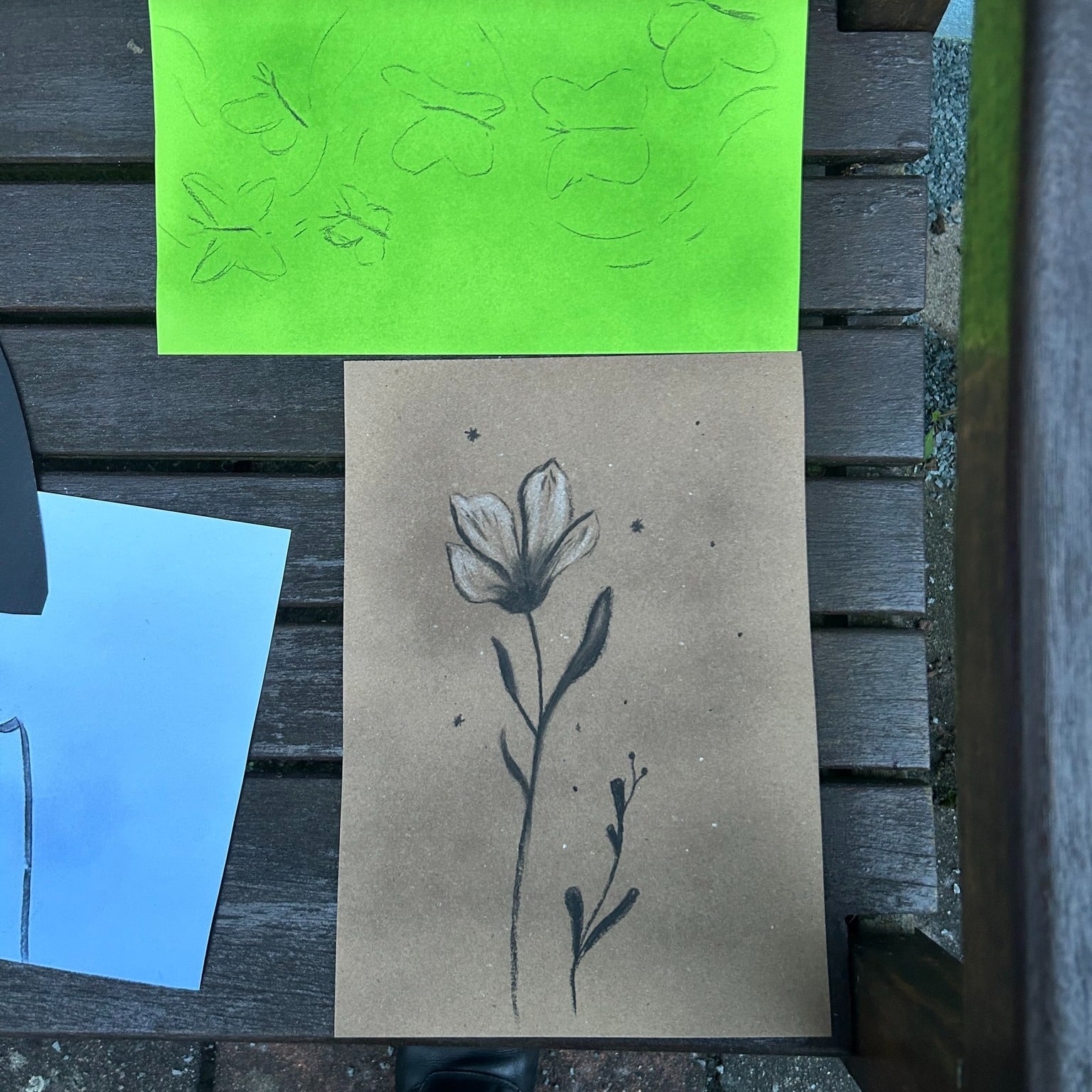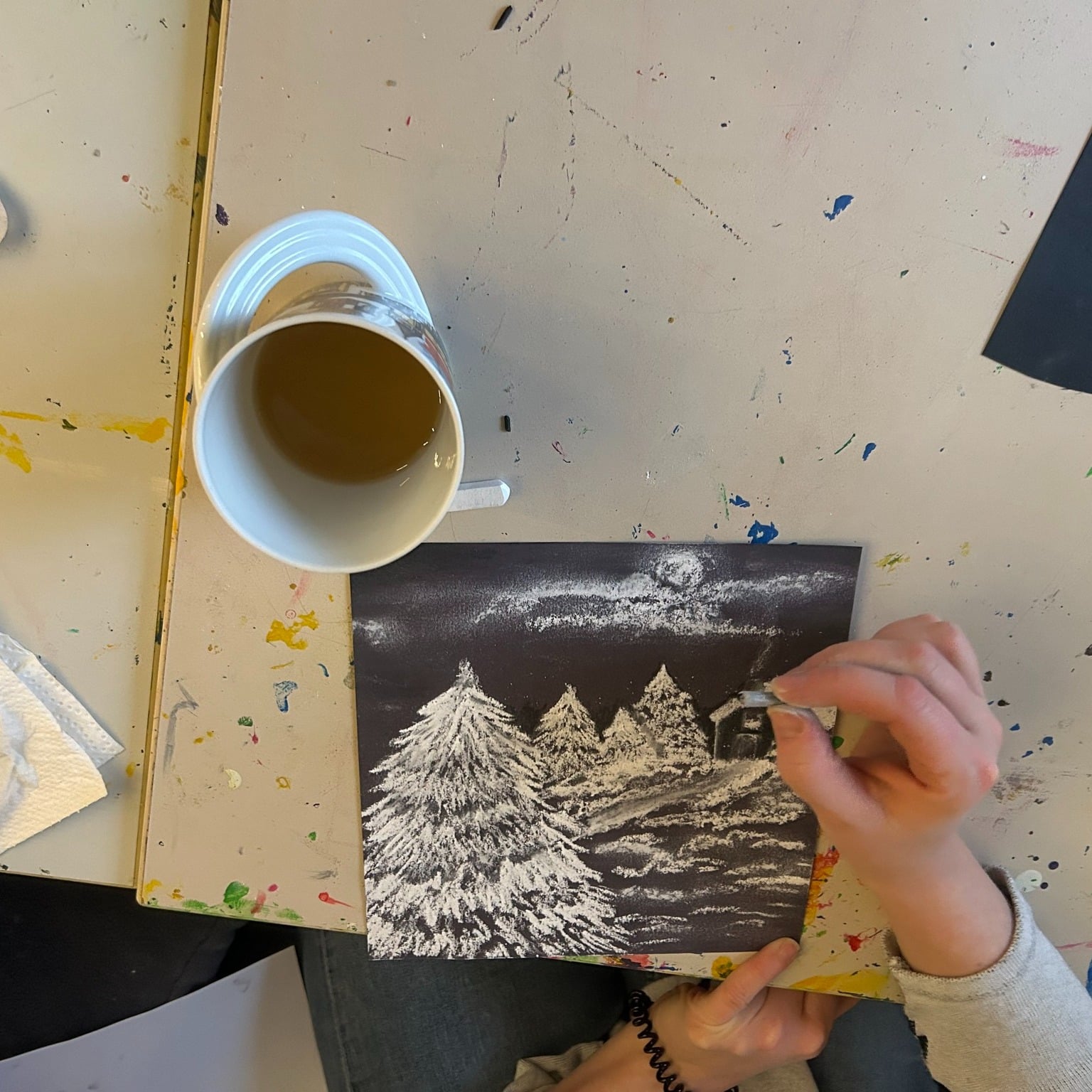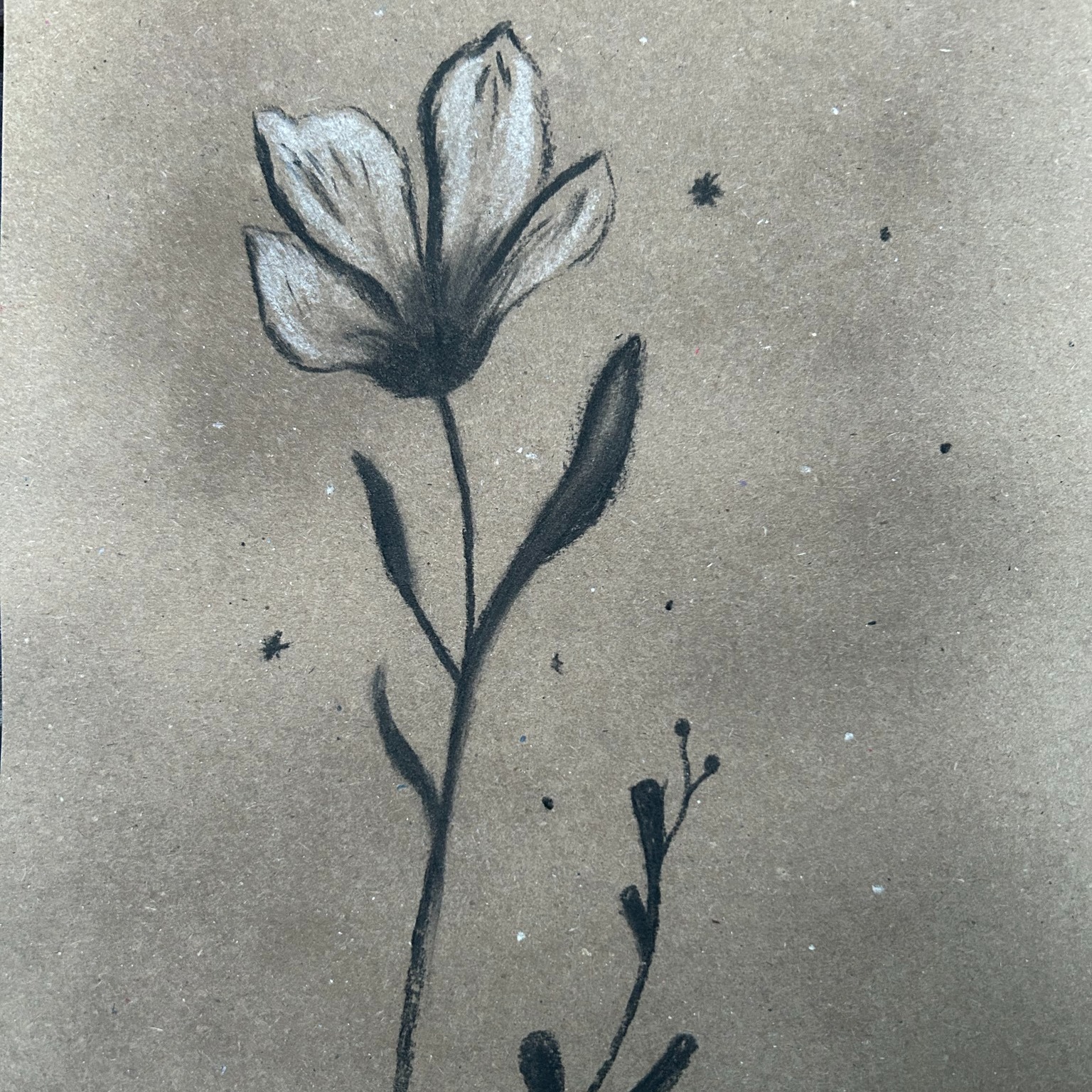 Die Teilnehmenden experimentierten mit Kohle und weißer Kreide auf farbigem Papier und erschufen viele verschiedenste Motive ob nun winterliche, blumige und auch abstrakte Motive. ❄️🌸 Außerdem wurden freie Papierformen geschnitten und die Konturen kreativ umgesetzt. So entstanden kleine, individuelle Kunstwerke voller Ausdruckskraft und Fantasie.
