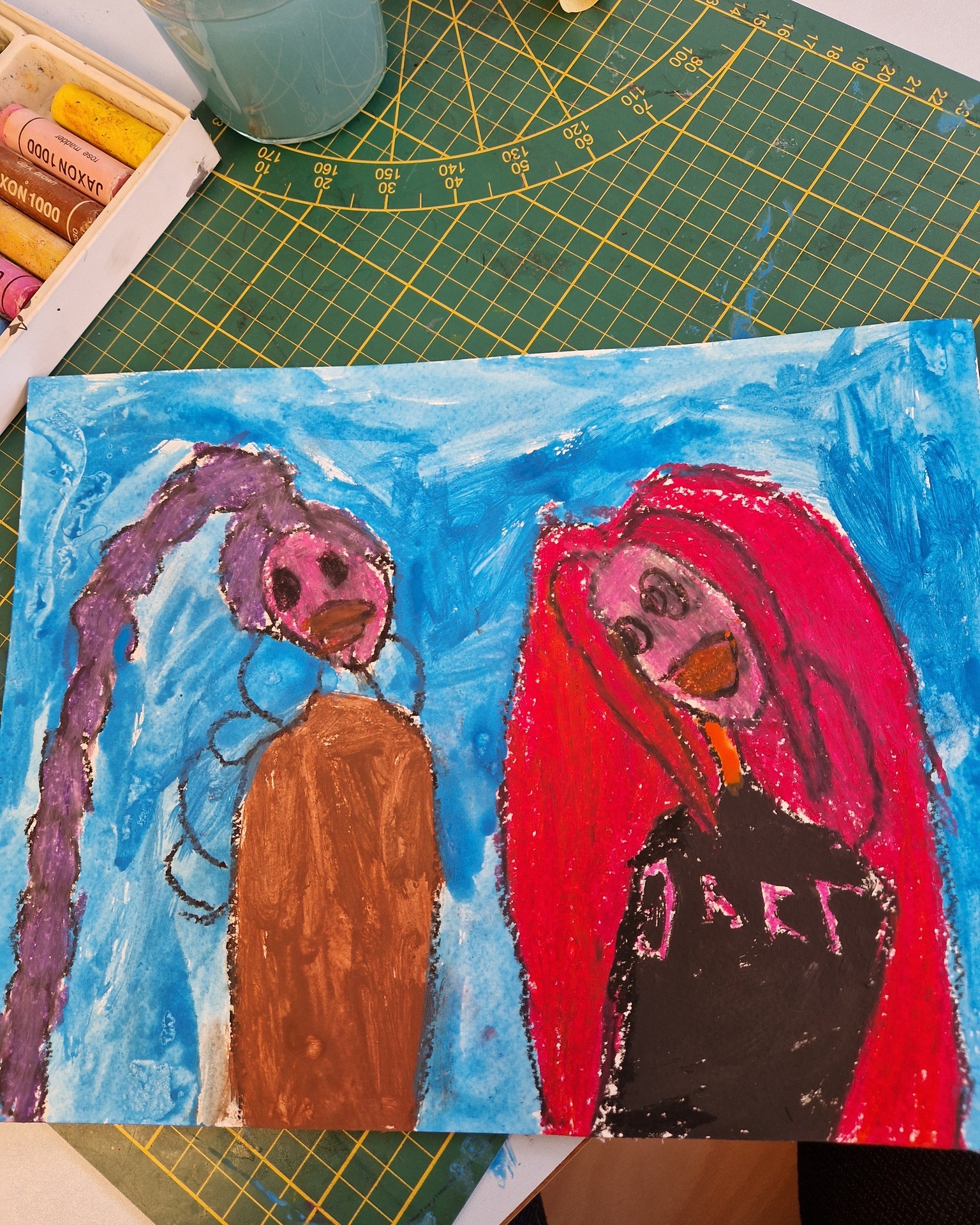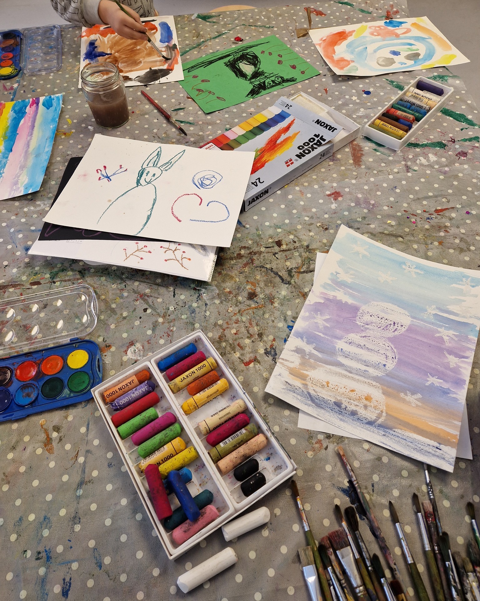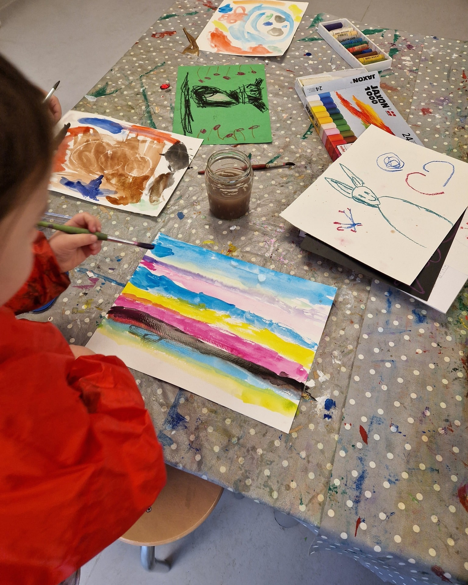 In Hohenberg wurde mit Ölpastellkreiden und Wasserfarben gearbeitet. Die Kinder wählten ihre Motive frei und probierten verschiedene Kombinationen aus.